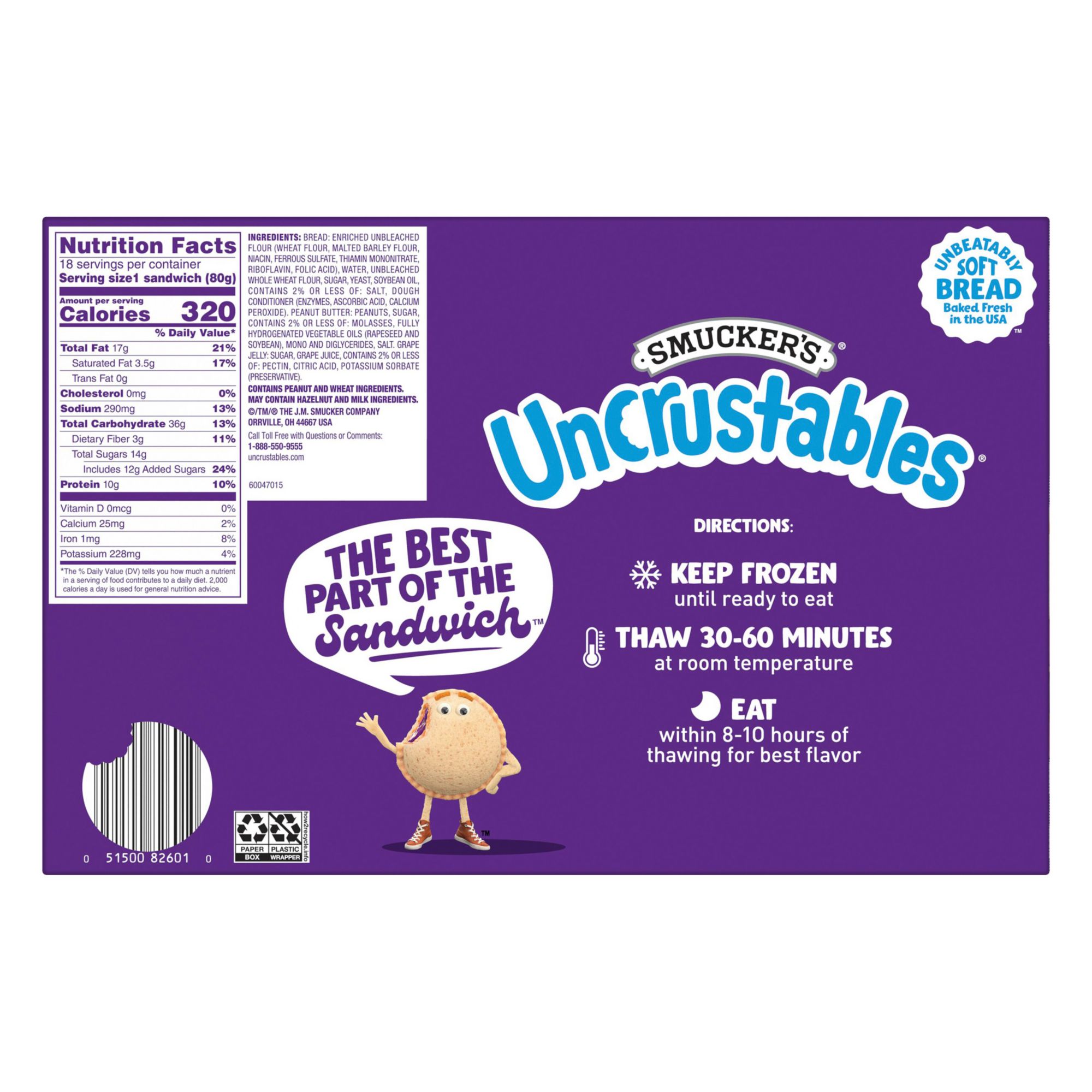 Contains 1 Box of 18 - 2.8 Ounce Smucker's Uncrustables Peanut Butter and Grape Jelly Individually Wrapped Sandwiches (18 Count Total)