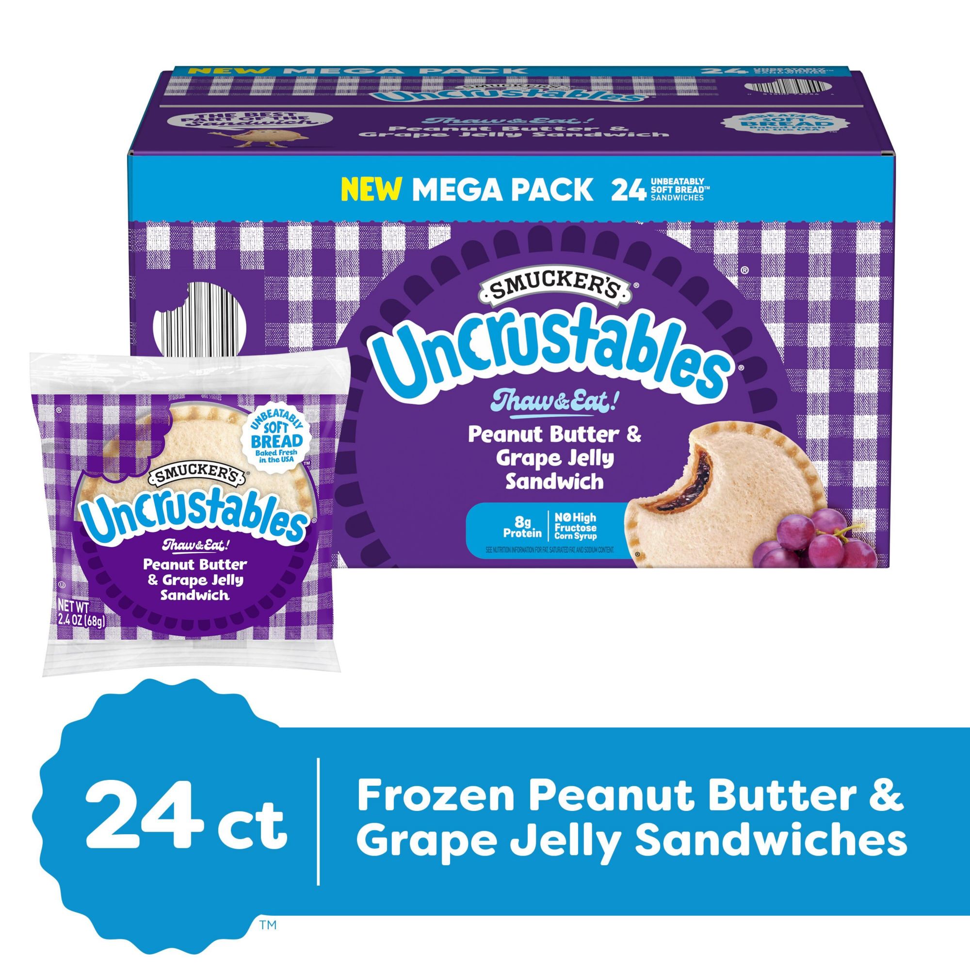 Smucker's Uncrustables Peanut Butter & Grape Jelly Sandwiches, Mega Pack, Frozen, 24 ct./2.4 oz.