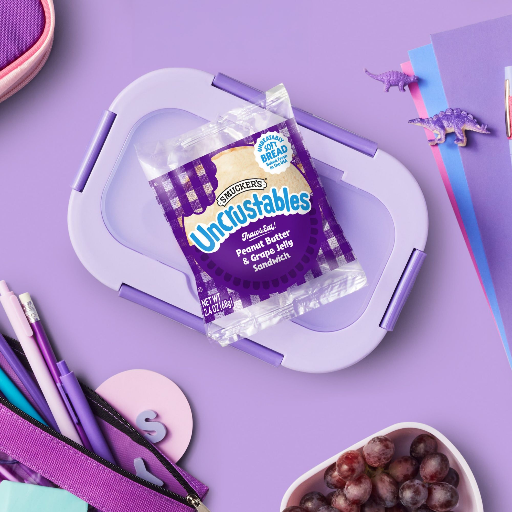 Make busy days a breeze with Smucker’s Uncrustables frozen sandwiches — the easiest kid-approved snack and lunch food ever. This box contains twenty-four (24) individually wrapped sandwiches, so you’ll have plenty to toss in a bag whenever you need an on-the-go snack or lunch. Just grab one from the freezer in the morning, and it's thawed and ready by lunchtime. No fuss. No crust. It’s always The Best Part of the Sandwich, with the yummiest tastes and textures. The outside of an Uncrustables Peanut Butter & Grape Jelly Sandwich is Unbeatably Soft Bread Baked Fresh in the USA, and the inside is packed with creamy peanut butter and smooth, sweet grape jelly. An unbeatable combo, with no high-fructose corn syrup, and no artificial sweeteners or colors. Basically, these super-convenient snacks and lunch foods provide the ultimate PB&J experience. Try ’em all! There’s a kid-friendly flavor for every day of the school week.