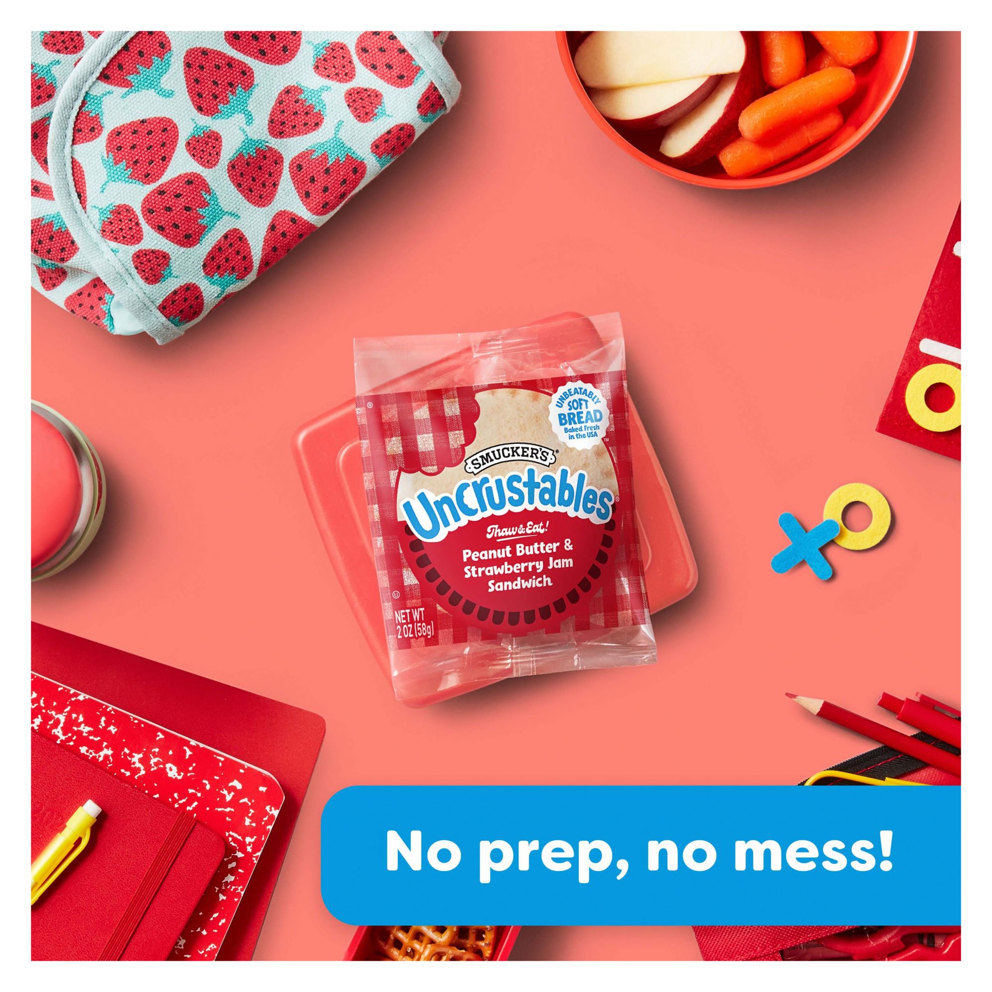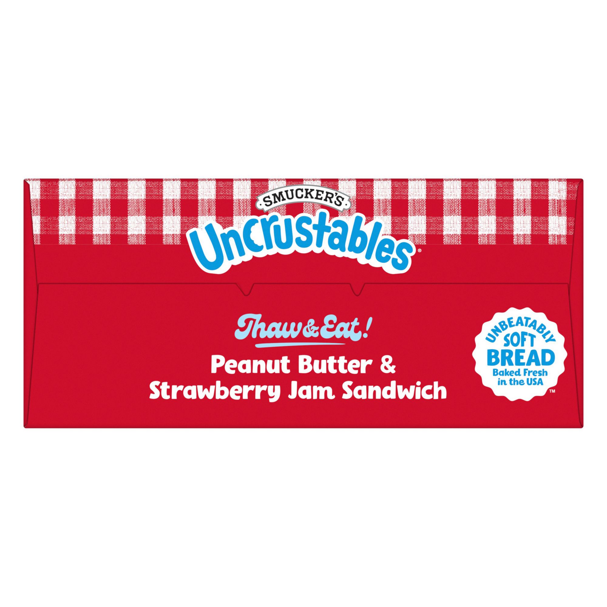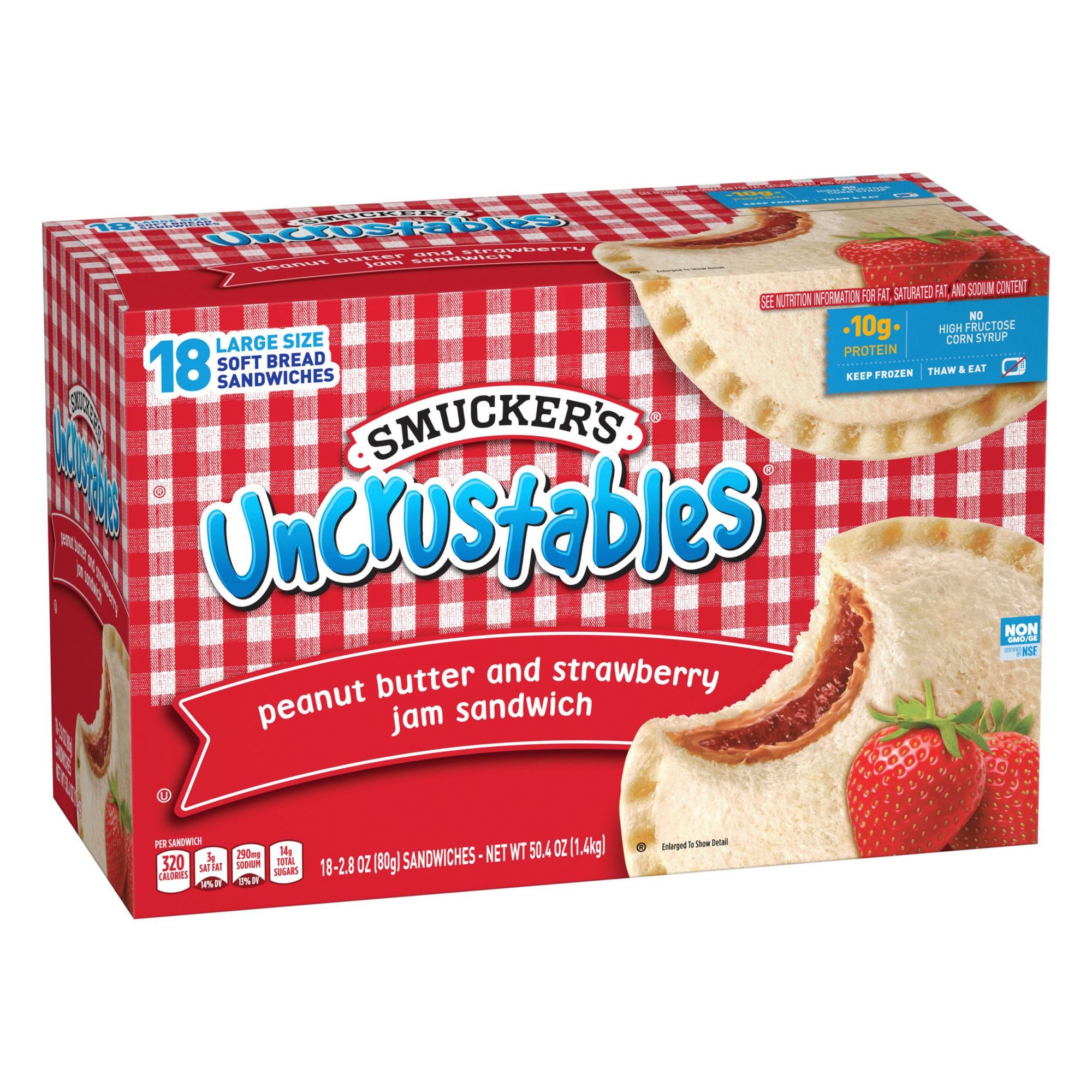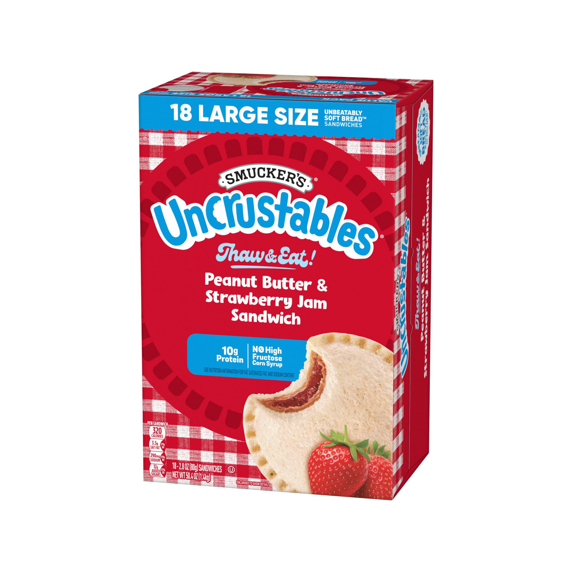 Just thaw, unwrap, and snack wherever you are. Uncrustables Peanut Butter and Strawberry Jam Sandwiches are a convenient, packable snack to take along wherever you and your kids are going next. These single serve sandwiches are individually wrapped for anytime snacking and have 6 grams (5% DV) of protein per serving (See nutrition information for fat, saturated fat, and sodium content). These frozen grab-and-go sandwiches taste great and are full of peanut butter and strawberry jam flavor. For a taste of home, kids and adults alike can simply grab an Uncrustables Peanut Butter and Strawberry Jam Sandwich to thaw and eat on-the-go. The convenient sandwich packs are great for lunch breaks, carpool rides, trips to and from baseball practice, and so much more. They have no high fructose corn syrup, so go ahead and keep a couple boxes stocked in the freezer for when any snack time situation hits.