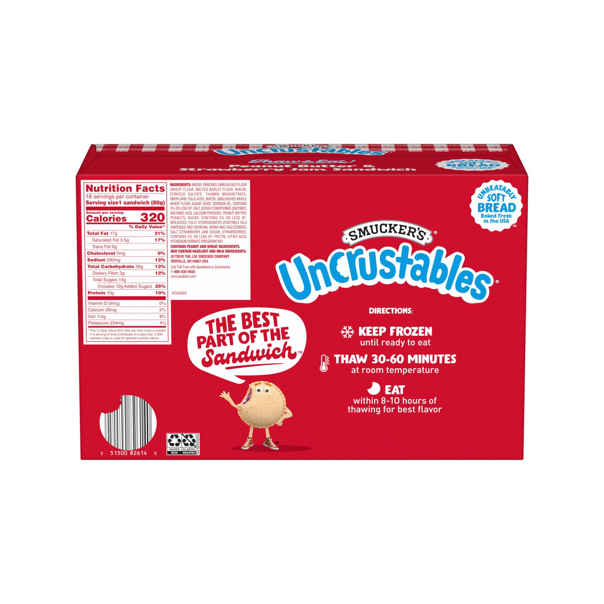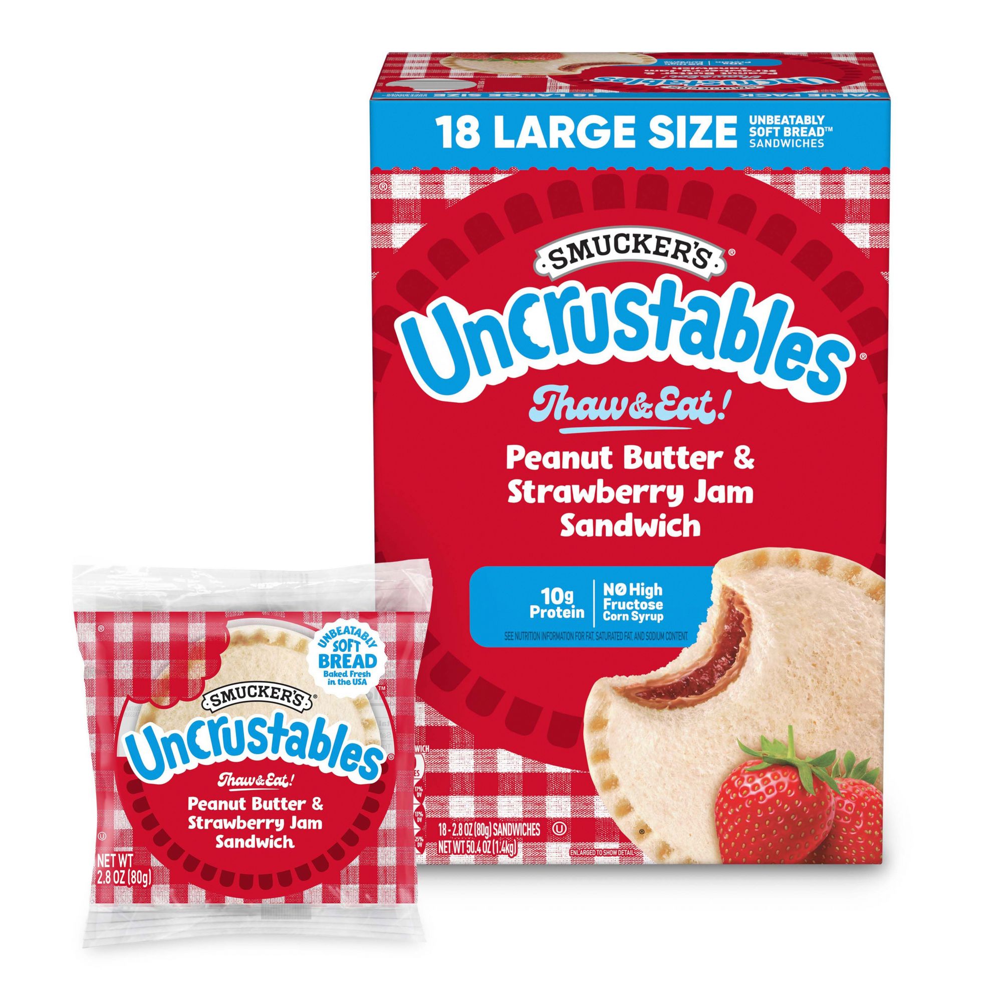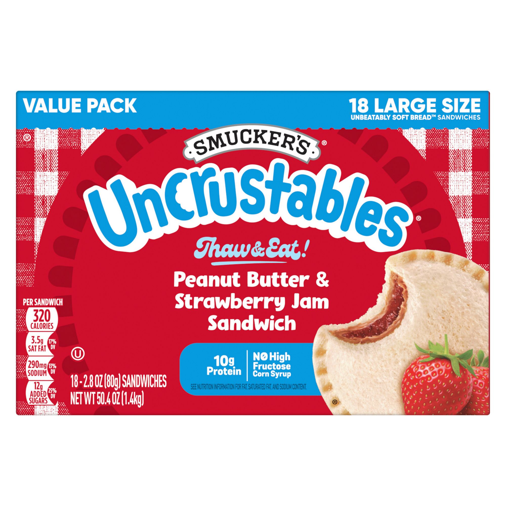 Contains one box of 18, 2.8 oz. Smucker's Uncrustables Peanut Butter and Strawberry Jam Individually Wrapped Sandwiches (18 count total)