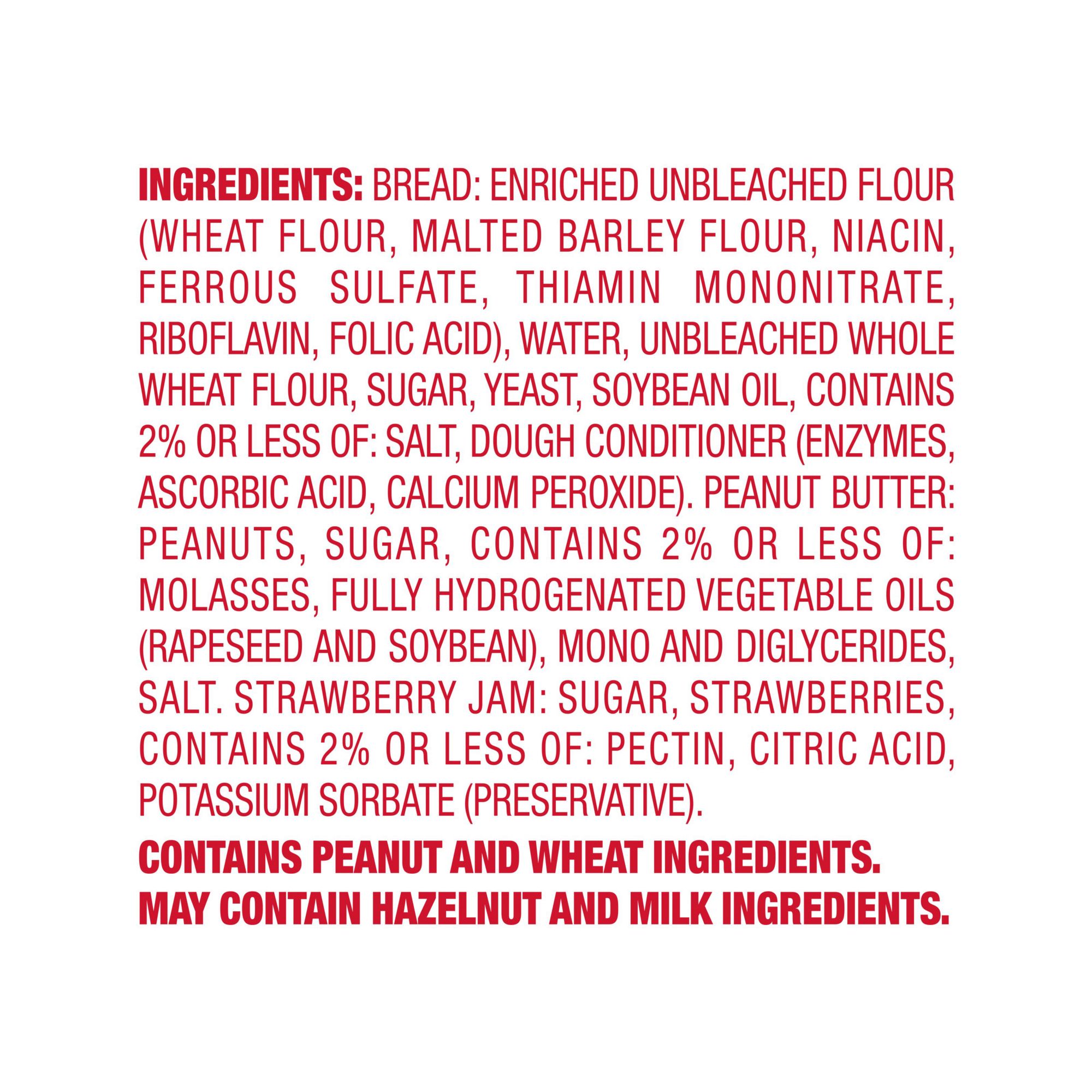 Ingredients: Bread: Enriched Unbleached Flour (Wheat Flour, Malted Barley Flour, Niacin, Ferrous Sulfate, Thiamin Mononitrate, Riboflavin, Folic Acid), Water, Unbleached Whole Wheat Flour, Sugar, Yeast, Soybean Oil, Contains 2% or Less of: Salt, Dough Conditioners (Distilled Mono and Diglycerides, DATEM, Enzymes [with Wheat Starch, Ascorbic Acid, Calcium Peroxide]), Peanut Butter: Peanuts, Sugar, Contains 2% or Less of: Molasses, Fully Hydrogenated Vegetable Oils (Rapeseed and Soybean), Mono and Diglycerides, Salt, Strawberry Jam: Sugar, Strawberries, Contains 2% or Less of: Pectin, Citric Acid, Potassium Sorbate (Preservative).