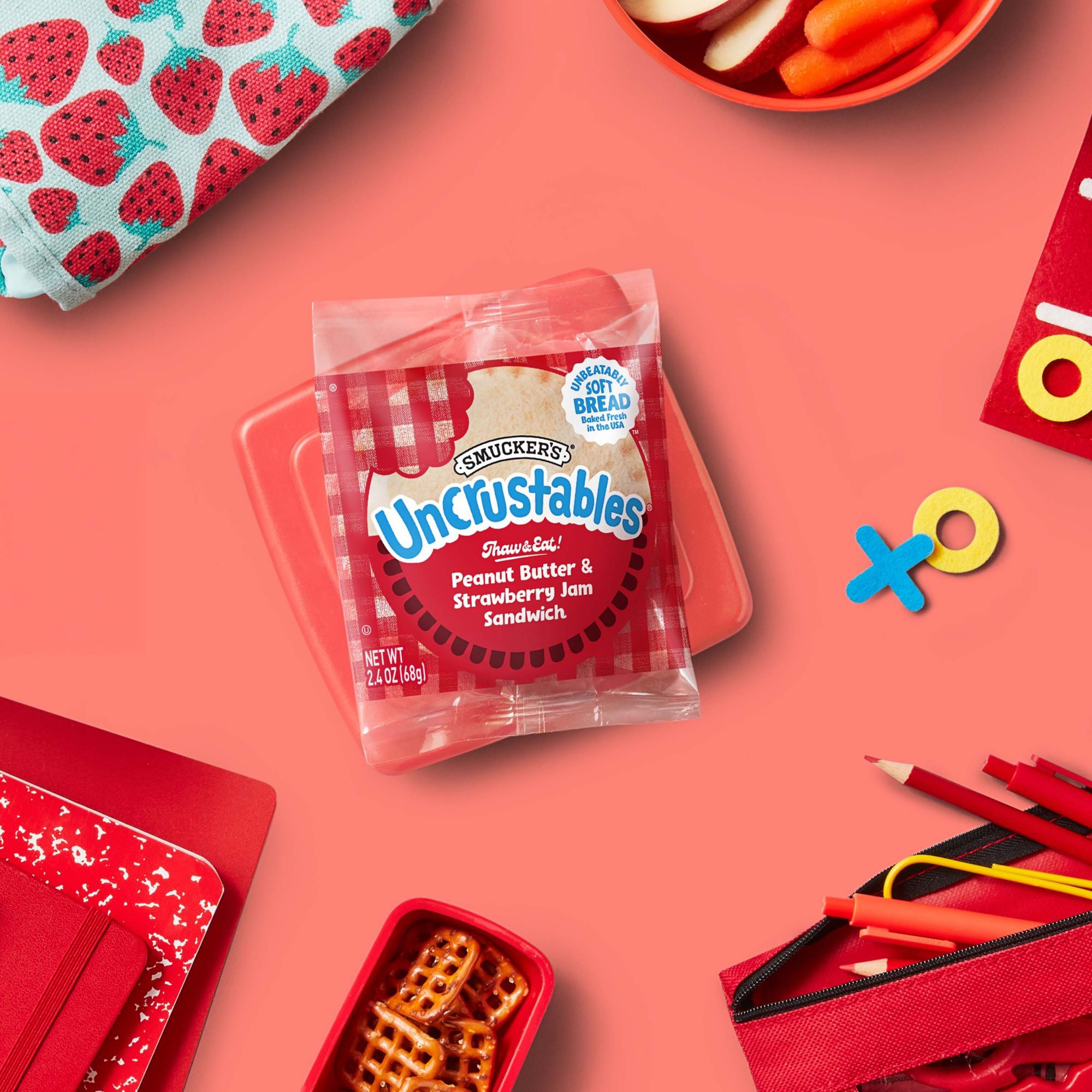 Make busy days a breeze with Smucker’s Uncrustables frozen sandwiches — the easiest kid-approved snack and lunch food ever. This box contains twenty-four (24) individually wrapped sandwiches, so you’ll have plenty to toss in a bag whenever you need an on-the-go snack or lunch. Just grab one from the freezer in the morning, and it's thawed and ready by lunchtime. No fuss. No crust. It’s always The Best Part of the Sandwich, with the yummiest tastes and textures. The outside of an Uncrustables Peanut Butter & Strawberry Jam Sandwich is Unbeatably Soft Bread Baked Fresh in the USA, and the inside is packed with creamy peanut butter and smooth, sweet strawberry jam. An unbeatable combo, with no high-fructose corn syrup, and no artificial sweeteners or colors. Basically, these super-convenient snacks and lunch foods provide the ultimate PB&J experience. Try ’em all! There’s a kid-friendly flavor for every day of the school week.