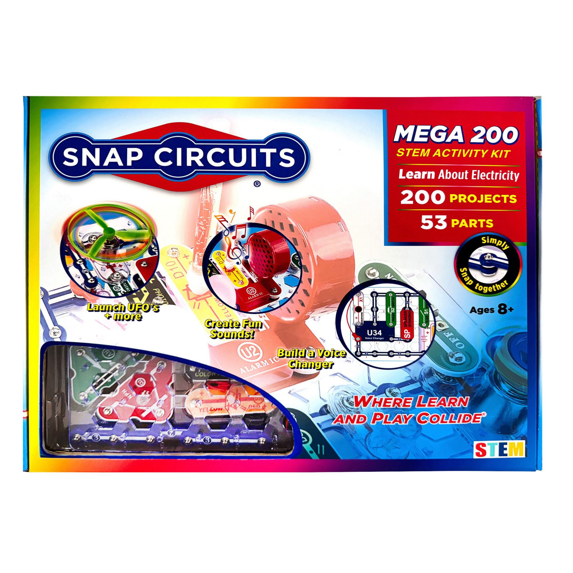 The ultimate STEM toy. Create dozens of awesome electronic gadgets – all with just one box. The Snap Circuits Mega 200 STEM Activity Kit is the ultimate way to dive into the world of STEM. Perfect for curious minds ages eight and up, this kit lets you build exciting projects and cool toys with a colorful instruction book to guide the way.