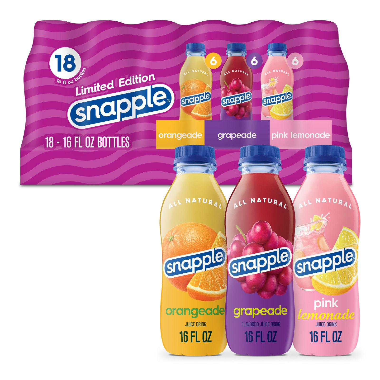 What's inside: Six 16-ounce plastic bottles each of Snapple Grapeade, Snapple Orangeade, and Snapple Pink Lemonade.