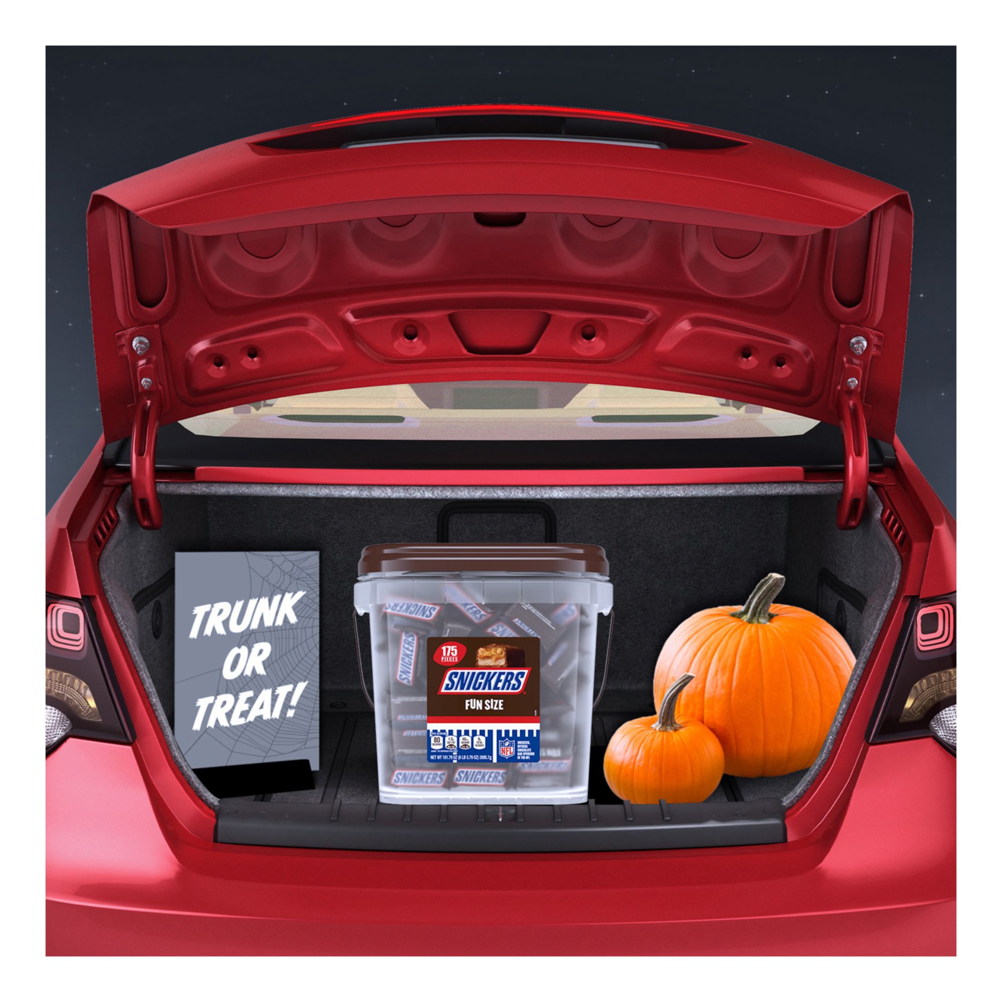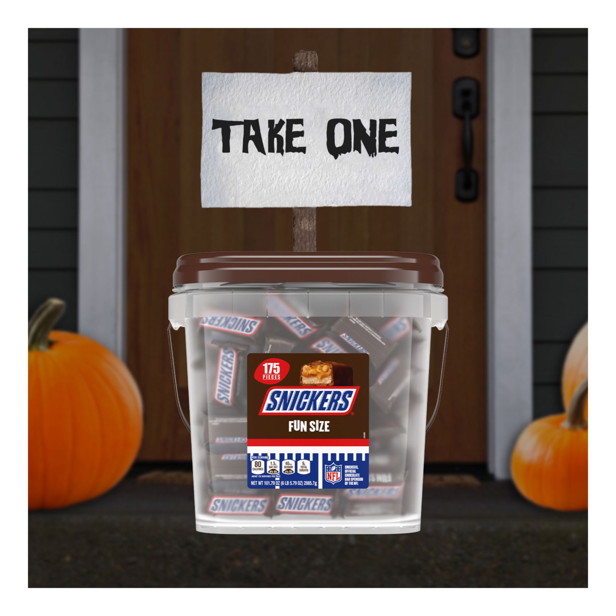 Halloween It Like You Mean It! SNICK-or-Treat with this 12-pound giant container of delicious Snickers Fun Size Halloween Candy Bars. Nothing screams trick or treat like a 350-piece bulk candy container of Snickers Fun Size chocolate bars. From filling trick or treat bags to decorating ghoulish baked desserts, to a family scary Halloween movie night, Snickers will make you the Best House on The Block in no time. Loaded with roasted peanuts, nougat, caramel, and milk chocolate, let this resealable bucket of individually wrapped fun size chocolate bars kick up the scare factor this Halloween. Don't make the rookie mistake and forget to enjoy a Snickers bar as a sweet reward for crossing off your Halloween task list. Stock up on satisfaction this Halloween and order our brand NEW giant tube of Snickers Fun Size Halloween Candy Chocolate Bars Pack for pick up, curbside, or delivery.