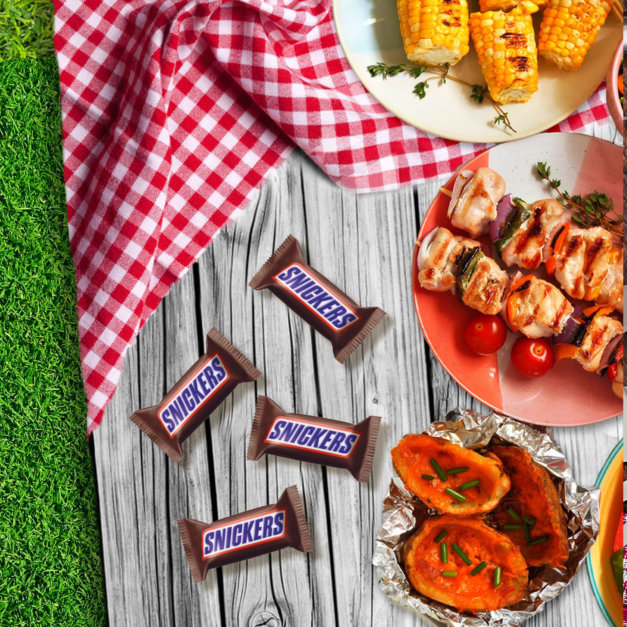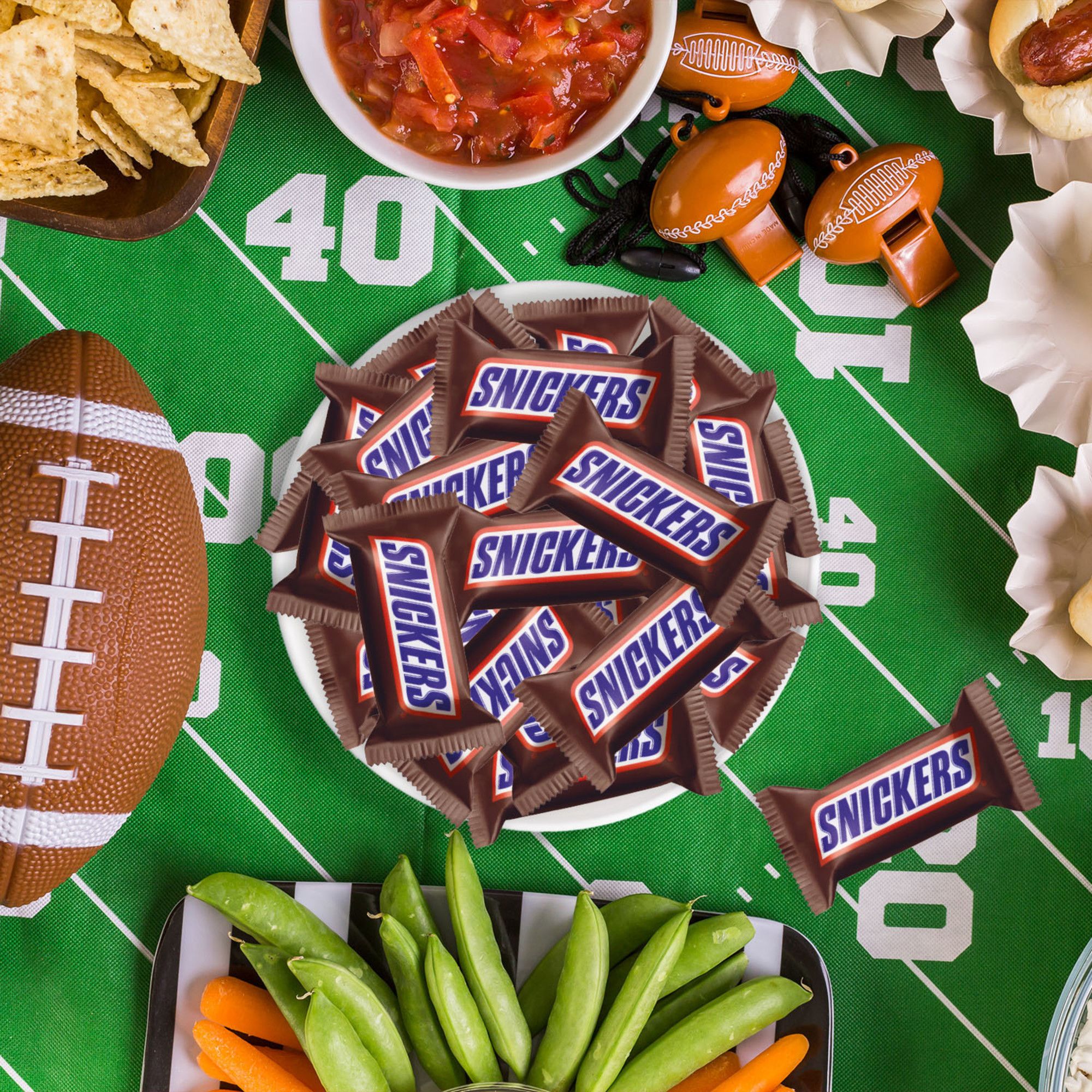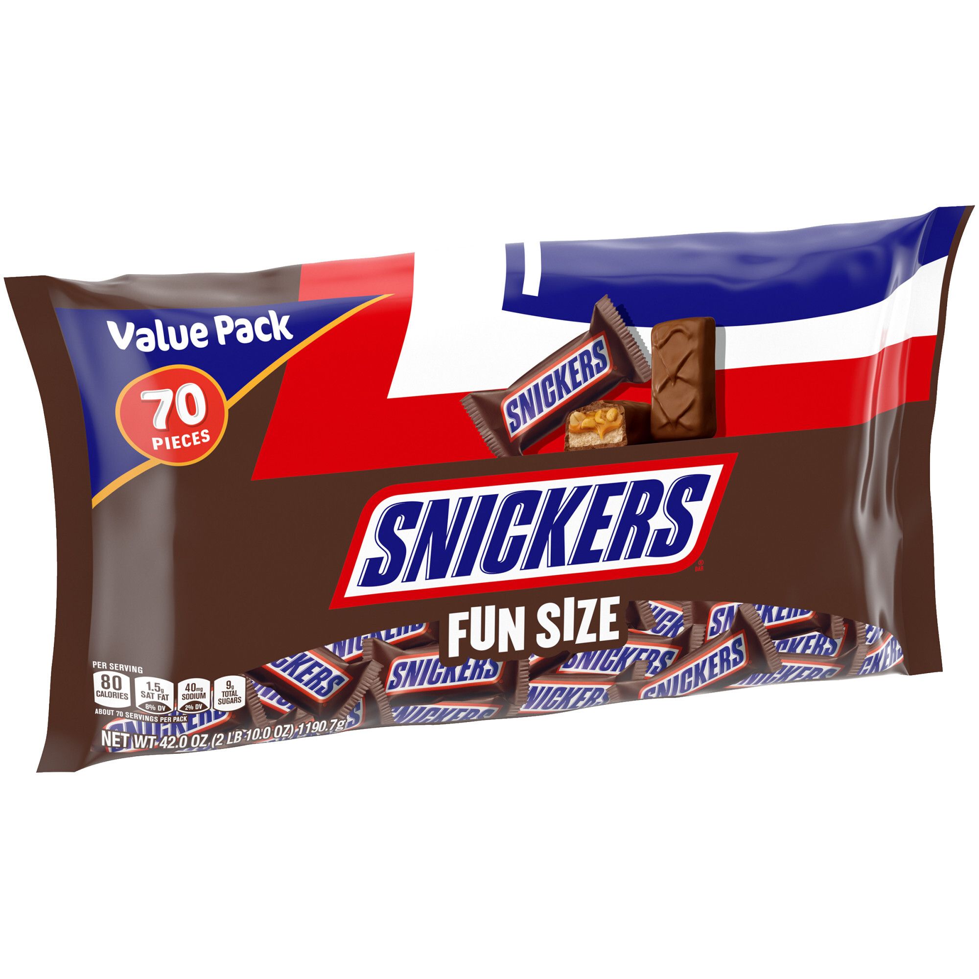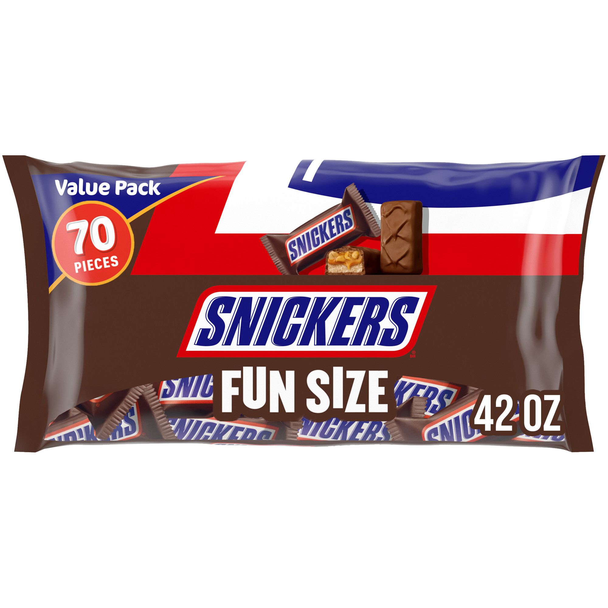Feeling... unsatisfied? Maybe you just need a Snickers. This bulk chocolate candy bag includes 70 individually wrapped fun size Snickers candy bars. Packed with roasted peanuts, caramel, and nougat, and covered in milk chocolate, Snickers candy bars can turn your day from "Meh" to "Satisfying" in just one bite! Keep your pantry stocked for any celebration and occasion with these fun size milk chocolate bars. When it comes to celebrations, there is no room for rookie mistakes. Use individually wrapped Snickers in party favors, candy buffets, and piñatas. These milk chocolate bars also make great on-the-go treats! Pack Snickers in lunches, take them along on family road trips, or keep them conveniently in your desk drawer for when that midday hunger hits. Snickers fun size chocolate candy bars make break time so much more satisfying. Be the best house on the block this holiday season when you share fun-size Snickers. This 70-count bulk candy bag is also perfect for holiday movie nights, stocking stuffers, or to fill all your holiday candy dishes in between.