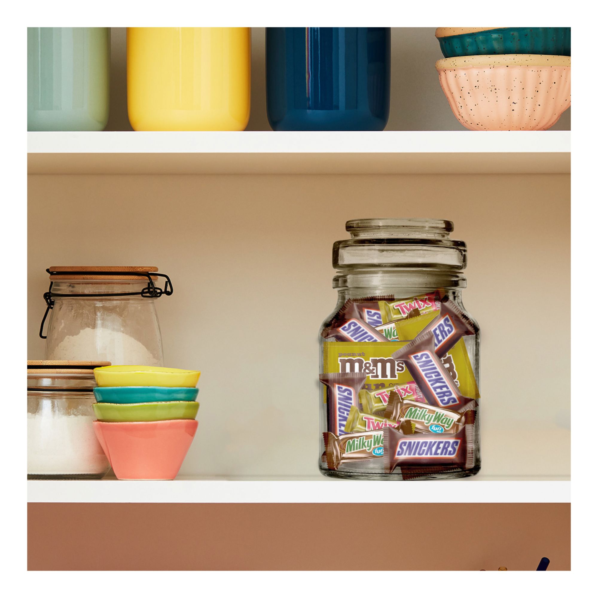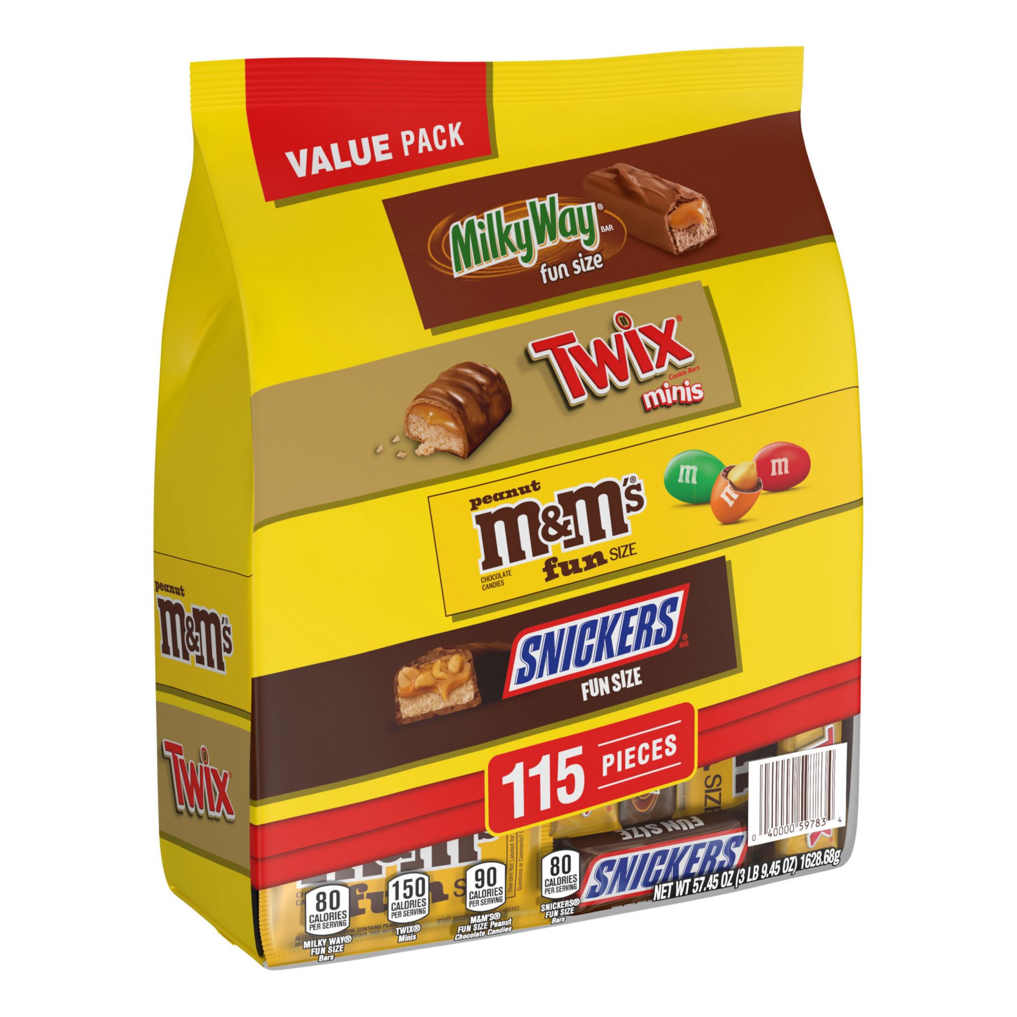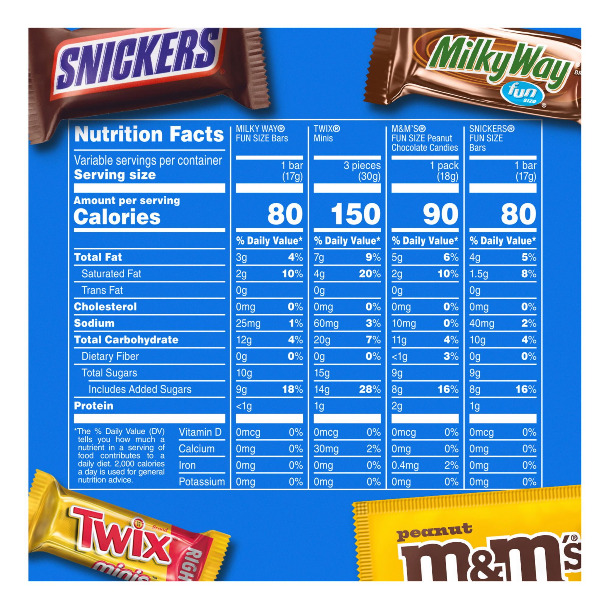 Features M&M’S Peanut Fun Size Chocolate Candy, Snickers Original Fun Size Chocolate Bars, Twix Caramel Cookie Mini Chocolate Bars, and Milky Way Fun Size Chocolate Bars