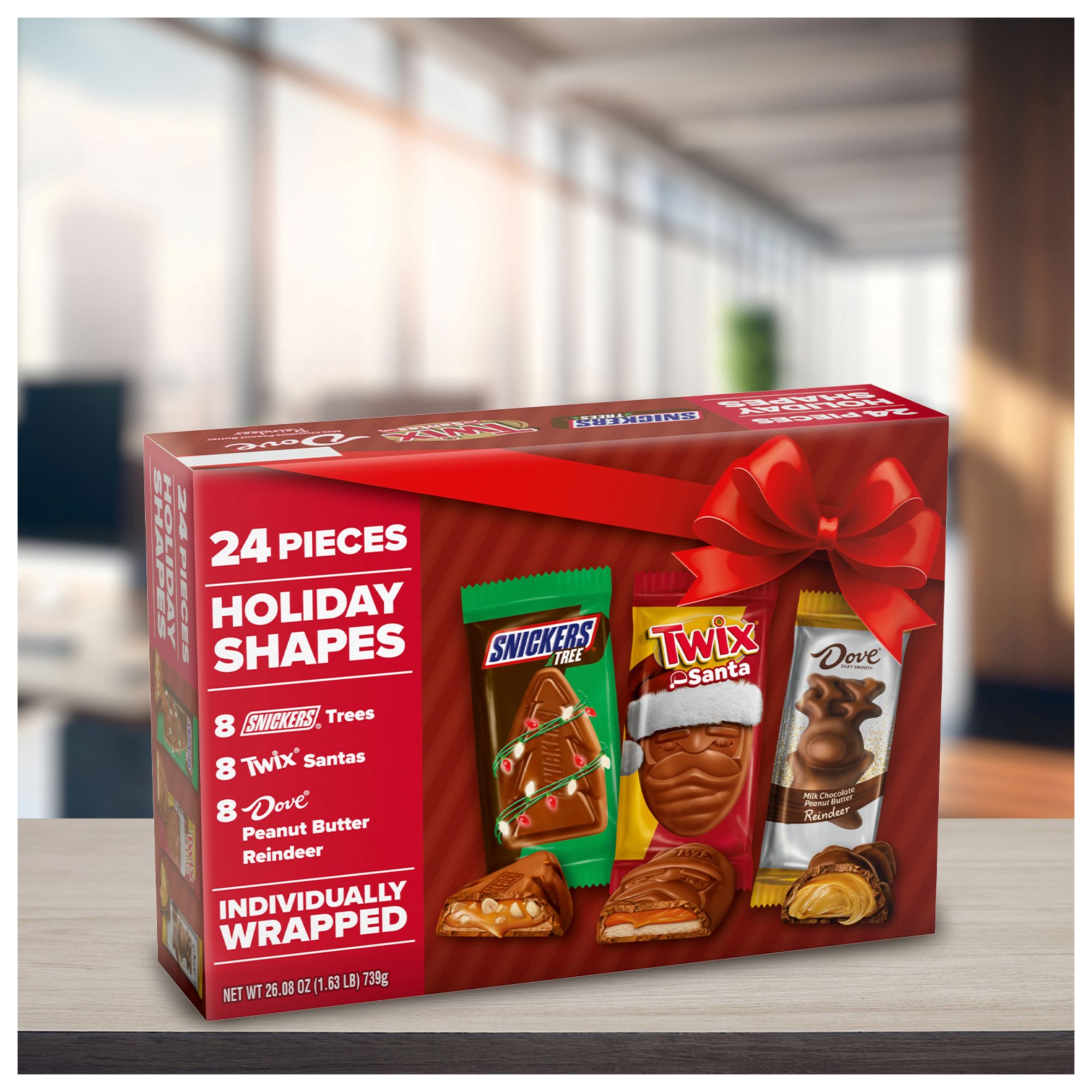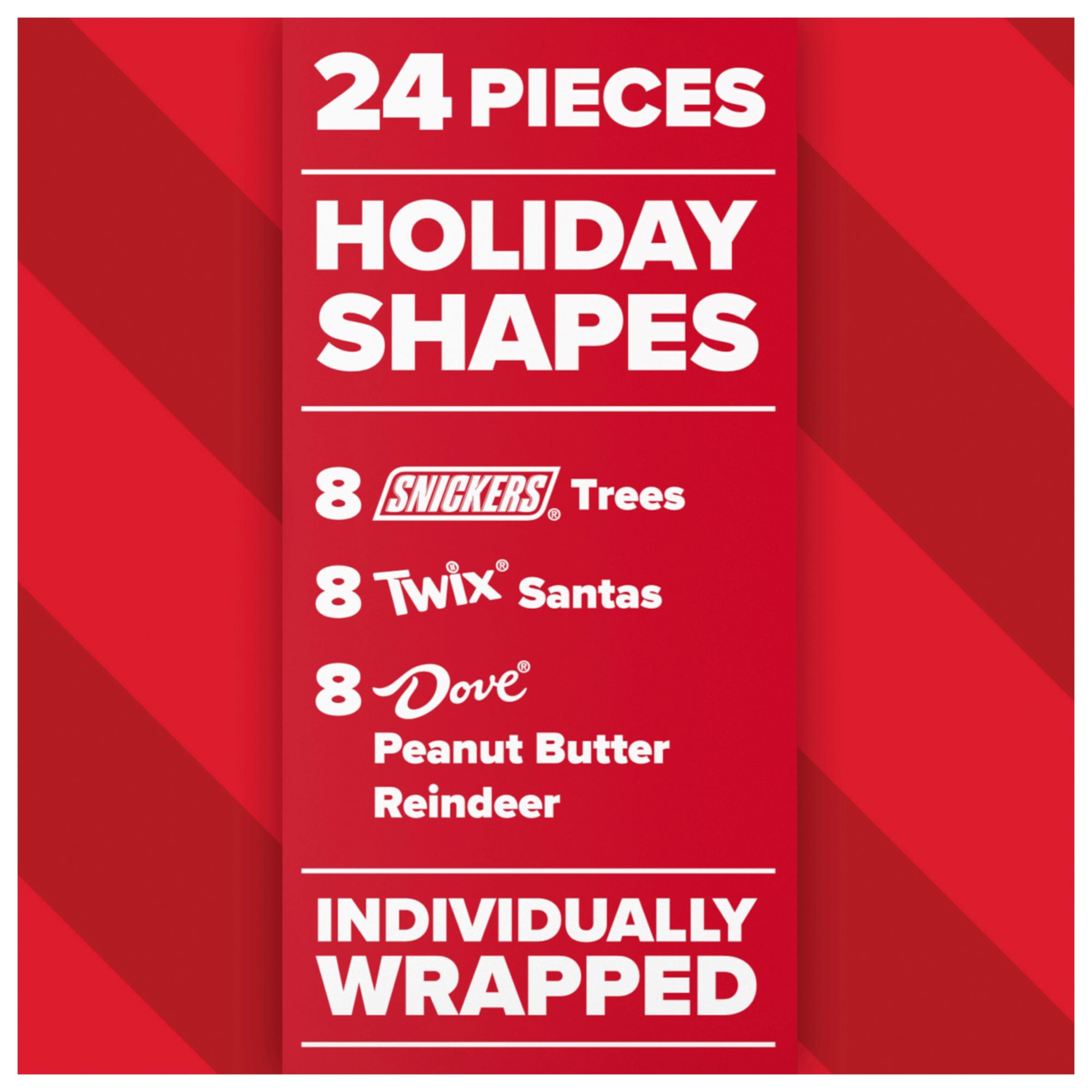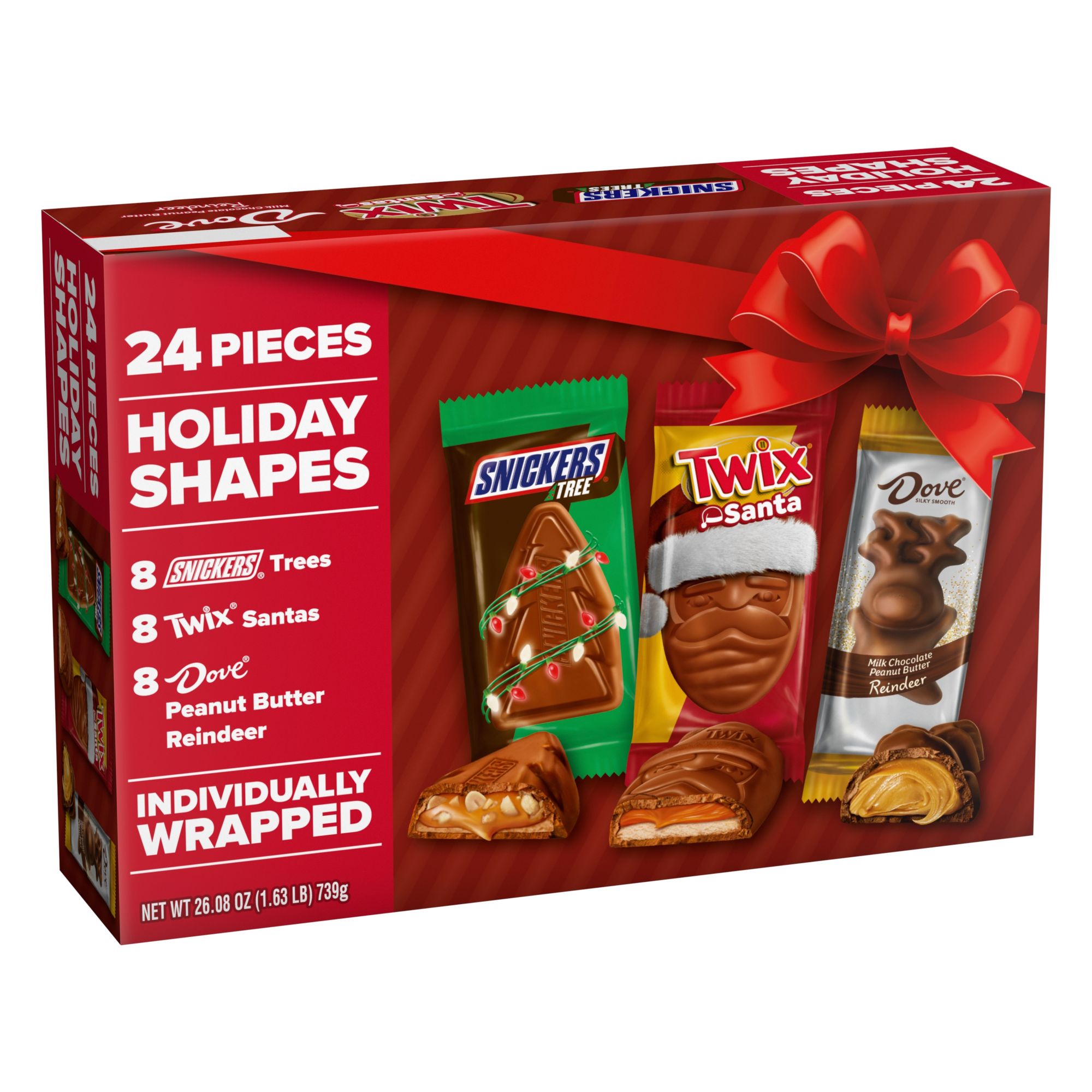 Contains one 26.08-ounce, 24-count bulk box of Snickers, Twix & Dove Chocolate Holiday Shapes