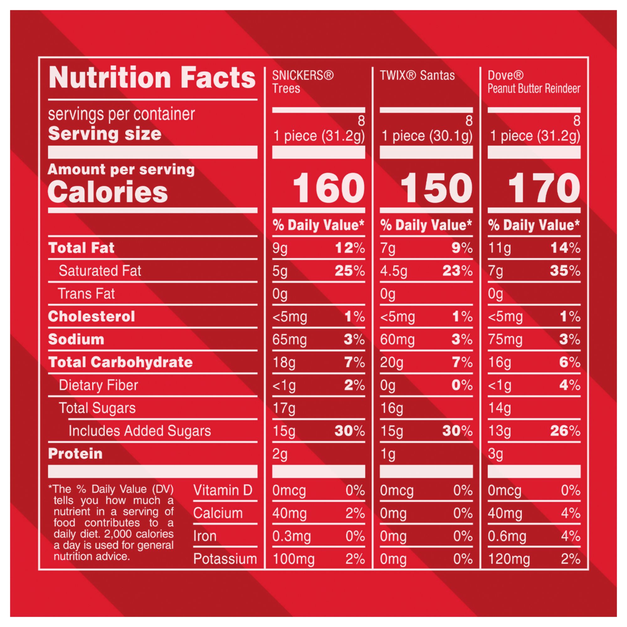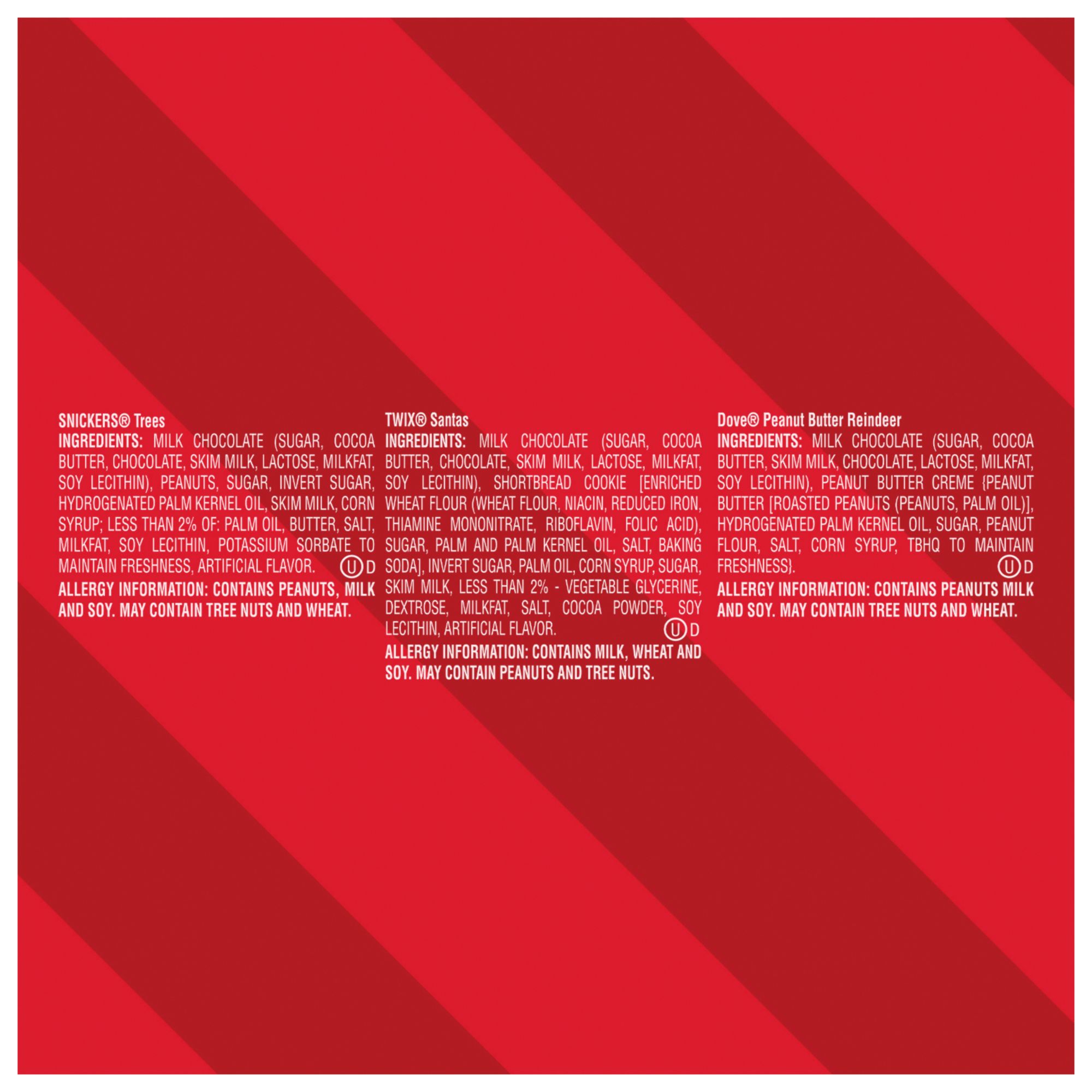Ingredients: Snickers Trees Ingredients: Milk Chocolate (Sugar, Cocoa Butter, Chocolate, Skim Milk, Lactose, Milkfat, Soy Lecithin), Peanuts, Sugar, Invert Sugar, Hydrogenated Palm Kernel Oil, Skim Milk, Corn Syrup; Less Than 2% Of: Palm Oil, Butter, Salt, Milkfat, Soy Lecithin, Potassium Sorbate To Maintain Freshness, Artificial Flavor. Twix Santas Ingredients: Milk Chocolate (Sugar, Cocoa Butter, Chocolate, Skim Milk, Lactose, Milkfat, Soy Lecithin), Shortbread Cookie [Enriched Wheat Flour (Wheat Flour, Niacin, Reduced Iron, Thiamine Mononitrate, Riboflavin, Folic Acid), Sugar, Palm And Palm Kernel Oil, Salt, Baking Soda], Invert Sugar, Palm Oil, Corn Syrup, Sugar, Skim Milk, Less Than 2% - Vegetable Glycerine, Dextrose, Milkfat, Salt, Cocoa Powder, Soy Lecithin, Artificial Flavor. Dove Peanut Butter Reindeer Ingredients: Milk Chocolate (Sugar, Cocoa Butter, Skim Milk, Chocolate, Lactose, Milkfat, Soy Lecithin), Peanut Butter Creme {Peanut Butter [Roasted Peanuts (Peanuts, Palm Oil)], Hydrogenated Palm Kernel Oil, Sugar, Peanut Flour, Salt, Corn Syrup, Tbhq To Maintain Freshness}.