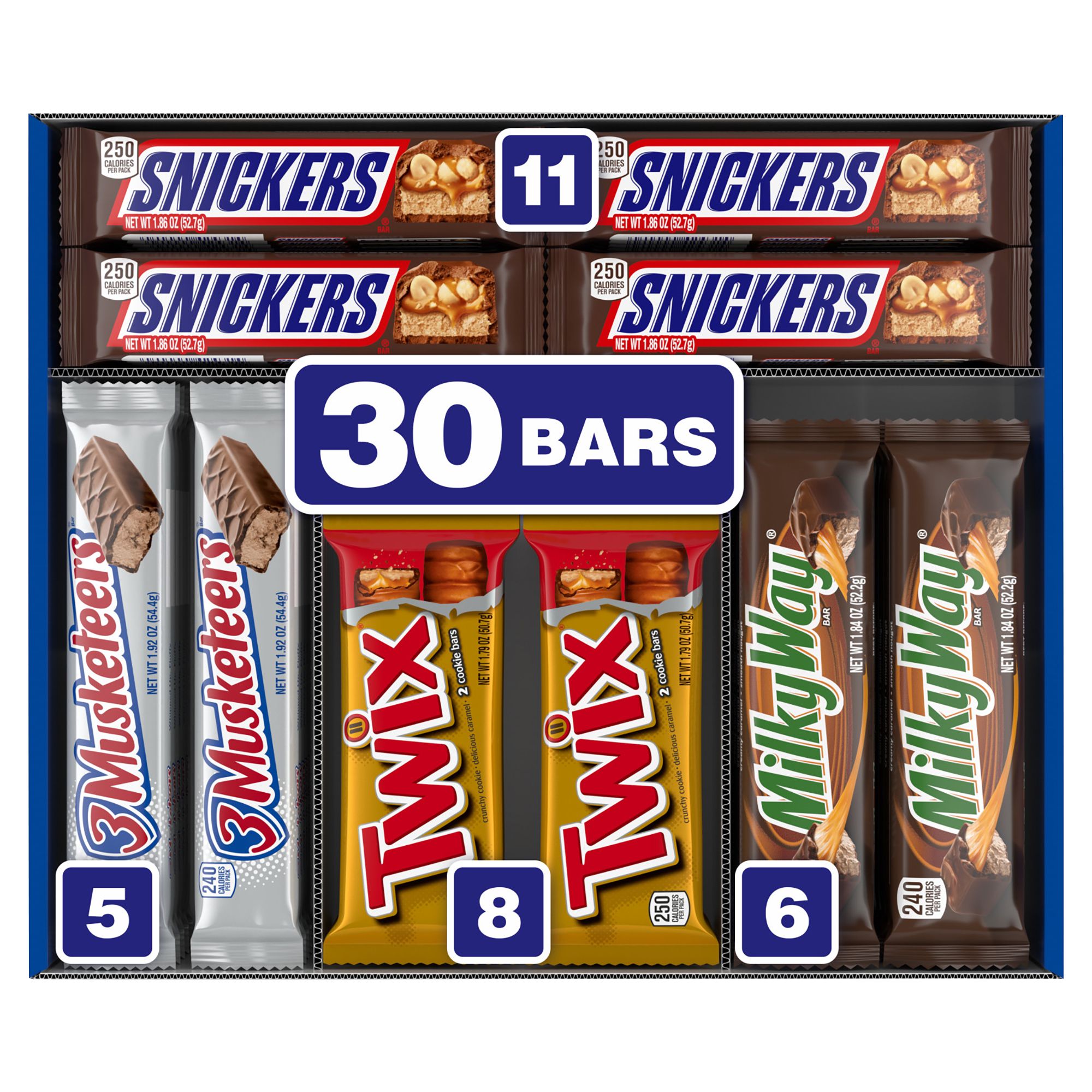 Everyone has a favorite candy bar. Find them all in one place with this 30-piece bulk chocolate bar assortment. Each assorted bulk pack includes full size individually wrapped packs of (11) Snickers Original chocolate candy bars, (8) Twix chocolate candy bars, (6) Milky Way candy bars, and (5) 3 Musketeers chocolate candy bars. With 30 Full Size candy bars in every box, there enough delicious fun for any occasion. Individually wrapped candy is great for party favors or as pinata candy. A bulk box of chocolate bar are great for stocking the pantry. Grab and go for an on-the-go treat, add to lunches or take family road trips. Whatever the occasion, you'll please all the chocolate lovers in your life. You can never go wrong with Snickers ,Twix, Milky Way, and 3 Musketeers.