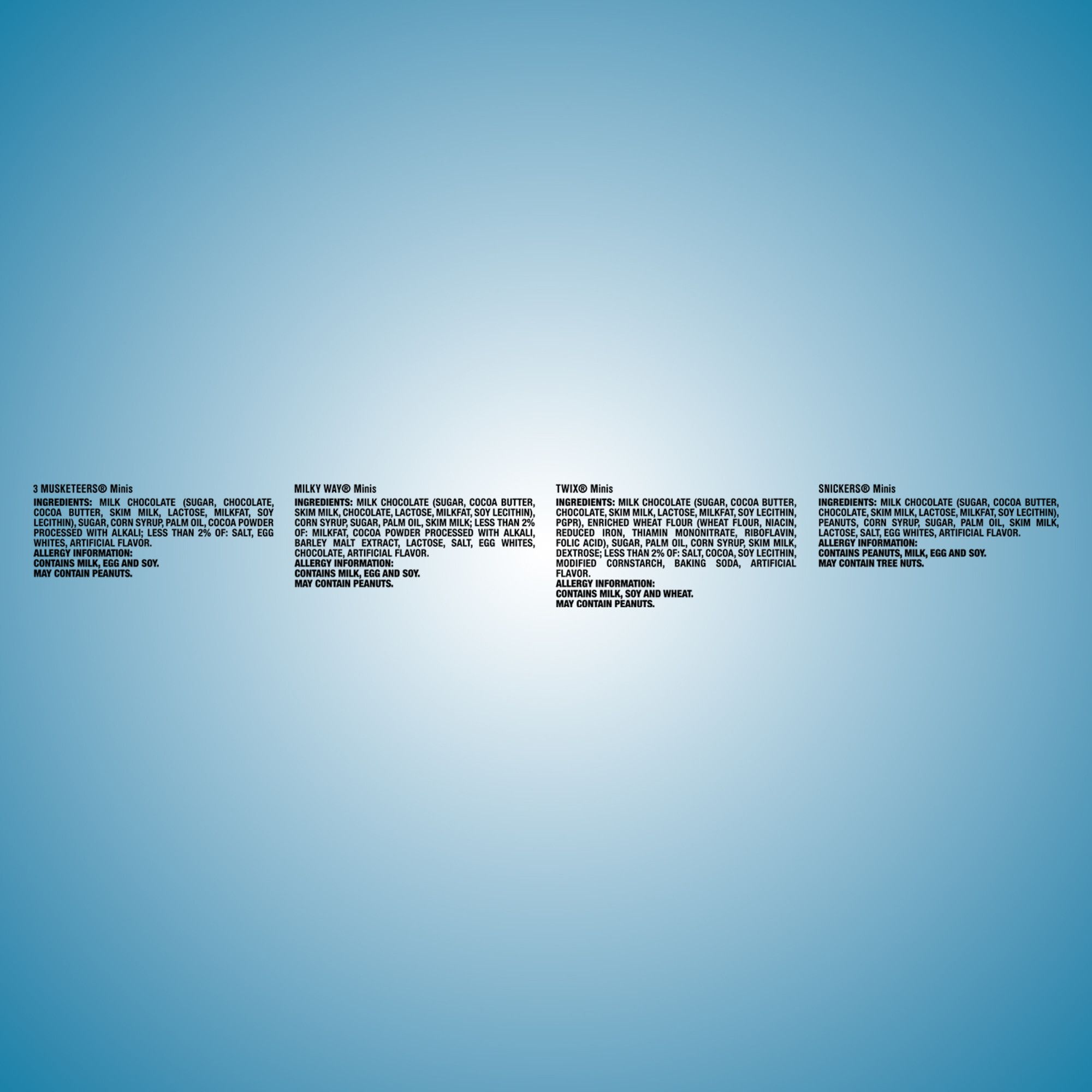 Contains one (1), 57.15-ounce, 200-count, bulk bag of Snickers, Twix, 3 Musketeers, & Milky Way Original Mini Chocolate Candy Bars