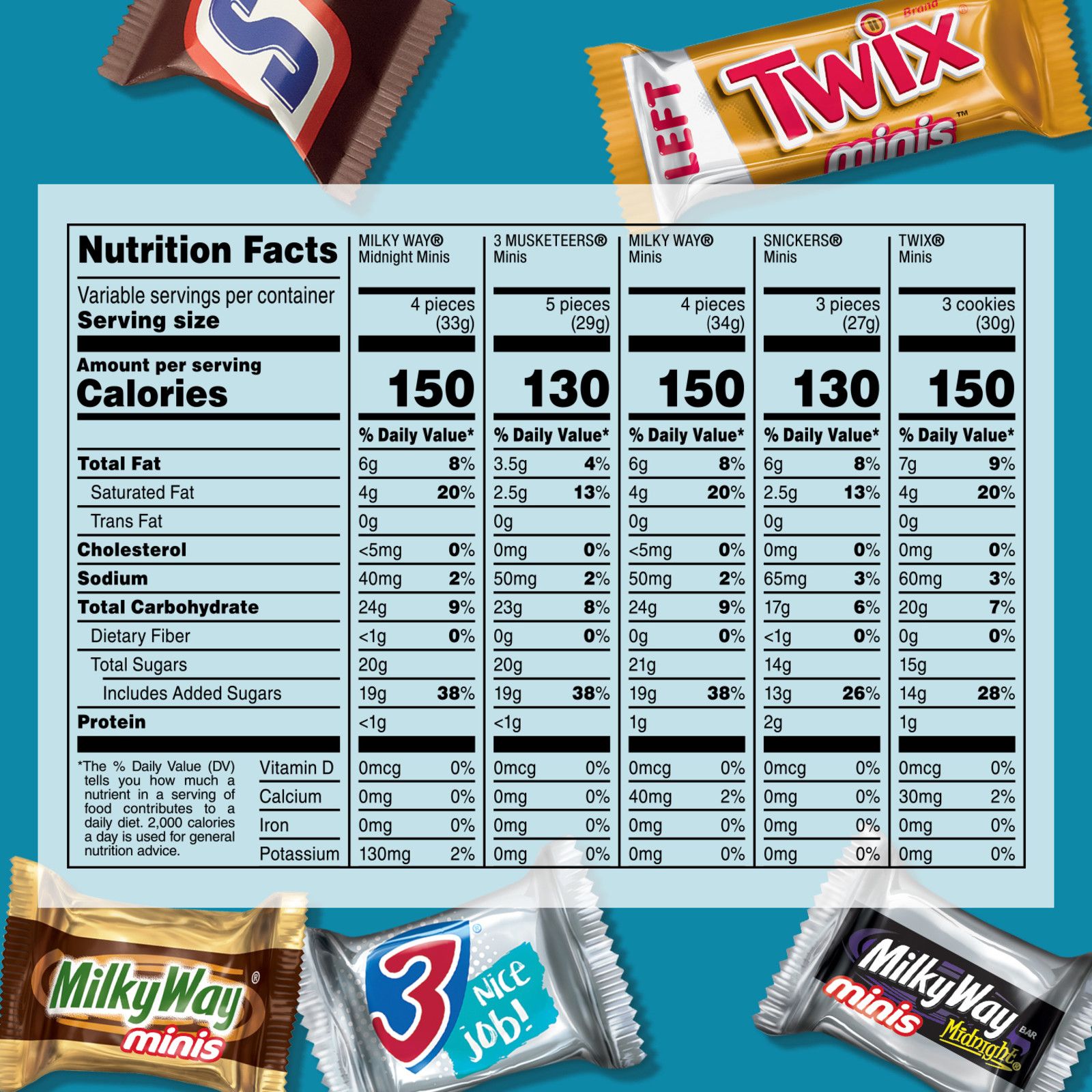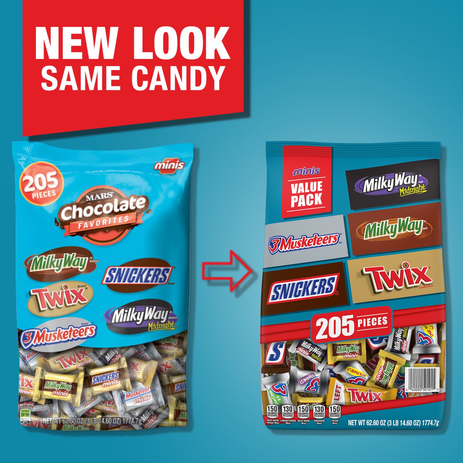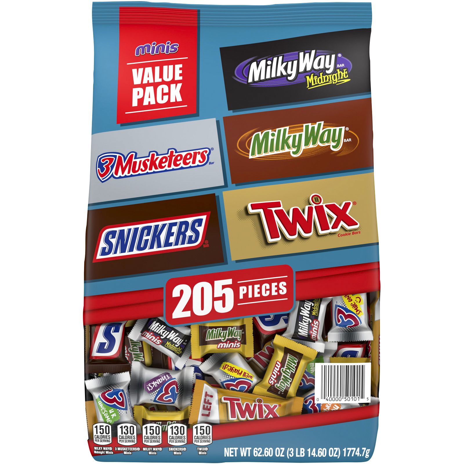 Keep everyone's favorite chocolate candy flavors on hand with this assorted value variety mix, perfect for any occasion. This bulk candy bag features a delicious assortment of minis size Snickers Bars, Twix Caramel Chocolate Cookie Bars, Milky Way Original Chocolate Bars, Milky Way Midnight Dark Chocolate Bars and 3 Musketeers Candy. This bulk candy value pack has 205 pieces of delicious chocolate so you can easily keep the fun going. These individually wrapped chocolates are fun and easy to share. Decorate candy bowls and dessert tables at birthday parties with these colorful treats or use them as piñata fillers. Great for topping off the candy dish at the front desk or enjoying as an afternoon treat in the breakroom. Decorate candy buffets with a mix of everyone’s favorite chocolate flavors or create adorable DIY party favors for guests to take home. This bulk assortment of chocolate candy makes a great addition to gift baskets and care packages to let your loved ones know you’re thinking of them.