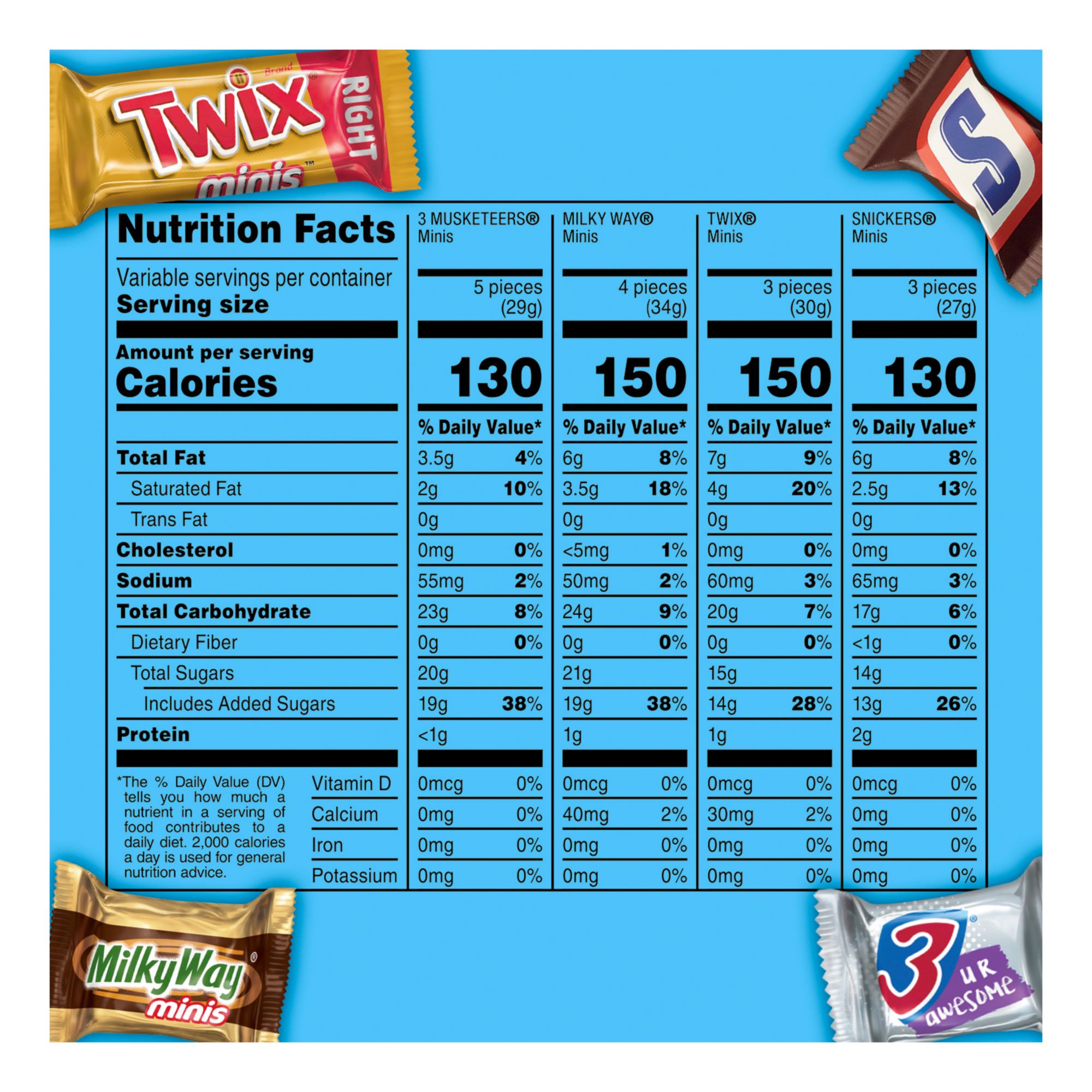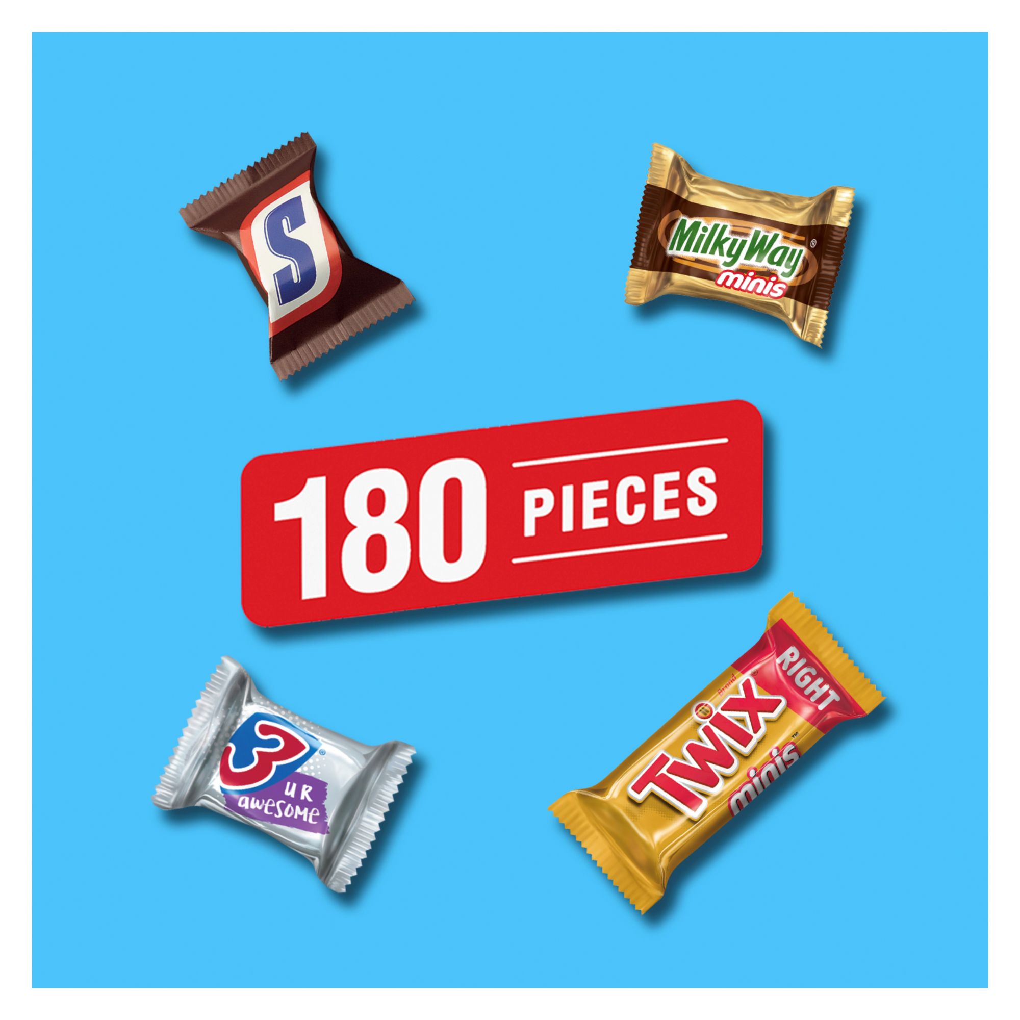 Contains one (1) 49.44 ounce, 180 count, bulk bag of Snickers, Twix, 3 Musketeers, & Milky Way Original Mini Chocolate Candy Bars