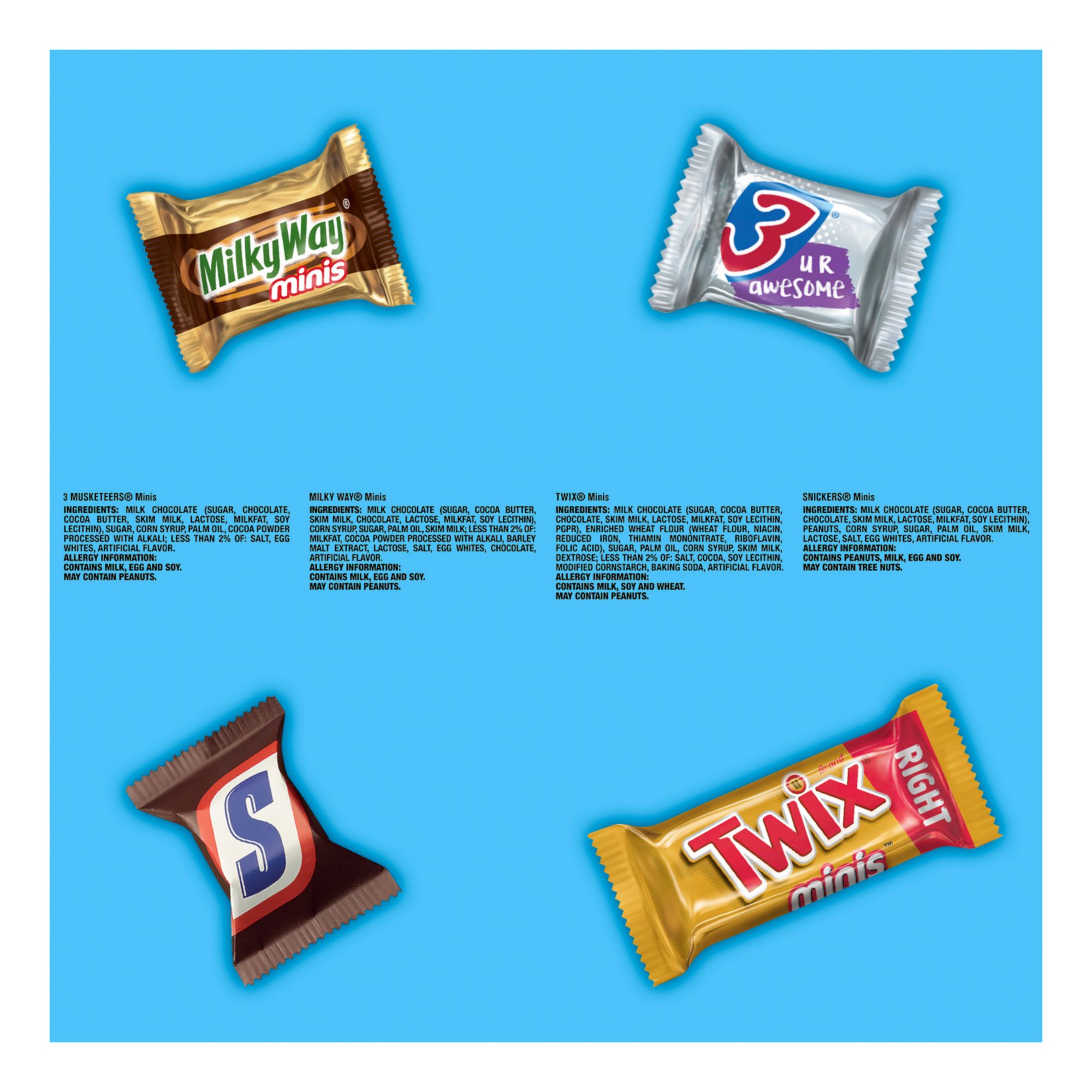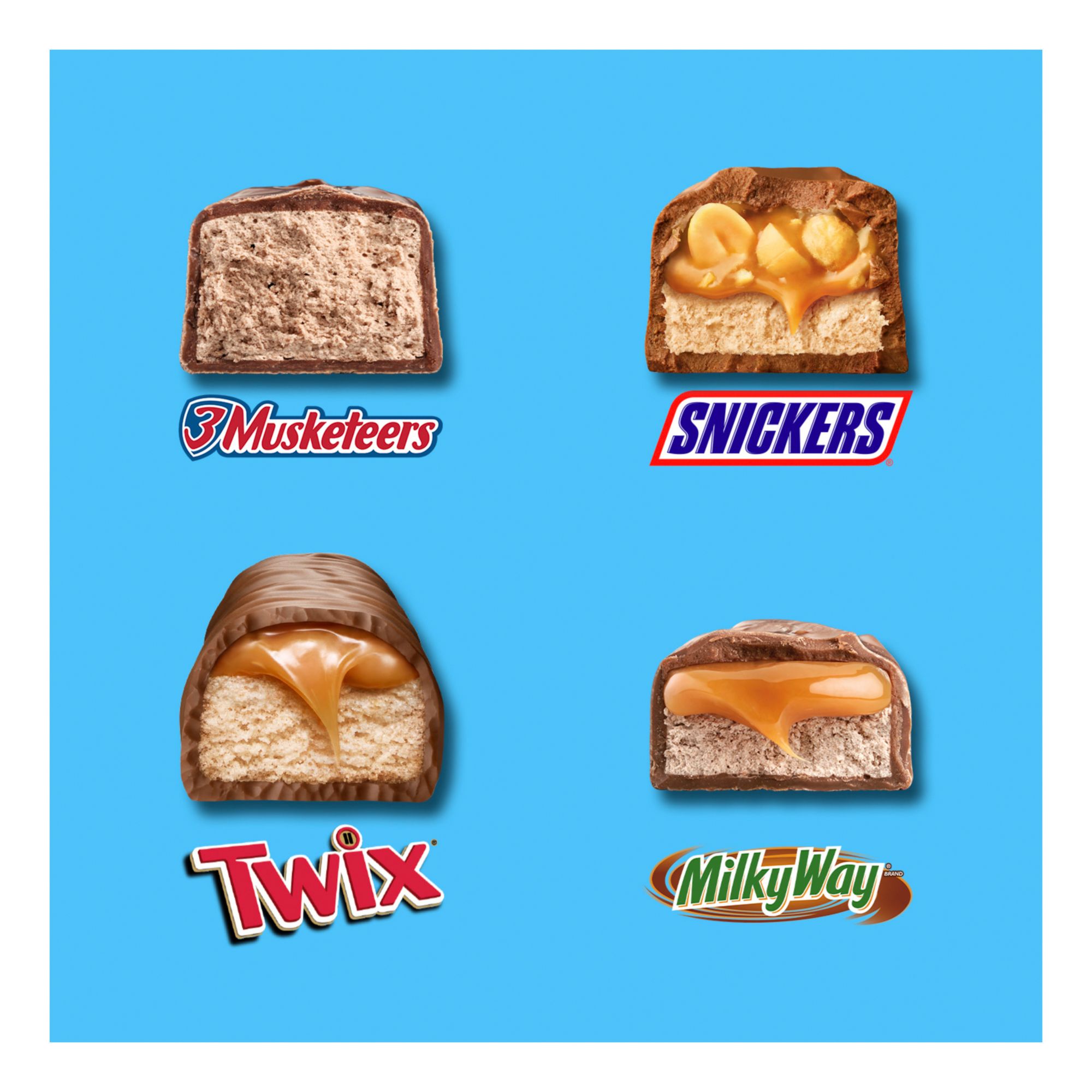 Each bulk candy variety bag includes an assortment of individually wrapped miniature Snickers, Twix, 3 Musketeers, and Milky Way Original chocolate candy bars
