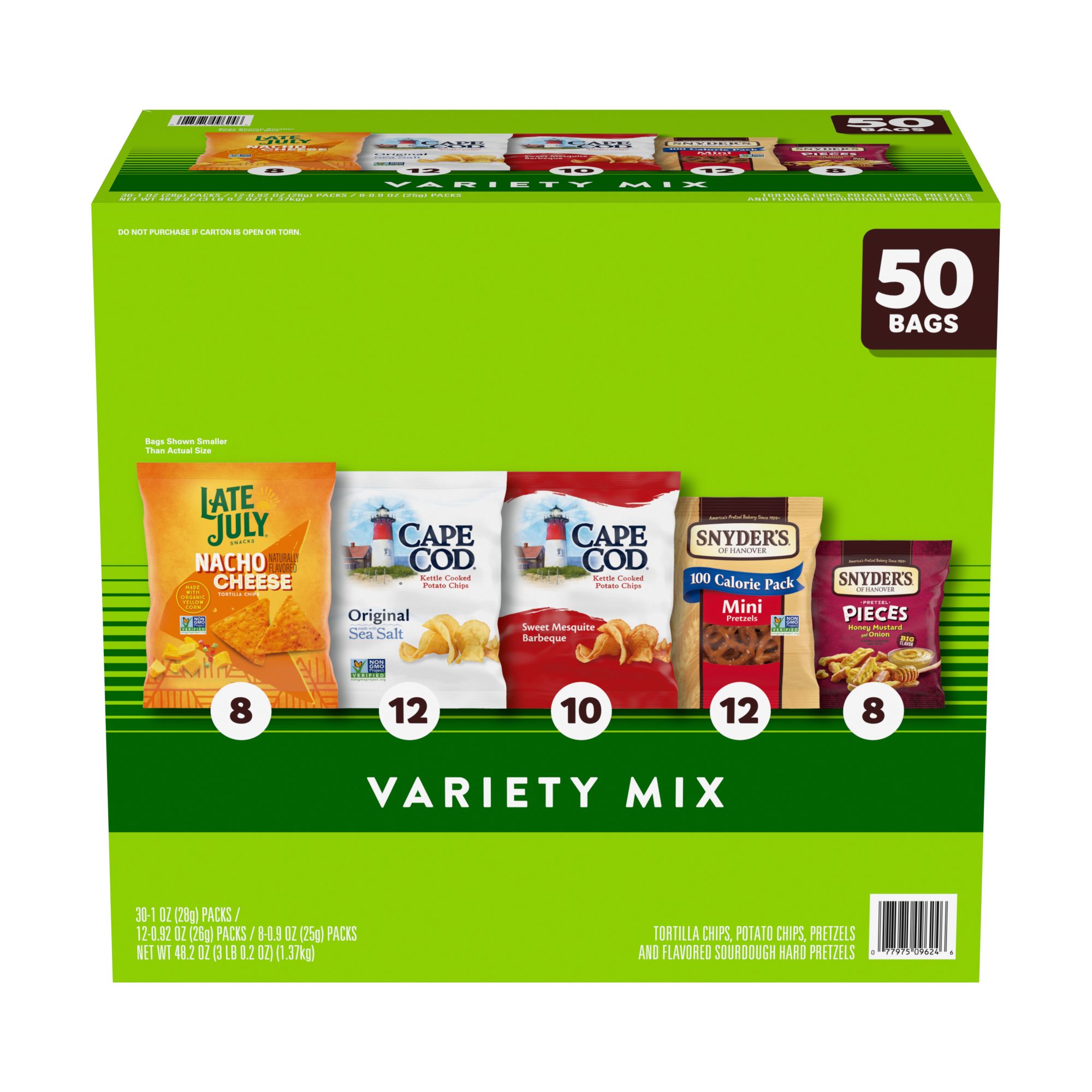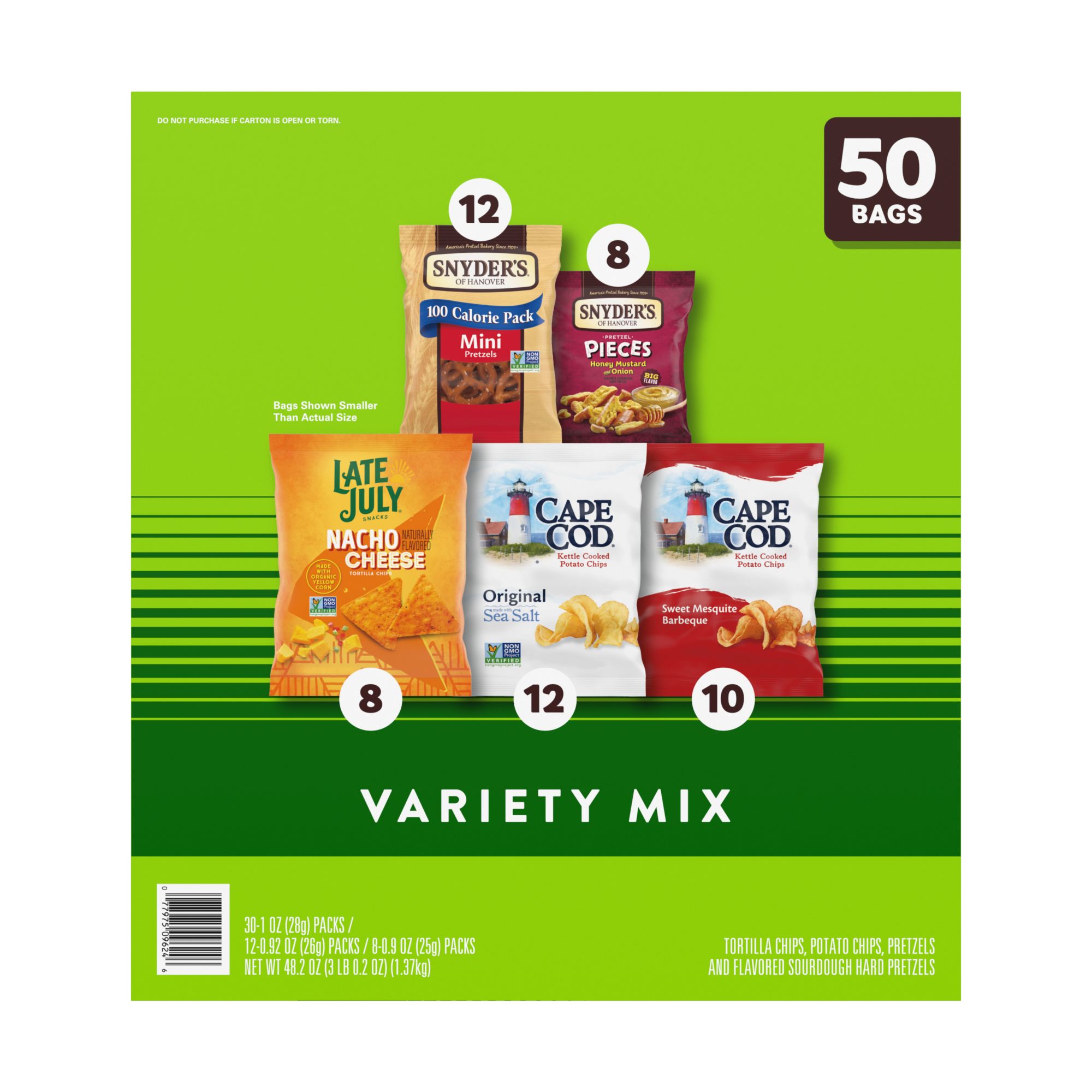 Get top flavors of Snyder’s of Hanover pretzels, Cape Cod Potato Chips, and Late July Tortilla Chips in a delicious 50-count variety pack, including: Snyder's of Hanover Minis, Snyder's of Hanover Pieces Honey Mustard & Onion, Cape Cod Original Sea Salt, and Cape Cod Sweet Mesquite Barbeque, and Late July Nacho. 100 Calorie Mini Pretzels from Snyder's of Hanover are slow baked for an irresistibly crunchy, bite-size snack. Cape Cod Kettle Chips come from choice potatoes sliced perfectly and cooked in custom kettles. Enjoy the bold flavor of our Late July Nacho Cheese Tortilla Chips.