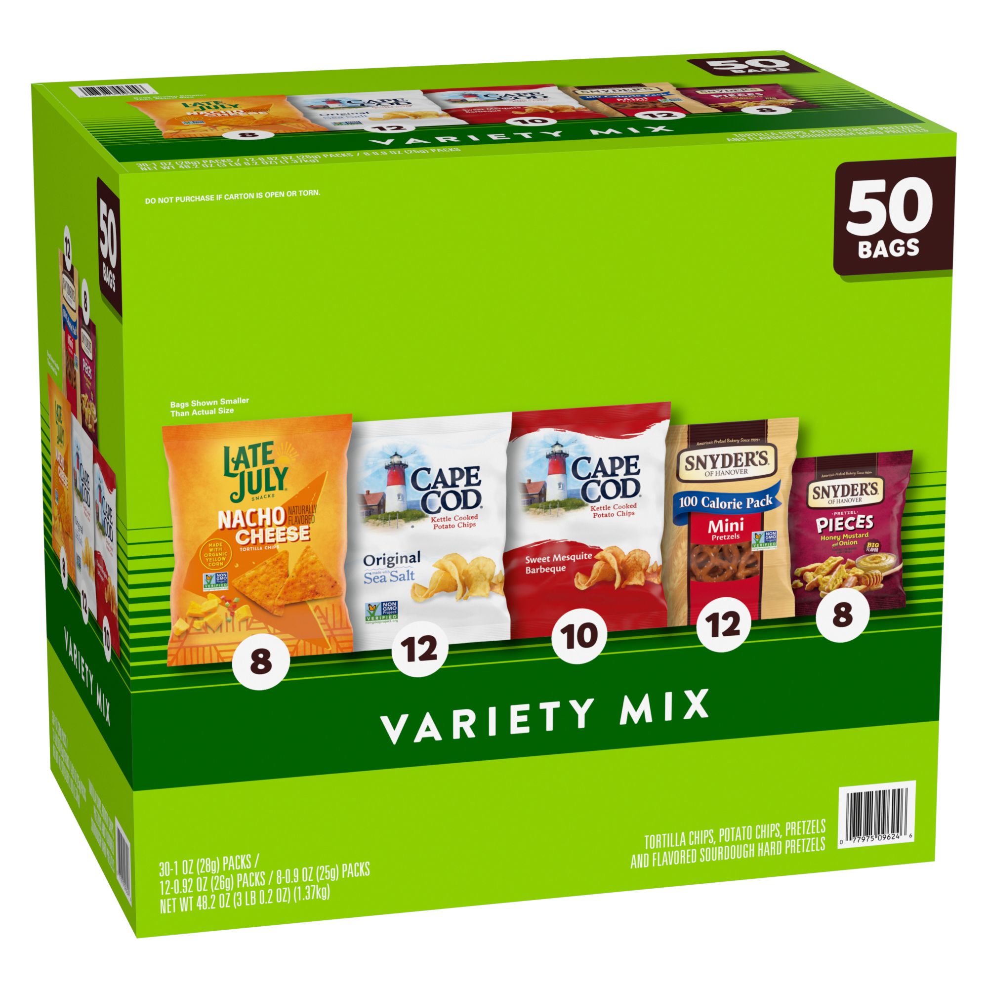Includes variety pack of snack bags, 50 ct.