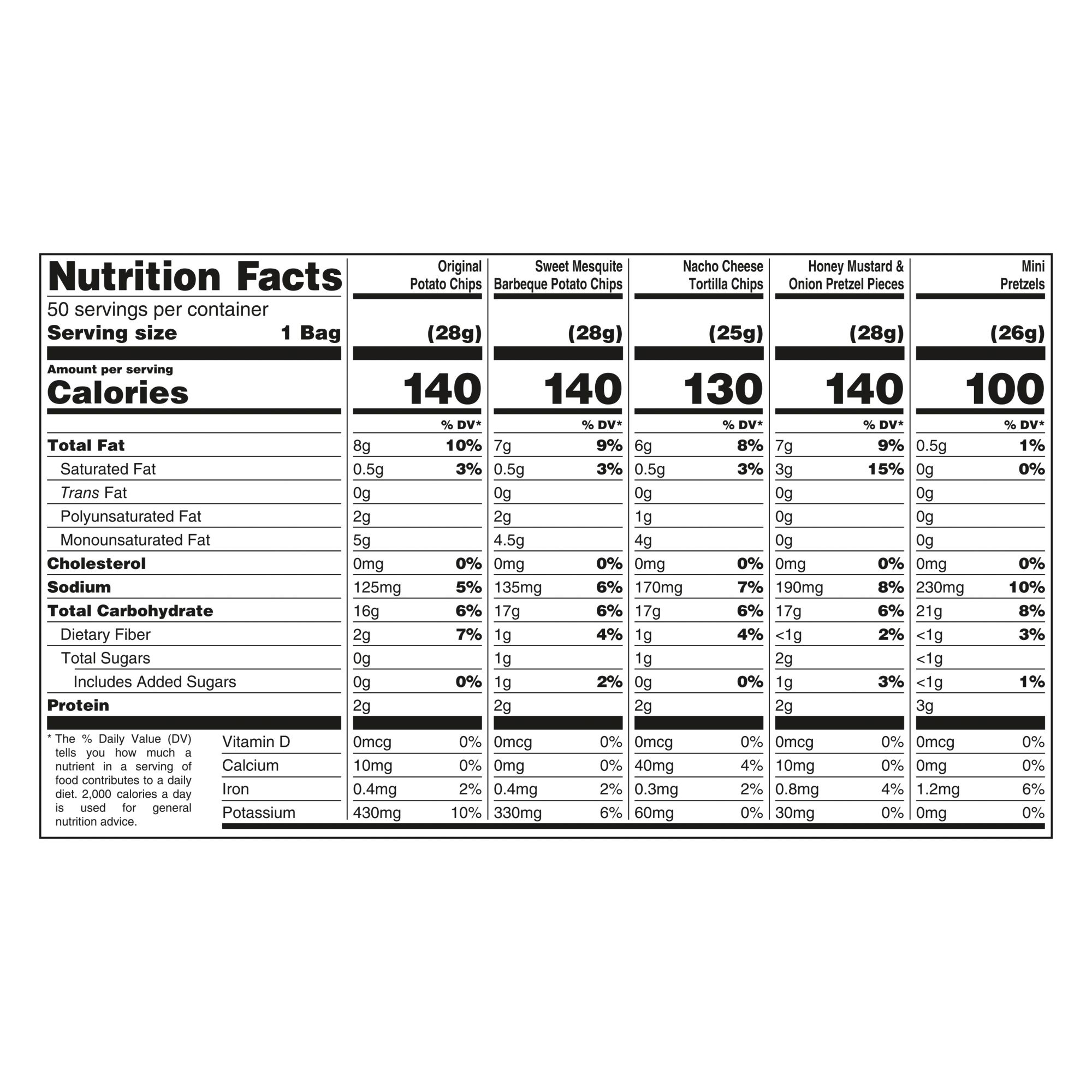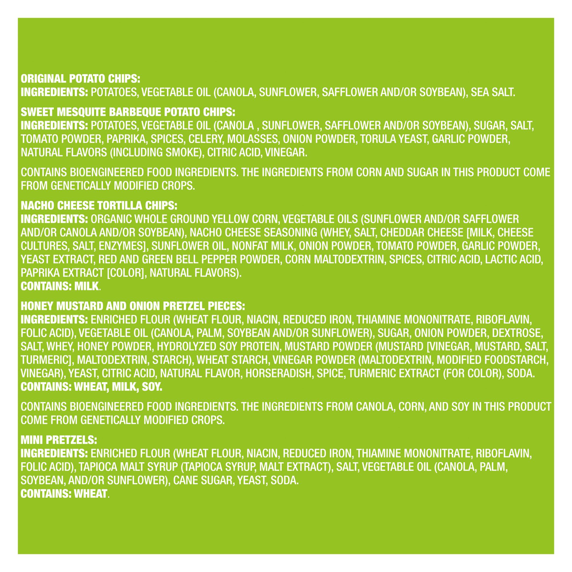Ingredients Original Potato Chips: Ingredients: Potatoes, Vegetable Oils (Canola And/or Sunflower And/or Safflower And/or Soybean), Sea Salt. Sweet Mesquite Barbeque Potato Chips: Ingredients: Potatoes, Vegetable Oils (Canola And/or Sunflower And/or Safflower And/or Soybean), Sugar, Salt, Tomato Powder, Paprika, Spices, Celery, Molasses, Onion Powder, Torula Yeast, Garlic Powder, Natural Flavors (Including Smoke), Citric Acid, Vinegar. Nacho Cheese Torilla Chips: Ingredients: Organic Whole Ground Yellow Corn, Vegetable Oils (Sunflower And/or Safflower And/or Canola And/or Soybean), Nacho Cheese Seasoning (Whey, Salt, Cheddar Cheese [Milk, Cheese Cultures, Salt, Enzymes], Sunflower Oil, Nonfat Milk, Onion Powder, Tomato Powder, Garlic Powder, Yeast Extract, Red And Green Bell Pepper Powder, Corn Maltodextrin, Spices, Citric Acid, Lactic Acid, Paprika Extract [Color], Natural Flavors). Contains: Milk. Mini Pretzels: Ingredients: Enriched Flour (Wheat Flour, Niacin, Reduced Iron, Thiamine Mononitrate, Riboflavin, Folic Acid), Tapioca Malt Syrup (Tapioca Syrup, Malt Extract), Salt, Vegetable Oil (Canola, Palm, Soybean, And/or Sunflower), Cane Sugar, Yeast, Soda. Contains: Wheat Honey Mustard And Onion Pieces: Ingredients: Enriched Flour (Wheat Flour, Niacin, Reduced Iron, Thiamine Mononitrate, Riboflavin, Folic Acid), Palm Oil, Sugar, Onion Powder, Dextrose, Salt, Whey (Milk), Honey Powder, Hydrolyzed Soy Protein, Mustard Powder (Mustard [Vinegar, Mustard, Salt, Turmeric], Maltodextrin, Starch), Wheat Starch, Vinegar Powder (Maltodextrin, Modified Food Starch, Vinegar), Yeast, Canola Oil, Citric Acid, Natural Flavor, Horseradish, Spice, Turmeric Extract (Color), Soda. Contains: Wheat, Milk, Soy.