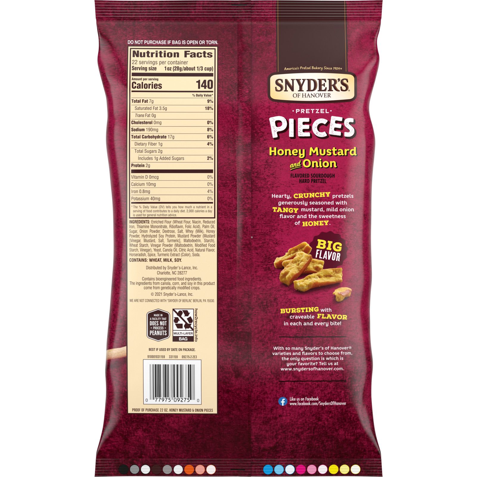 Includes one (1) 22-ounce bag of Snyder's of Hanover Honey Mustard & Onion flavored pretzel pieces