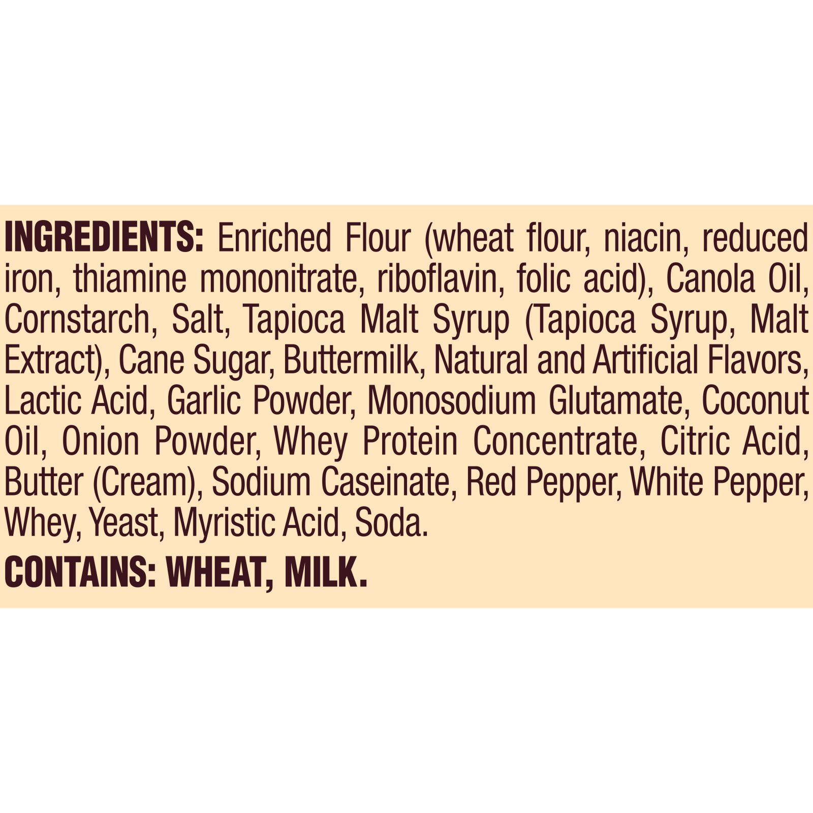 Ingredients: Enriched Flour (Wheat Flour, Niacin, Reduced Iron, Thiamine Mononitrate, Riboflavin, Folic Acid), Canola Oil, Cornstarch, Salt, Tapioca Malt Syrup (Tapioca Syrup, Malt Extract), Cane Sugar, Buttermilk, Natural And Artificial Flavors, Lactic Acid, Garlic Powder, Monosodium Glutamate, Coconut Oil, Onion Powder, Whey Protein Concentrate, Citric Acid, Butter (Cream), Sodium Caseinate, Whey, Red Pepper, White Pepper, Myristic Acid, Soda. Contains: Wheat, Milk