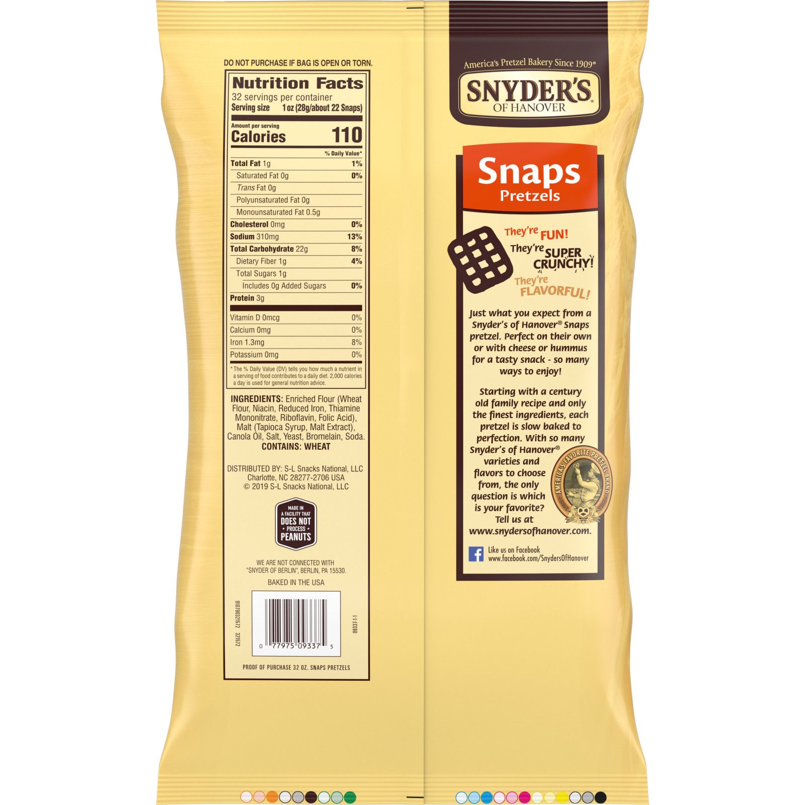 Includes one (1) 32-ounce bag of Snyder's of Hanover Snaps pretzels