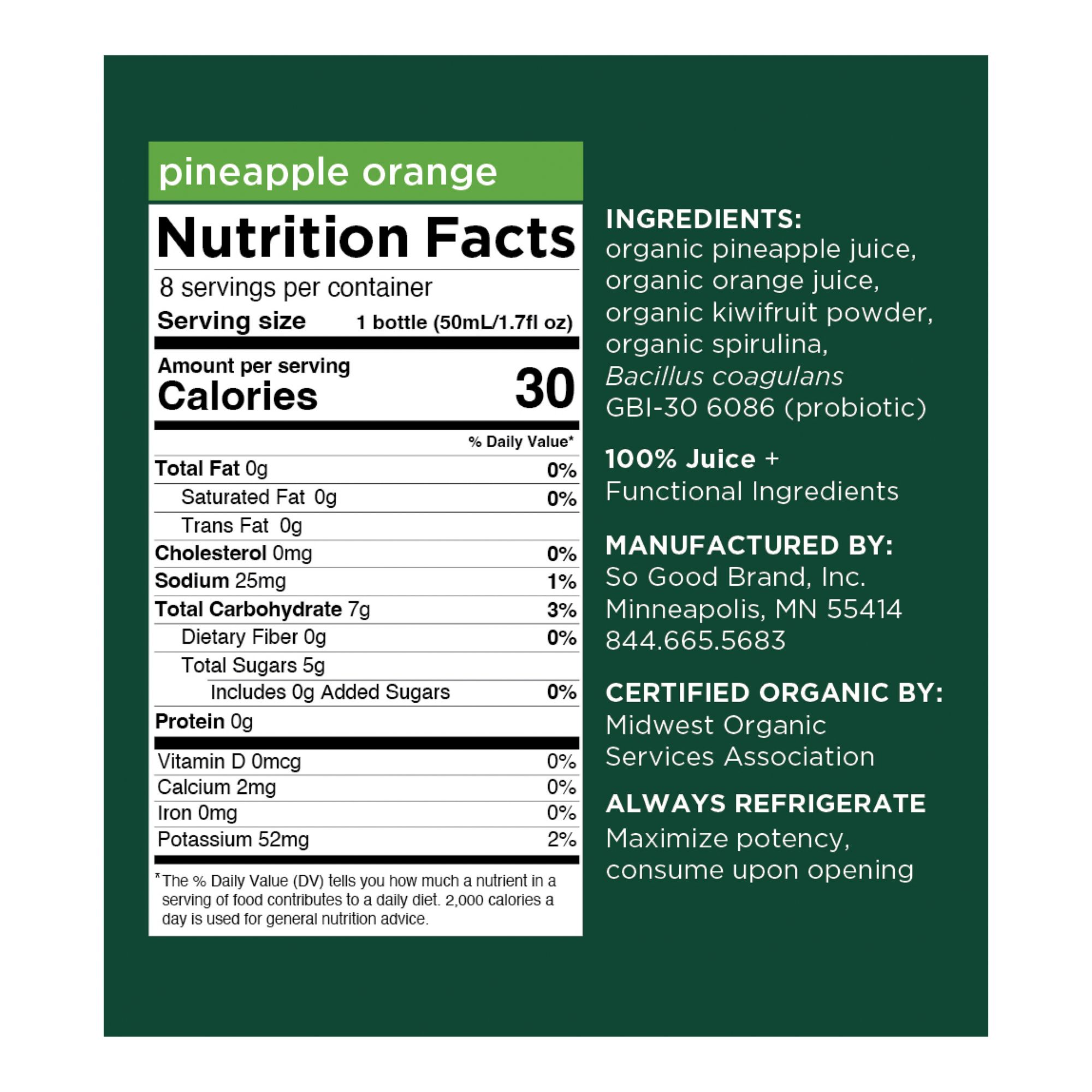 Ingredients: Organic Pineapple Juice, Organic Orange Juice, Organic Kiwi Powder, Organic Spirulina, Bacilllus Coagulans Gbi-30 6086 (Probiotic).