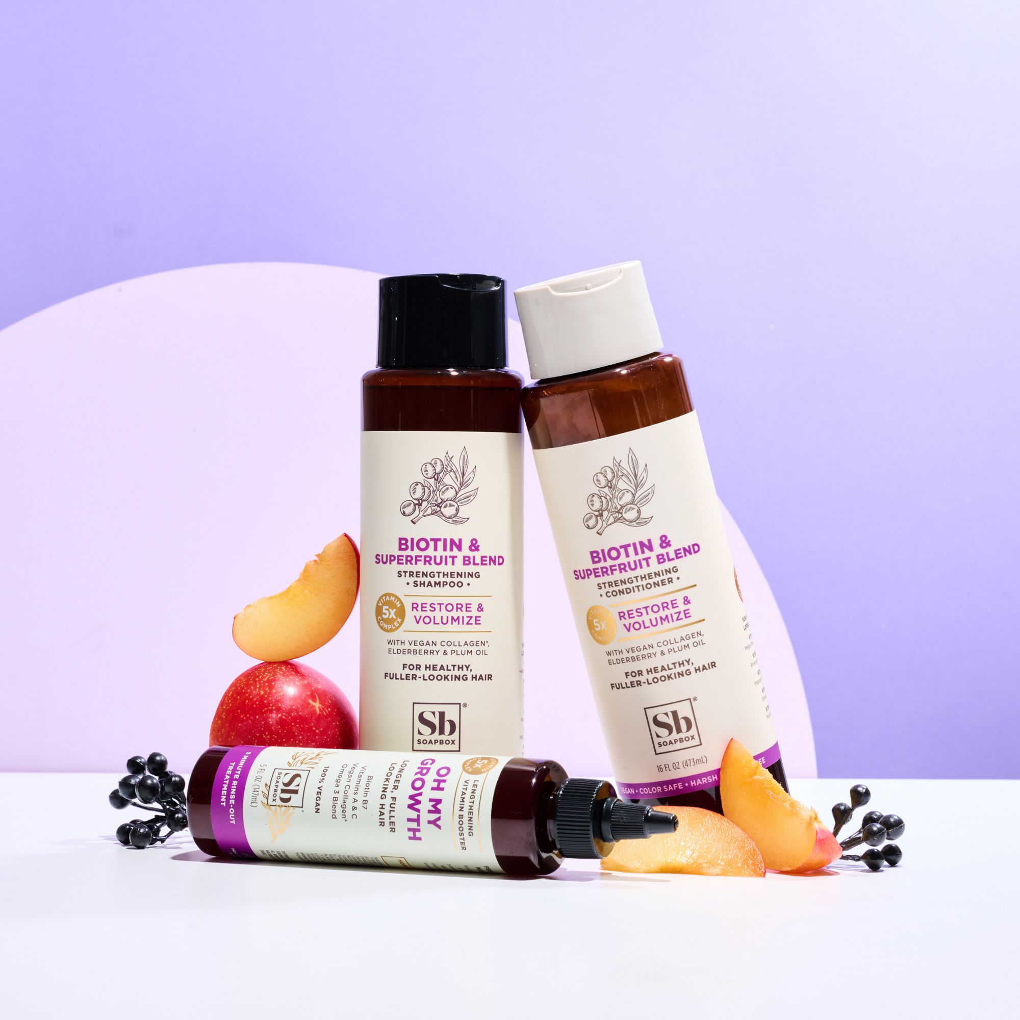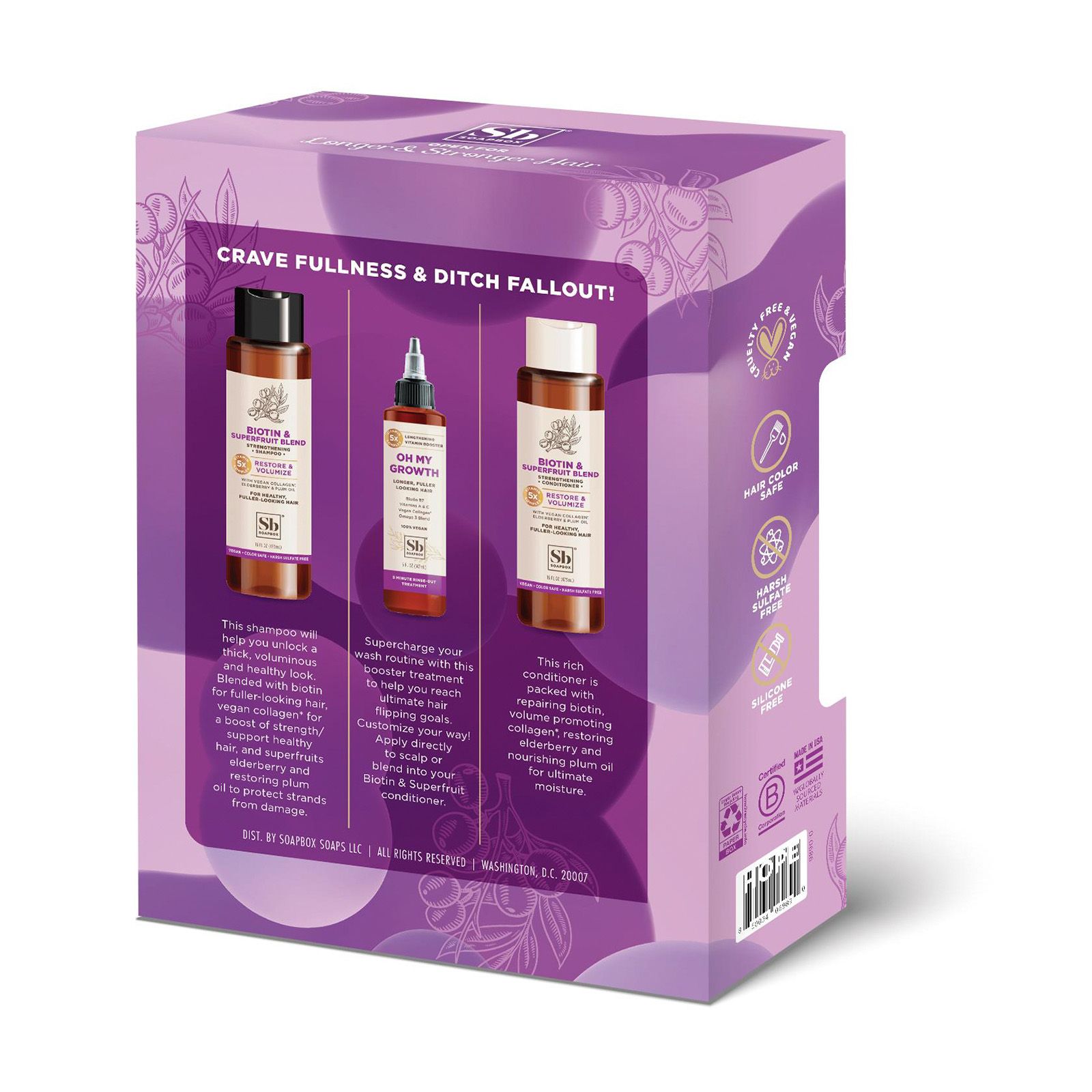 Soapbox Collagen & Fruit Enzymes Bond Builder Shampoo, 16 oz., Soapbox Biotin & Superfruit Blend Restore and Volumize Conditioner, 16 oz., and Soapbox Oh My Growth Hair Treatment