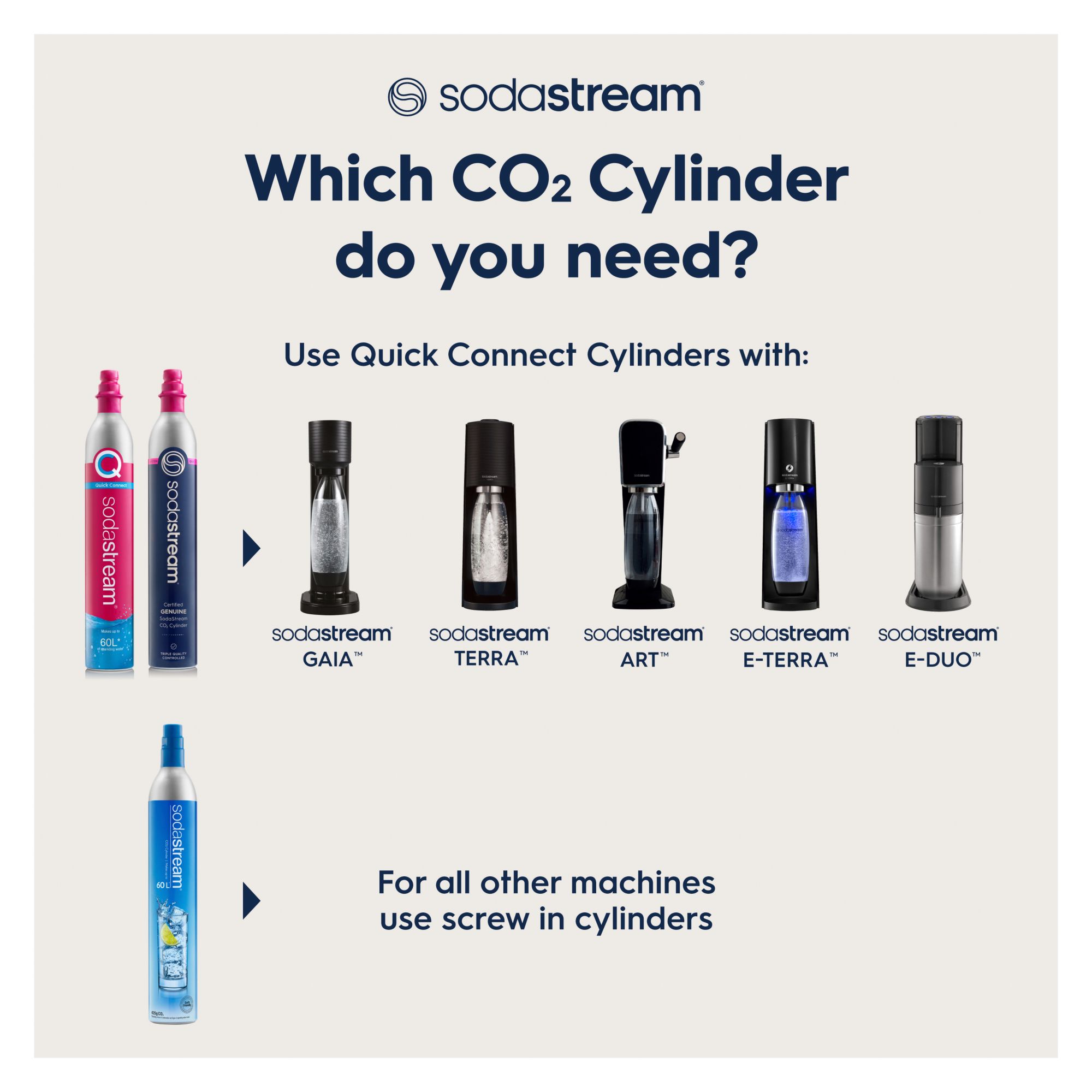 Carbonating Bottles are Dishwasher Safe and made from BPA-free plastic Terra machine is only compatible with pink Quick Connect CO2 Cylinder A SodaStream cylinder makes up to 60L (126 bottles) of sparkling water The Bundle includes everything needed to start sparkling today - just add water Terra machine is only compatible with pink Quick Connect CO2 Cylinder. A SodaStream cylinder makes up to 60L (126 bottles) of sparkling water Includes (1) Terra Sparkling Water Maker, (2) Pink Quick Connect 60L CO2 Cylinder and (1) 1L Dishwasher Safe Carbonating Bottle*