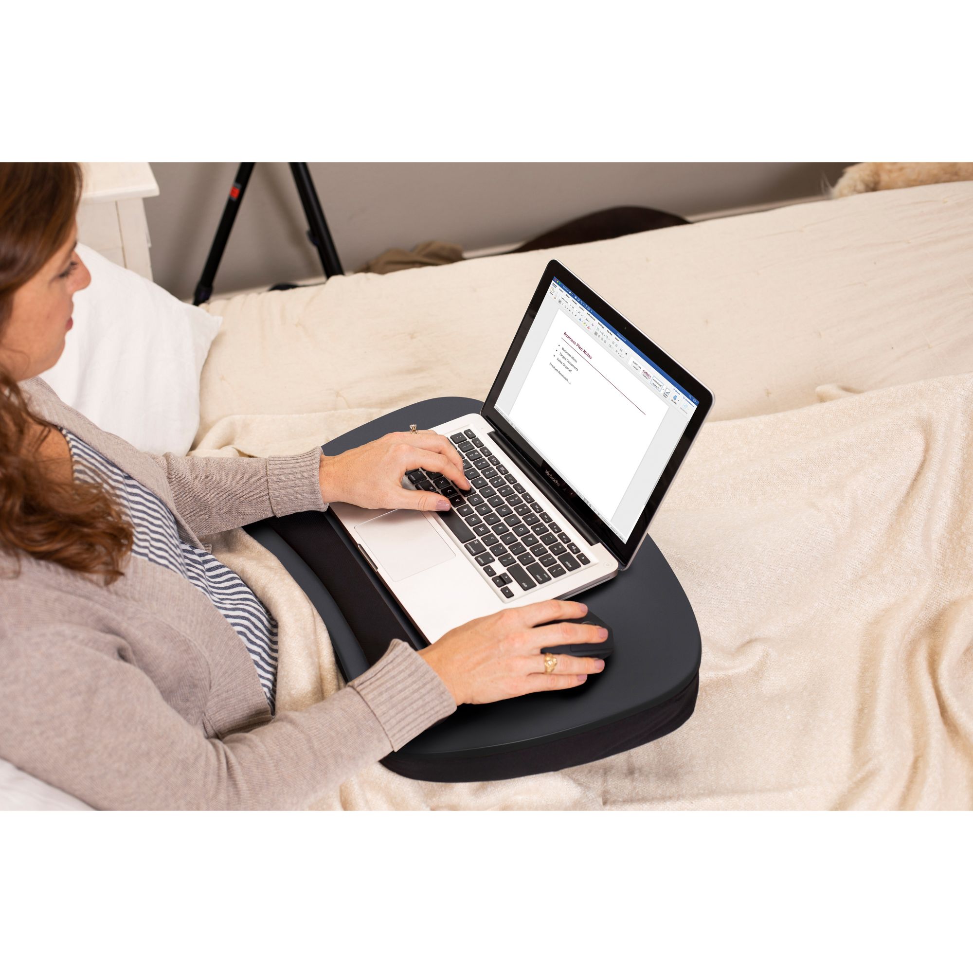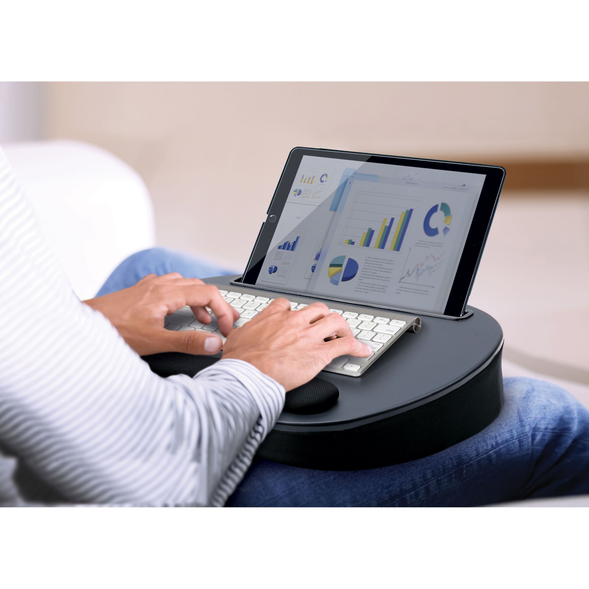 The Sofia+Sam Simple Memory Foam Lap Desk is a great portable work station and is perfect for laptop computers, tablets, books, etc. It features a high-quality, comfy memory foam pillow for superior comfort. The wrist rest provides added support and keeps your hands at the perfect angle for typing.  It also helps to keep your laptop or book from sliding down. This lap desk can accommodate laptop computers up to 15" and the tablet slot is wide enough to hold larger tablets or can hold a phone. It also has a handle for easy transport. This item is perfect for working from home and school work. Its great for use on the couch, in bed or any place you choose to work! The lap desk measures 18.5" wide x 14" deep x 3.5" high and weighs 5 lbs. The lightweight design makes it easy to move or great for travel.