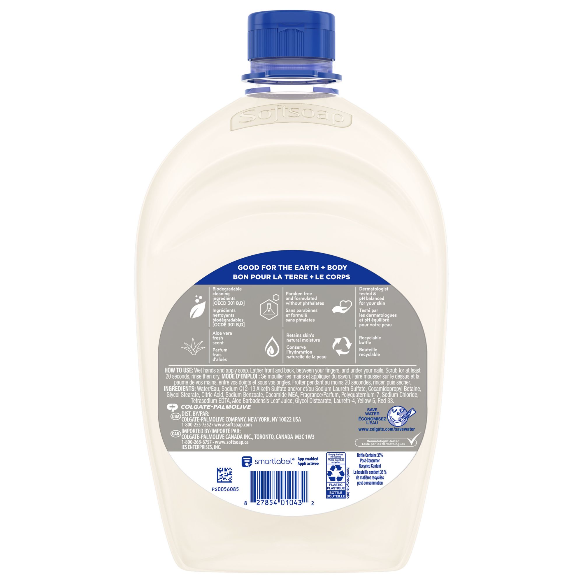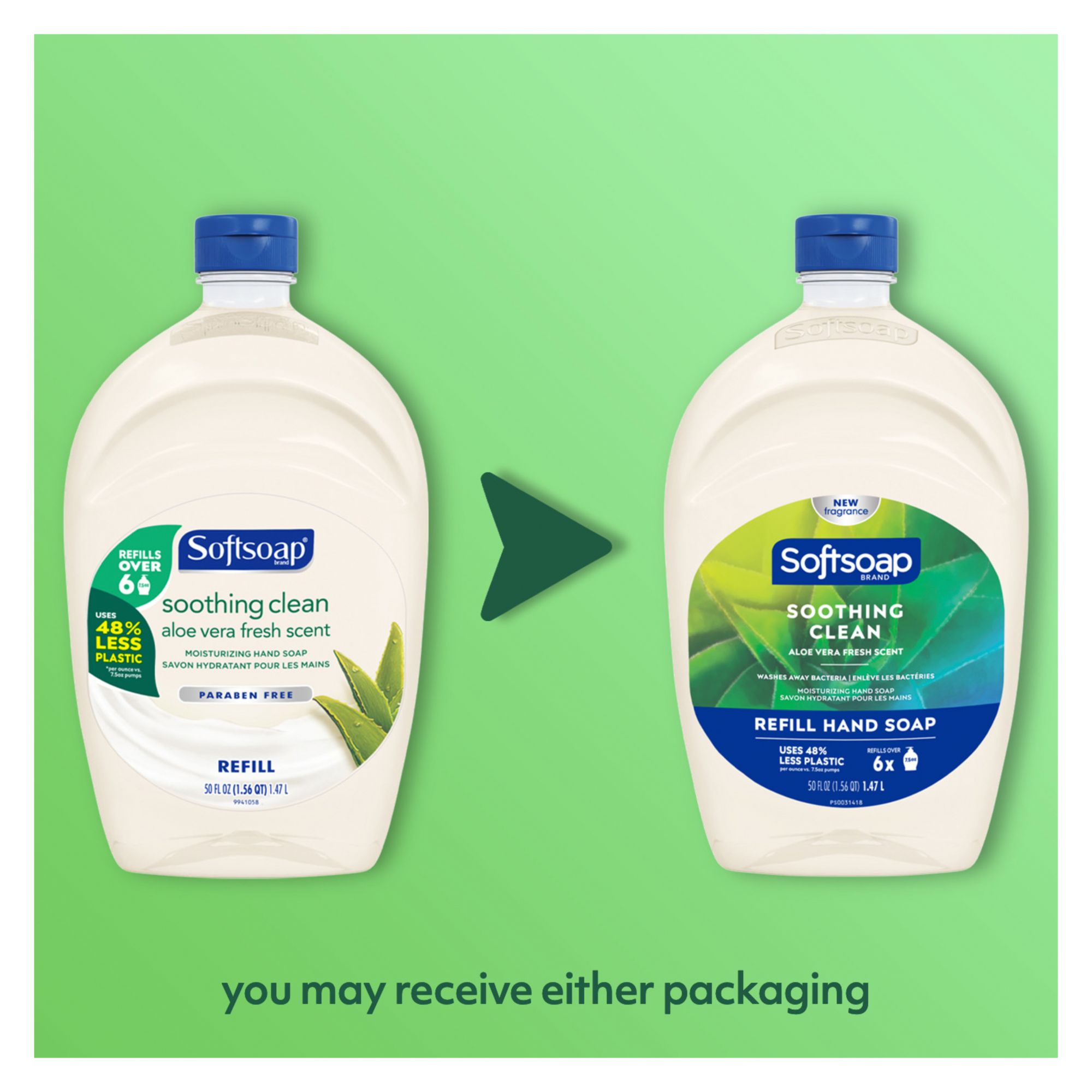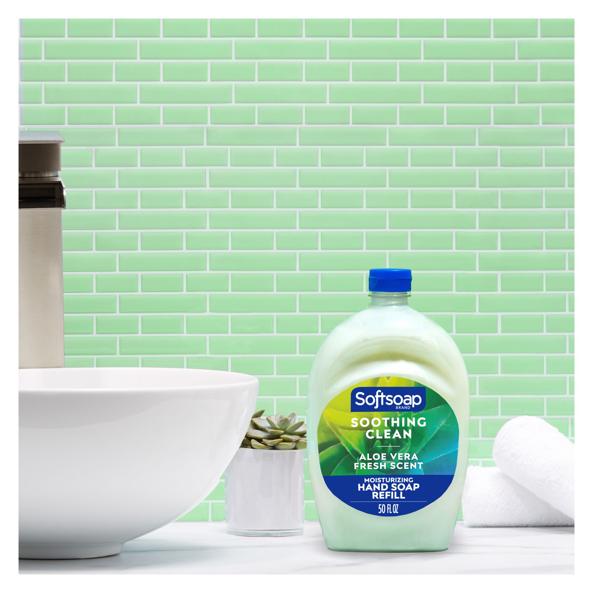Keep your favorite Softsoap Soothing Clean Liquid Hand Soap stocked and ready for use. As the #1 liquid hand soap brand (1), Softsoap delivers an uplifting experience with each use. Give your hands a clean and fresh experience with our convenient refill size - perfect for refilling your soap dispensers. Each refill bottle holds enough liquid to refill a standard 7.5 oz. liquid hand soap pump bottle over 6x. Our Soothing Clean Aloe Vera Fresh Scent hand soap not only provides a refreshing scent, but it also washes away bacteria, leaving your hands feeling clean. It effectively removes dirt, grease, grime, oil, and food. Our hand soap is dermatologist-tested and helps retain your skin's natural moisture, leaving your skin feeling soft and smooth. It is also paraben-free and made without phthalates. Softsoap liquid hand soap is perfect for refilling your bathroom soap bottles or to use as a kitchen hand soap bottle. Embrace the Soothing Aloe Vera scent by keeping a liquid hand soap refill bottle on hand so you can infuse every small moment with joy. (1) Based in part on data reported by Nielsen through its Market Track Service for the Liquid Hand Soap Category for the 52-week period ending 02/14/25, for the All Outlet market. Copyright © 2025 Nielsen.
