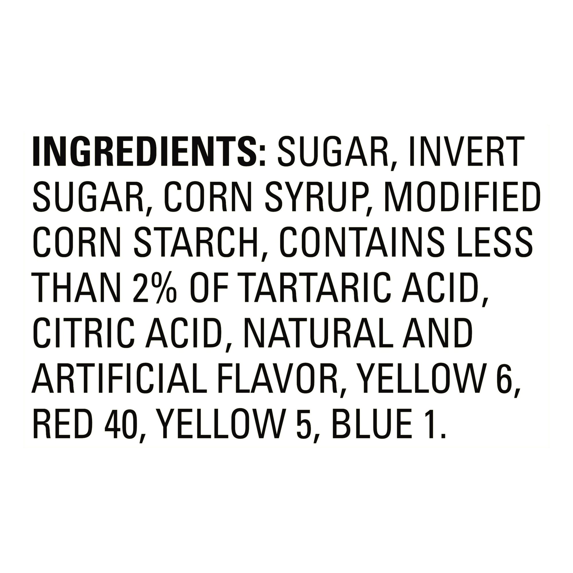 Ingredients: Sugar, Invert Sugar, Corn Syrup, Modified Corn Starch, Contains Less Than 2% Of Tartaric Acid, Citric Acid, Natural And Artificial Flavor, Yellow 6, Red 40, Yellow 5, Blue 1.