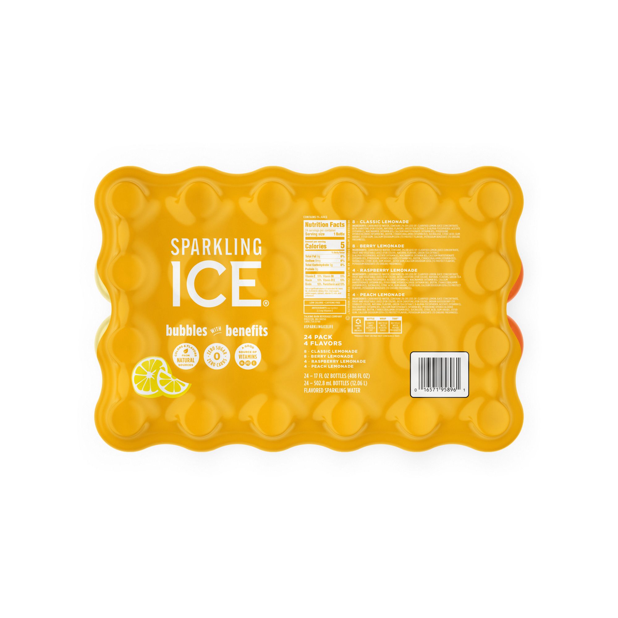 Sparkling Ice's Lemonade Variety 12-Pack provides fans with a convenient, lemonade-themed variety pack. The new optimized flavor mix includes Classic Lemonade, Berry Lemonade, and two new flavors: Raspberry Lemonade & Peach Lemonade! Sparkling Ice is a fizzy, flavorful sparkling water, without all the calories. Sparkling Ice flavored sparkling water contains 0g sugar, only 5 calories per bottle, and 0g carbs. Made with better-for-you ingredients, this low-calorie carbonated water is bursting with real fruit flavor, is made with colors from natural sources, and contains vitamins and antioxidants. The product ships in a pack of 12 bottles. Each sparkling water bottle contains 17 fl. oz.