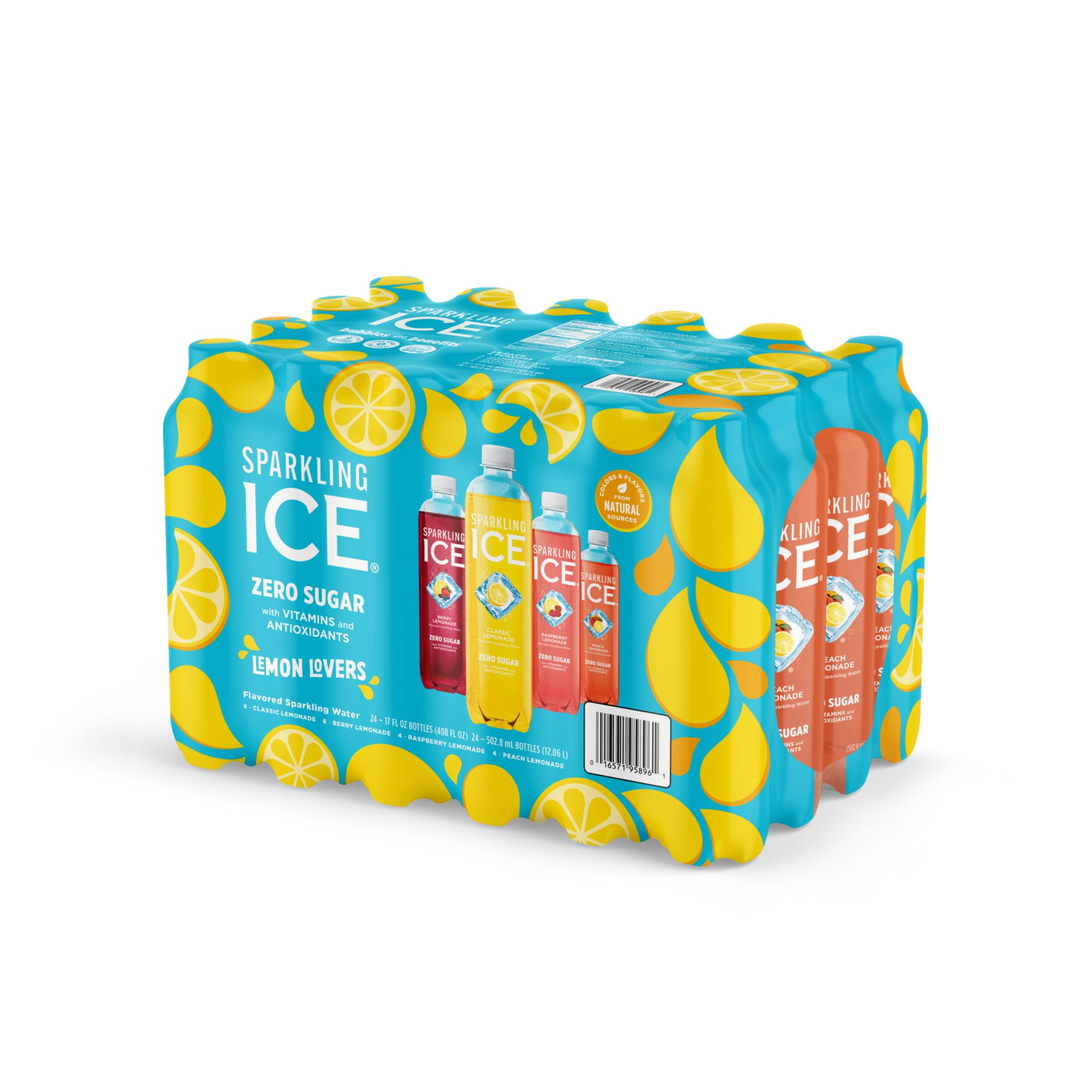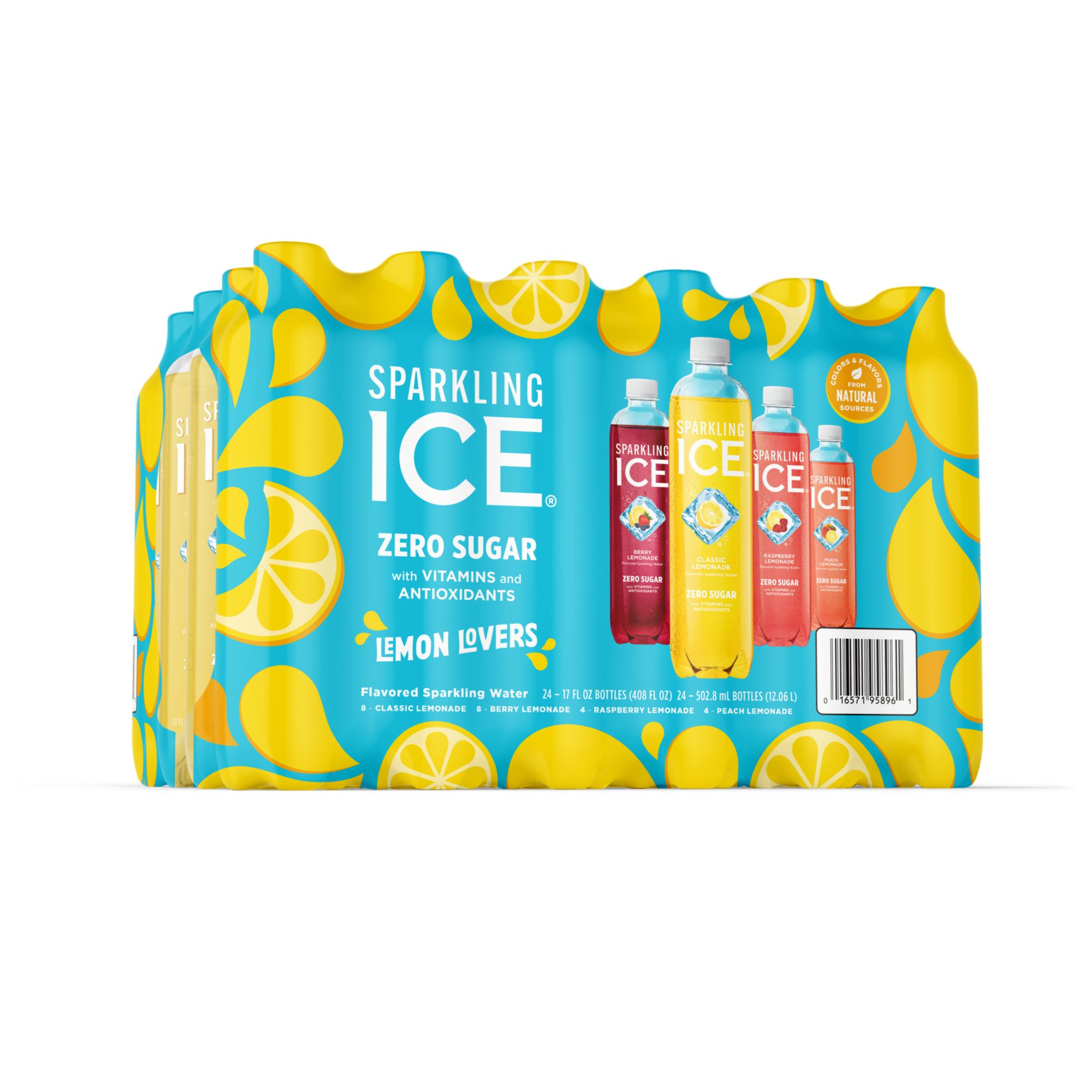 Sparkling Ice's Lemonade Variety 12-Pack provides fans with a convenient, lemonade-themed variety pack. The new optimized flavor mix includes Classic Lemonade, Berry Lemonade, and two new flavors: Raspberry Lemonade & Peach Lemonade! Sparkling Ice is a fizzy, flavorful sparkling water, without all the calories. Sparkling Ice flavored sparkling water contains 0g sugar, only 5 calories per bottle, and 0g carbs. Made with better-for-you ingredients, this low-calorie carbonated water is bursting with real fruit flavor, is made with colors from natural sources, and contains vitamins and antioxidants. The product ships in a pack of 12 bottles. Each sparkling water bottle contains 17 fl. oz.
