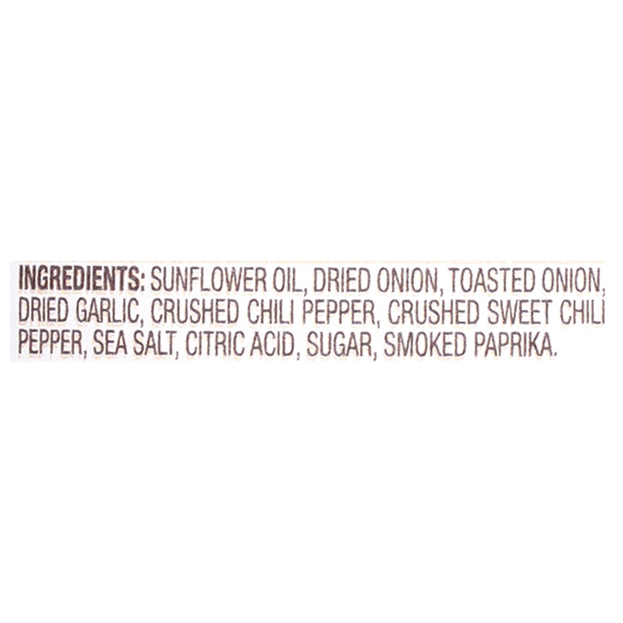 Ingredients: Sunflower Oil, Dried Onion, Toasted Onion, Dried Garlic, Crushed Chili Pepper, Crushed Sweet Chili Pepper, Sea Saalt, Citiric Acid, Sugar, Smoked Paprika