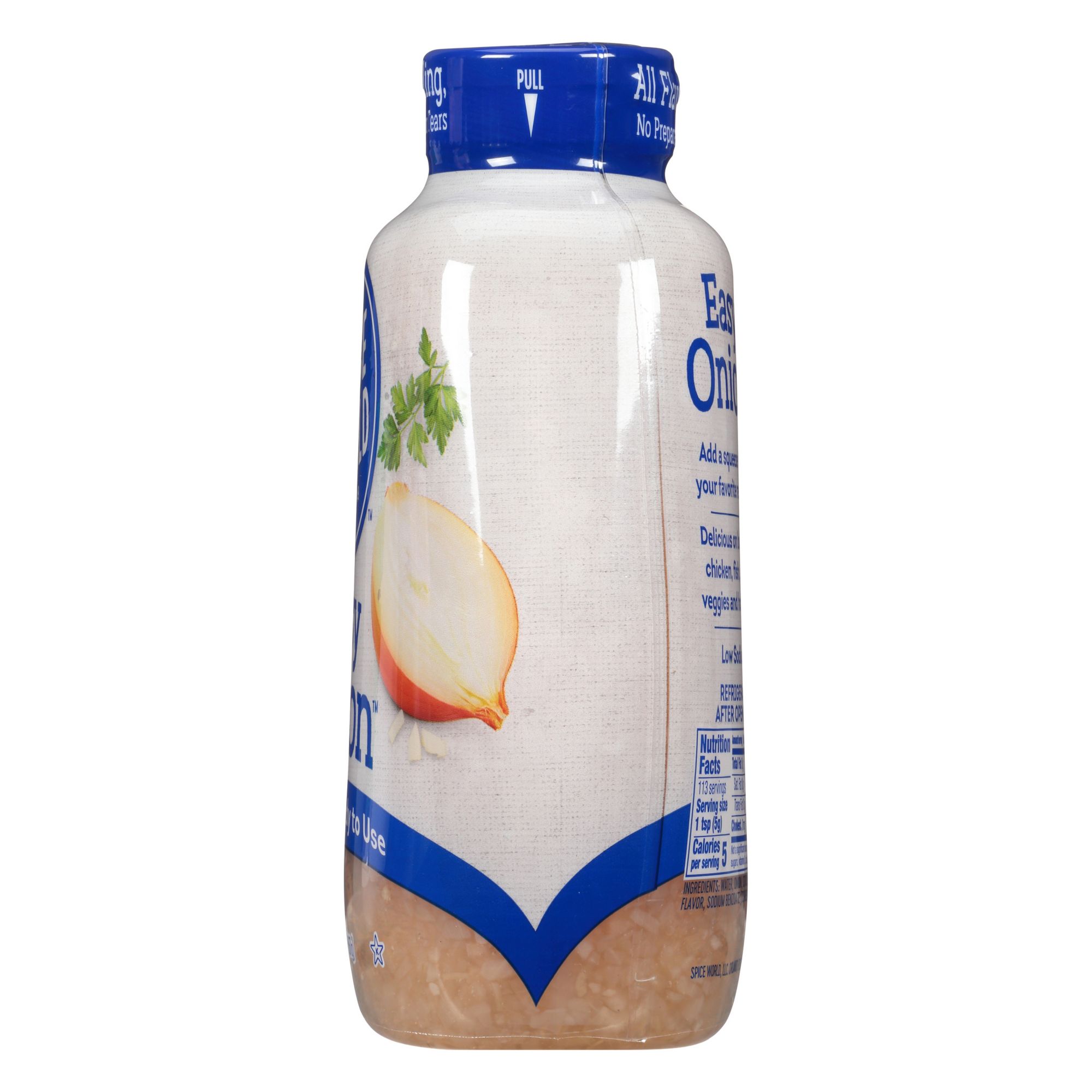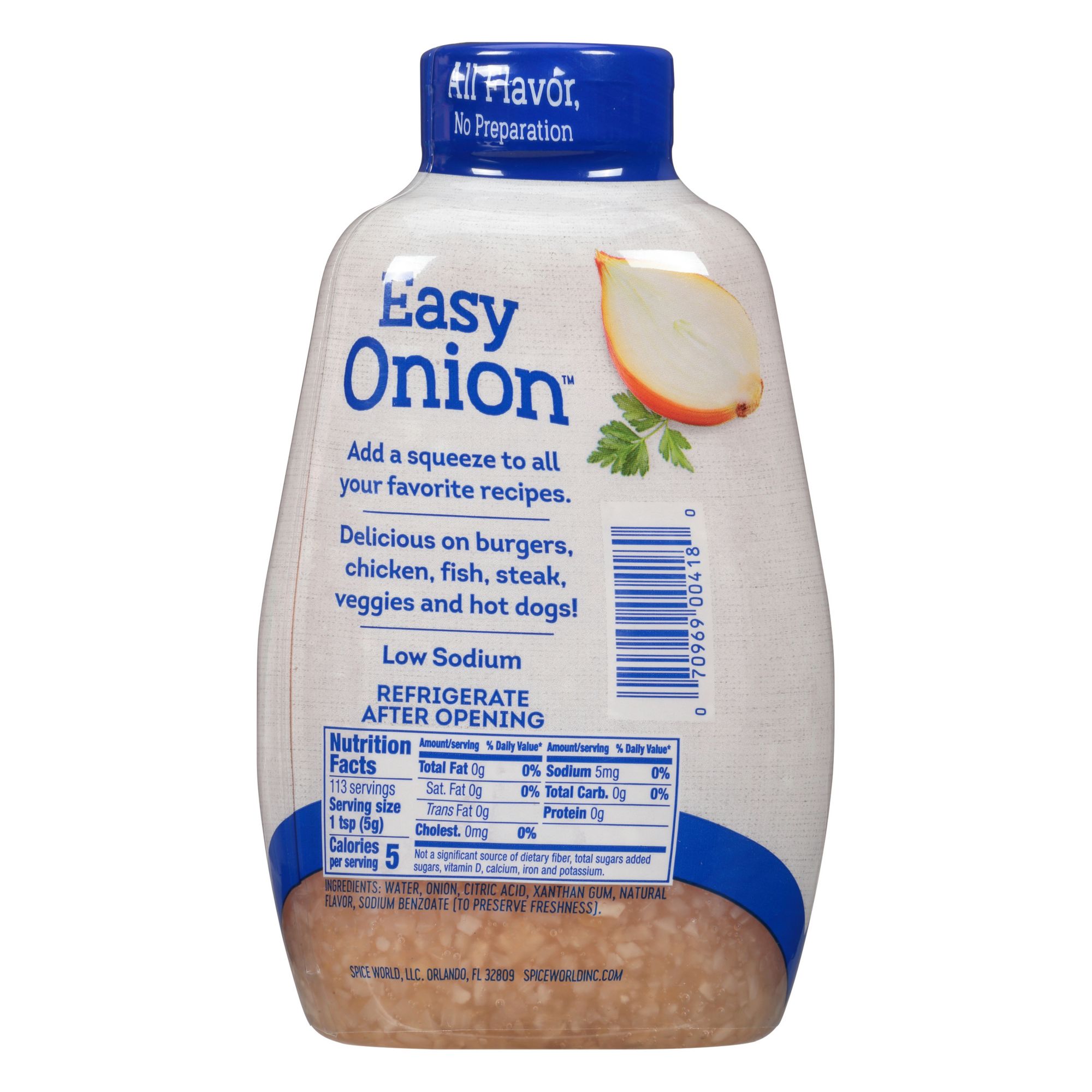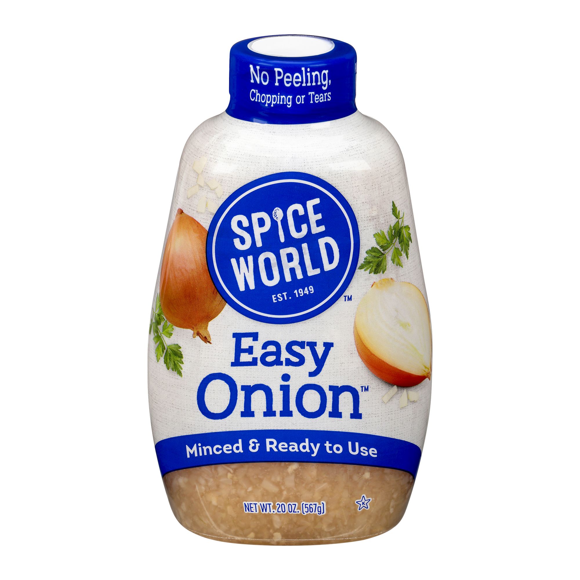 Spice World Easy Onion Squeeze is minced and ready to Use. No peeling, chopping, or tears. Onions are a staple ingredient, but preparing them can be messy, and time-consuming. Easy Onion is a convenient squeeze bottle perfect as a condiment or use in cooking. Add a squeeze to all your favorite recipes. Delicious on burgers, chicken fish, steak, veggies, and hot dogs. The portable solution is perfect for parties, cookouts, tailgates, picnics, or barbeques.