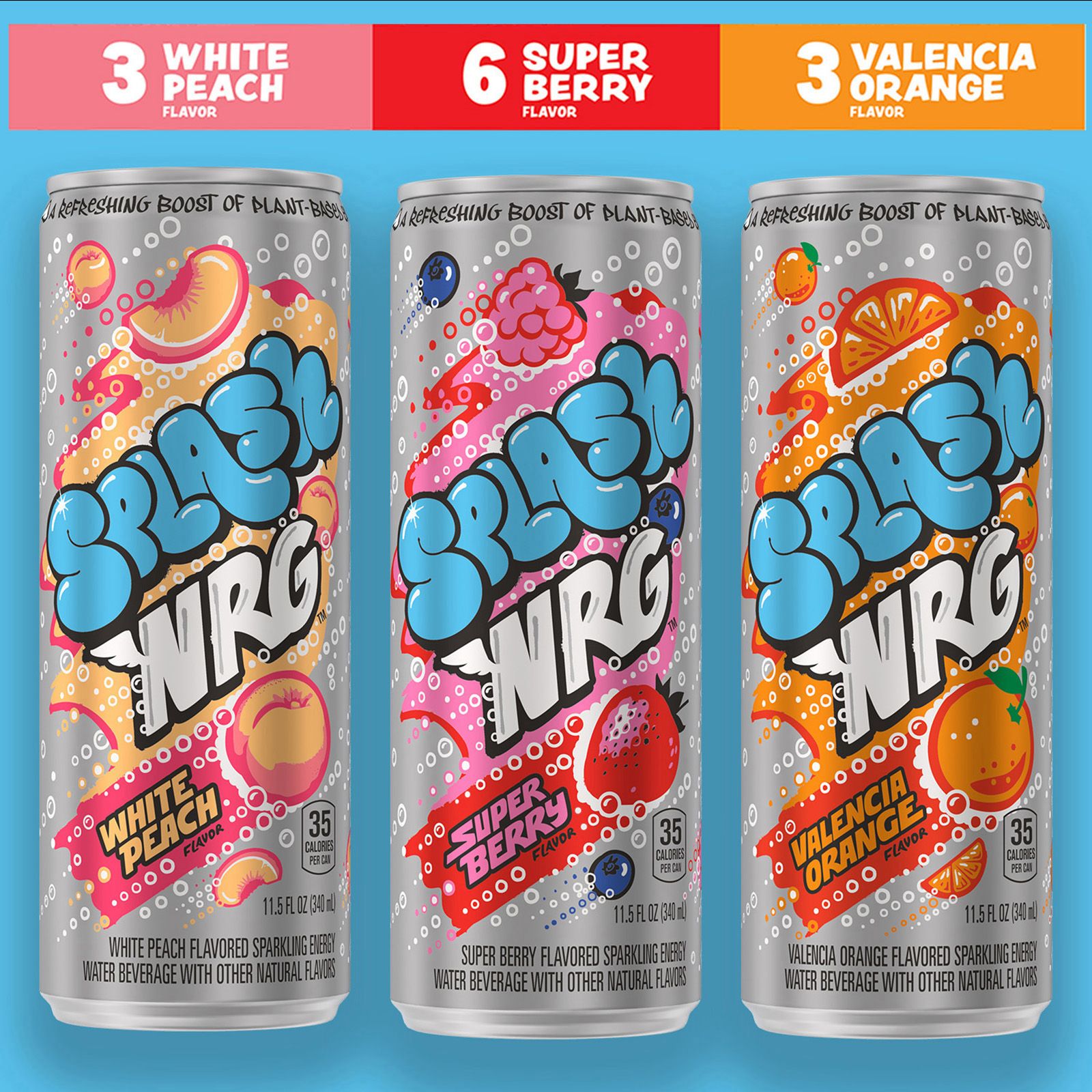 12 pk. variety power-up: fuel up for fun with the rainbow variety pack featuring delicious super berry, valencia orange, and white peach flavors Own your day with fruity flavor: sparkling water and a splash of caffeine mixed with fruity flavor to boost your energy Fuel your fun: each 11.5 fl. oz. splash NRG sparkling energy water beverage is easy to grip - with a sleek can for at-home or on-the-go power-ups Try a refreshing boost of plant-based energy: made with caffeine from green tea extract and inspired by nature for an alternative to other energy drinks Just enough NRG to keep your cool: 75mg caffeine for just enough NRG to keep your cool good source of zinc & magnesium electrolytes: and just 35 calories per can for a boost of refreshing energy on the go Includes 6-11.5 fl. oz. can super berry flavor, 3-11.5 fl. oz. cans valencia orange flavor, and 3-11.5 fl. oz. cans white peach flavor