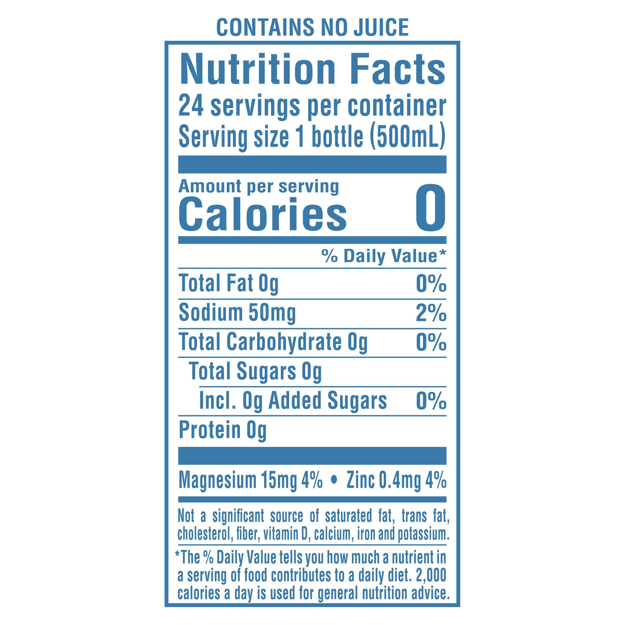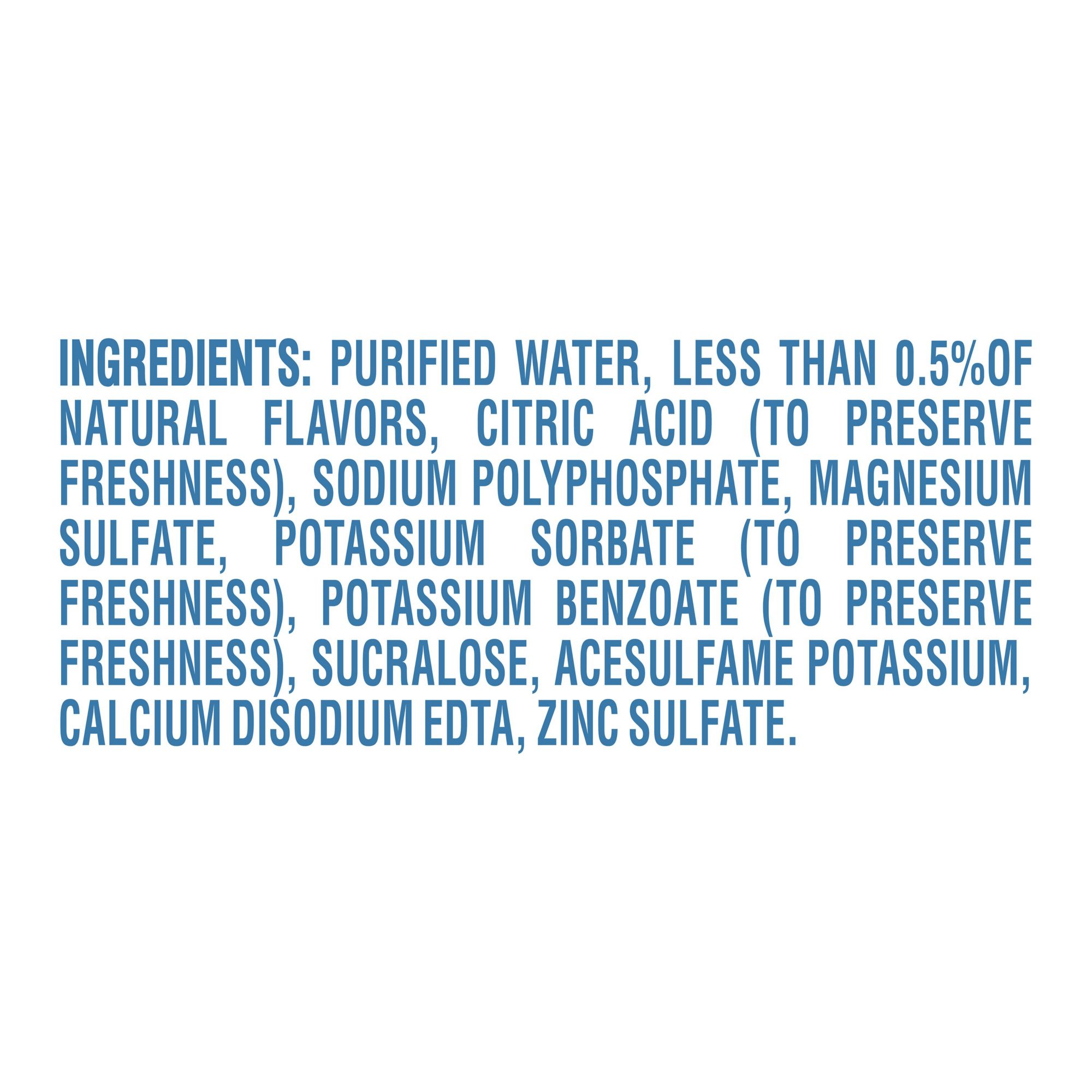 Ingredients: Purified Water, Less than 0.5% of Natural Flavors, Citric Acid (to Preserve Freshness), Sodium Polyphosphate, Magnesium Sulfate, Potassium Sorbate (to Preserve Freshness), Potassium Benzoate (to Preserve Freshness), Sucralose, Acesulfame Potassium, Calcium Disodium EDTA, Zinc Sulfate