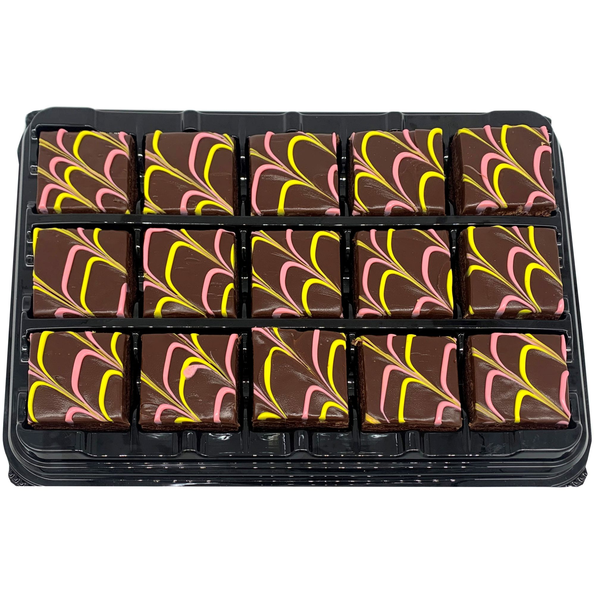 This Spring Fudge Brownie Platter features delicious chocolatey fudge brownies iced with colorful seasonal drizzles. These fudge brownies will satisfy any sweet tooth and make for a delectable dessert for any occasion. Each tray includes 15 fudge brownies.