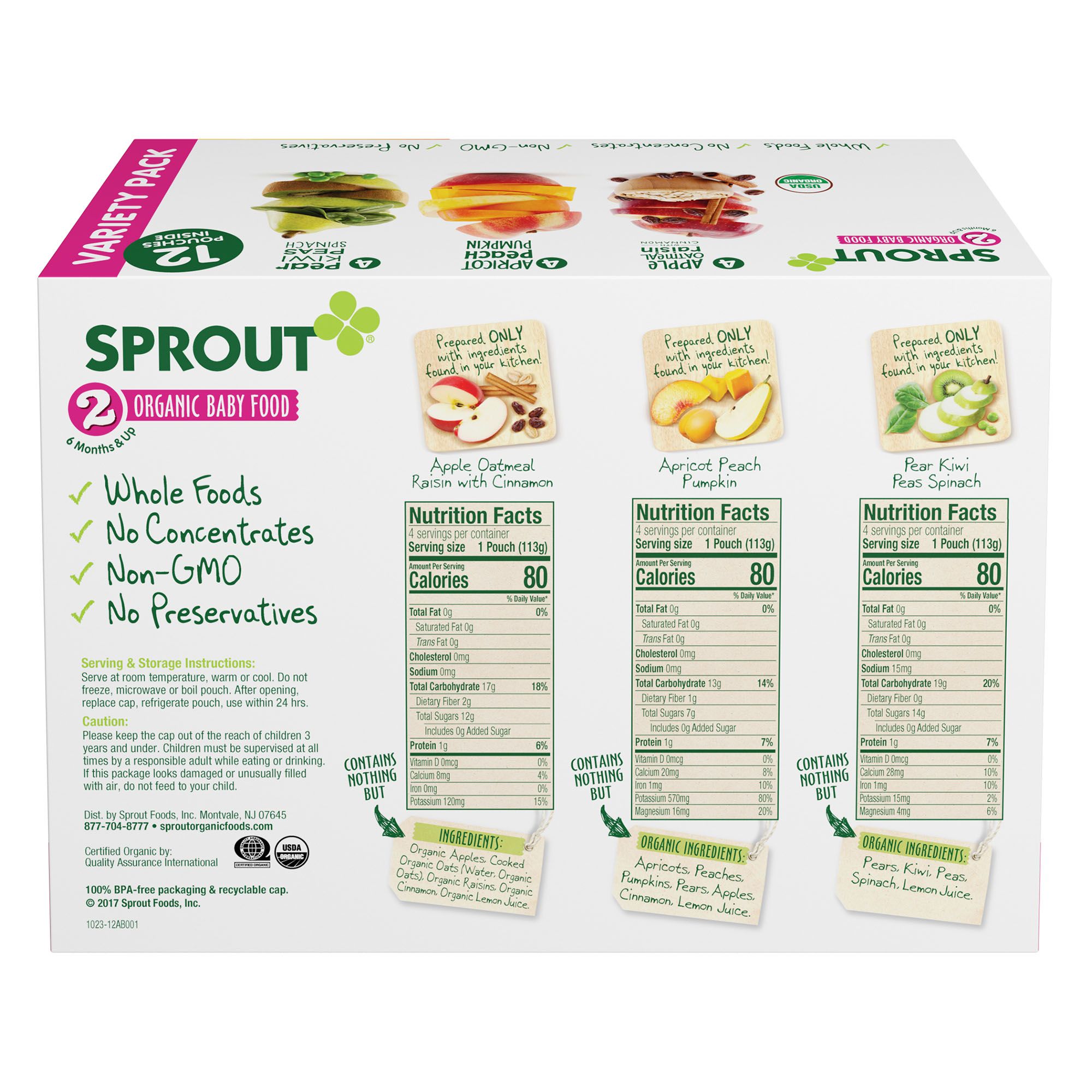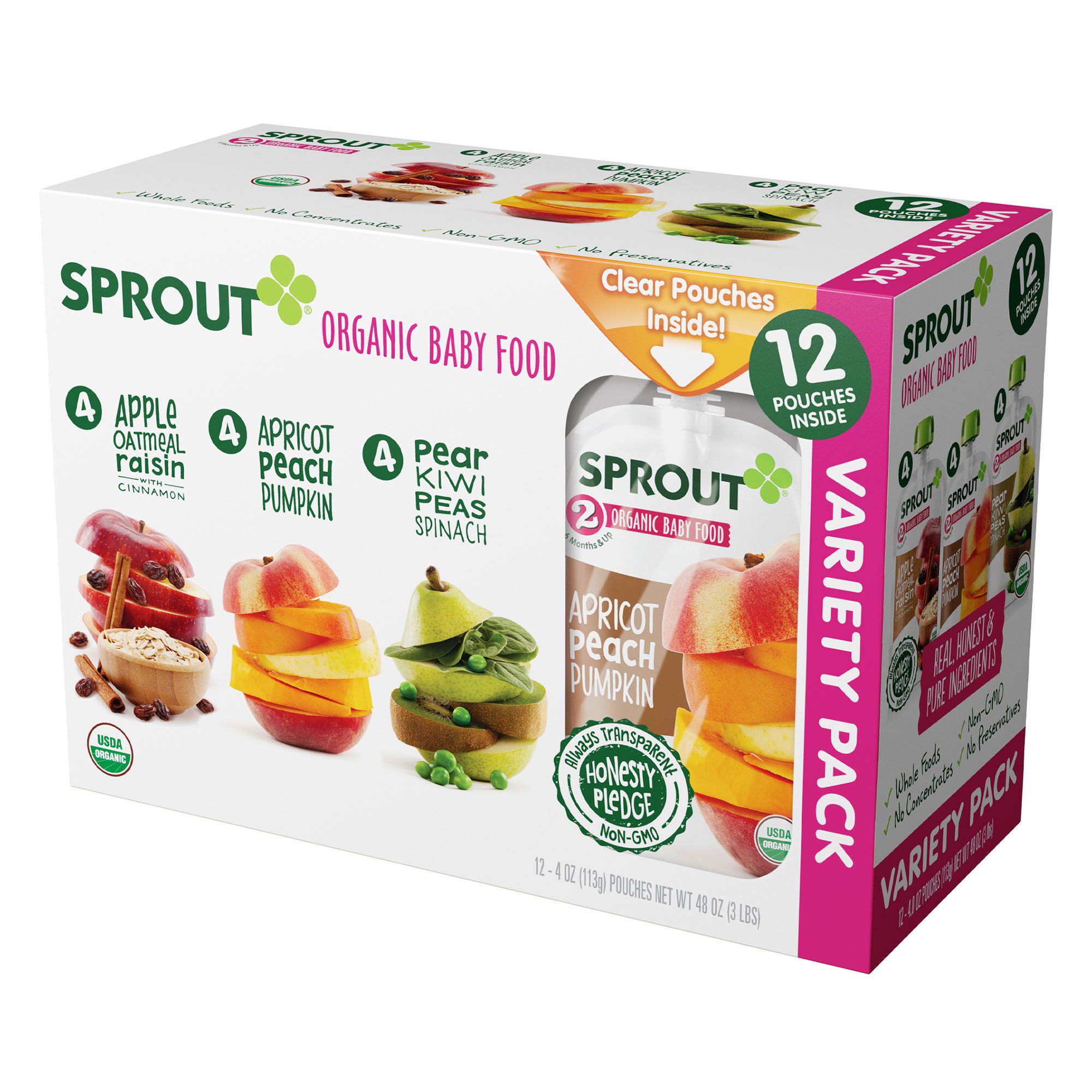 Includes twelve 4-oz. pouches of baby food (4 Apple Oatmeal Raisin, 4 Apricot Peach Pumpkin and 4 Pear Kiwi Peas Spinach)