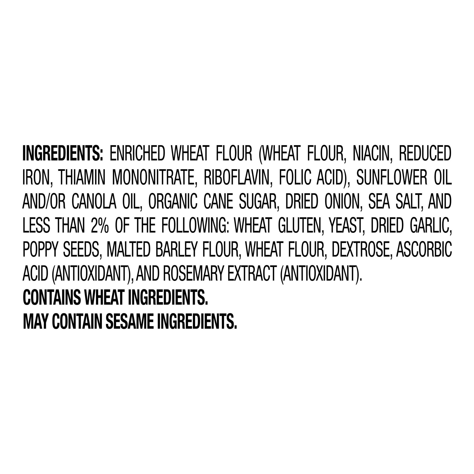 Ingredients: Enriched Wheat Flour (Wheat Flour, Niacin, Reduced Iron, Thiamin Mononitrate, Riboflavin, Folic Acid), Sunflower Oil And/Or Canola Oil, Organic Cane Sugar, Dried Onion, Sea Salt, And Less Than 2% Of The Following: Wheat Gluten, Yeast, Dried Garlic, Poppy Seeds, Malted Barley Flour, Wheat Flour, Dextrose, Ascorbic Acid (Antioxidant), And Rosemary Extract (Antioxidant). Contains Wheat Ingredients. May Contain Sesame Ingredients.