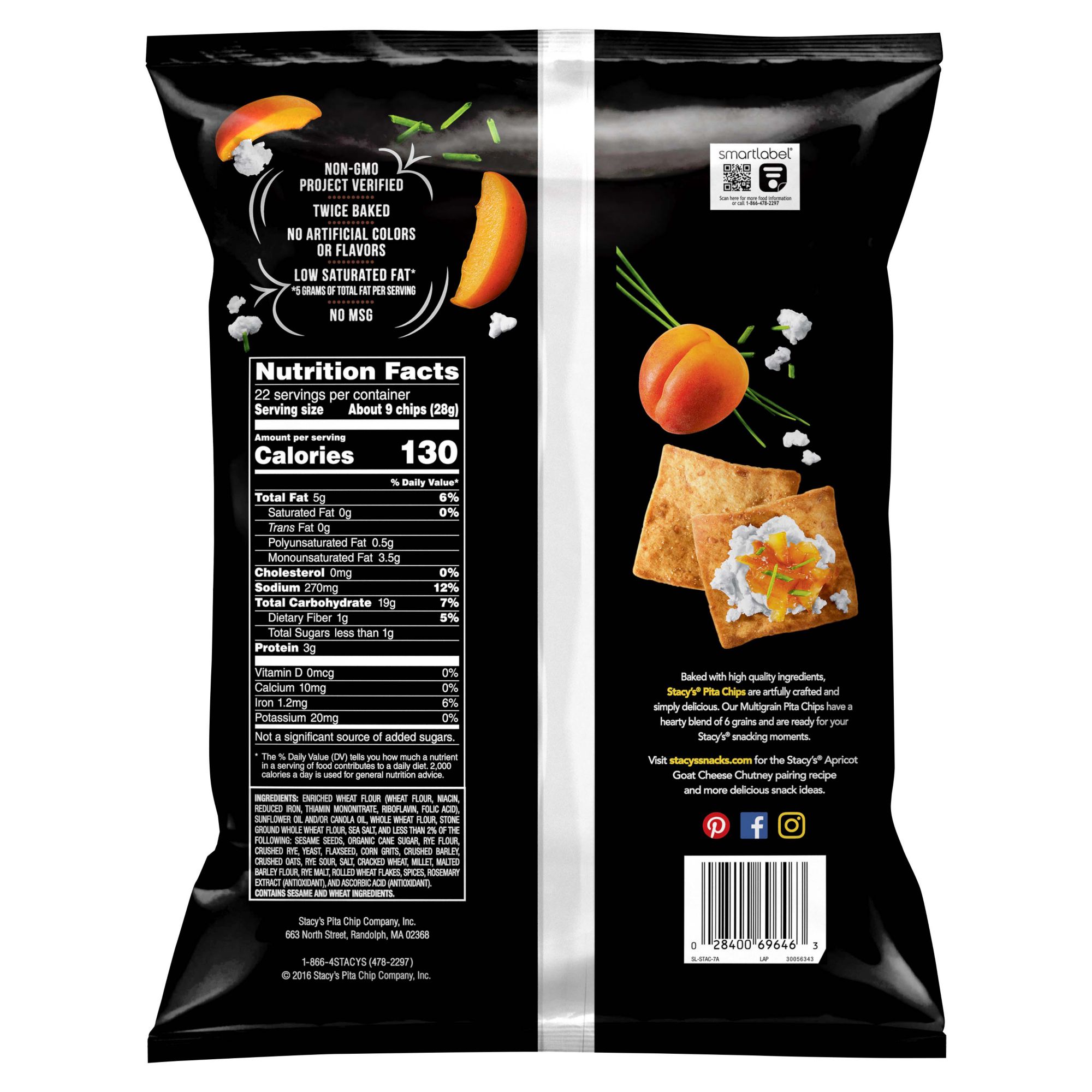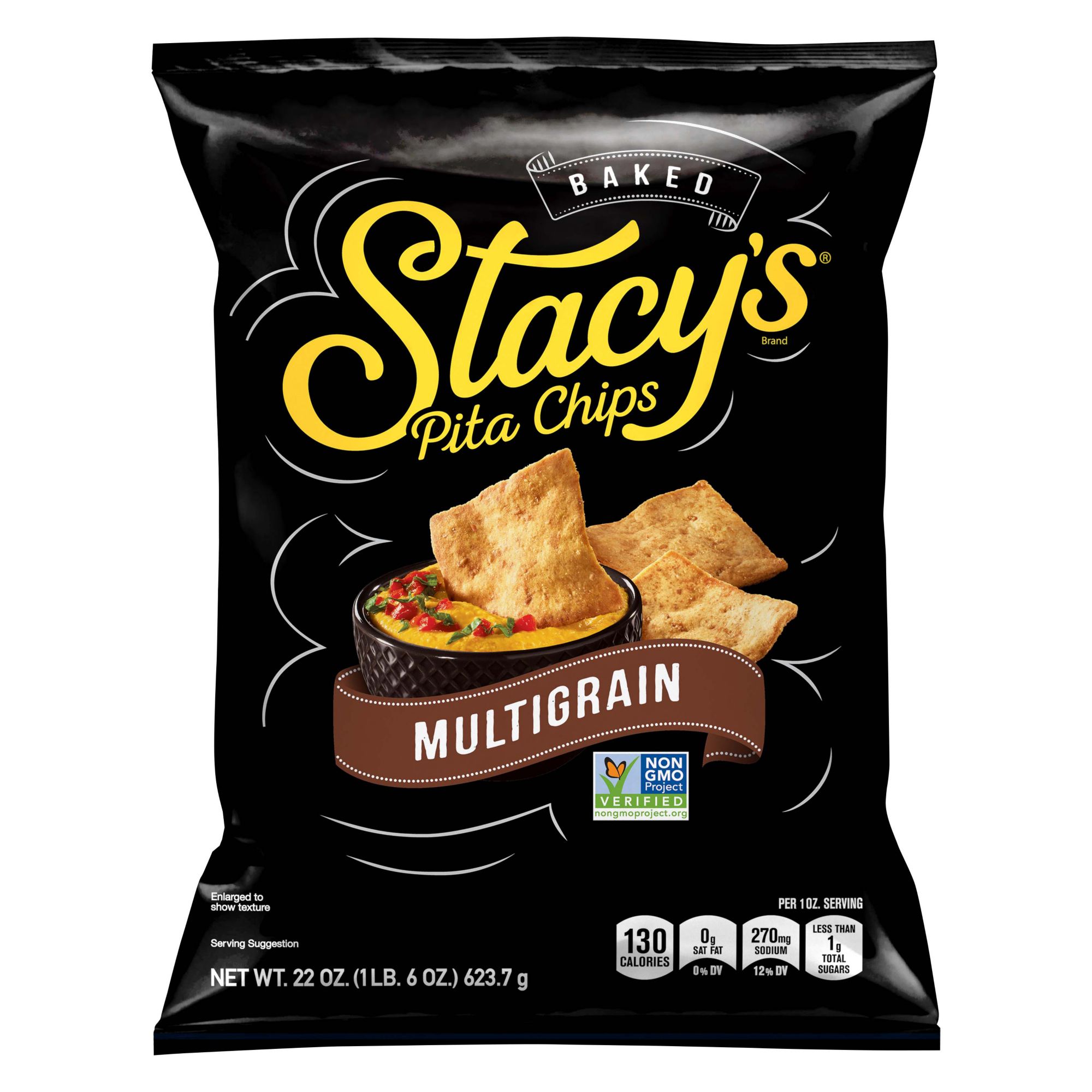 Crunchy baked multi-grain pita chips Delicious alone or paired with fresh fruit, cheeses, hummus or dips Non-GMO project verified Twice baked No artificial colors or flavors No MSG Includes 22 oz. bag of stacy's multigrain pita chips