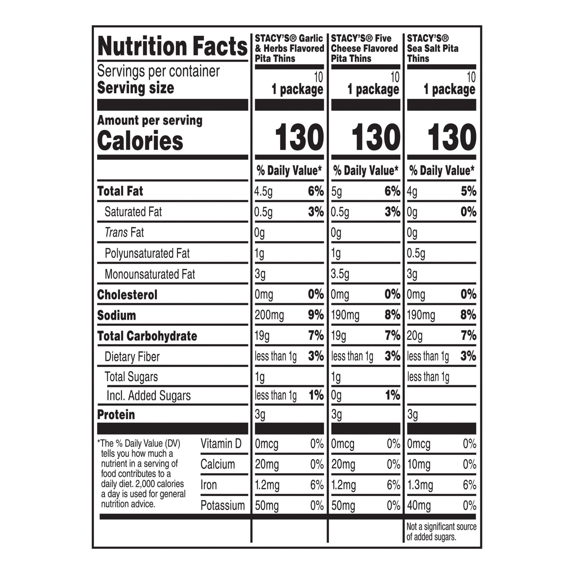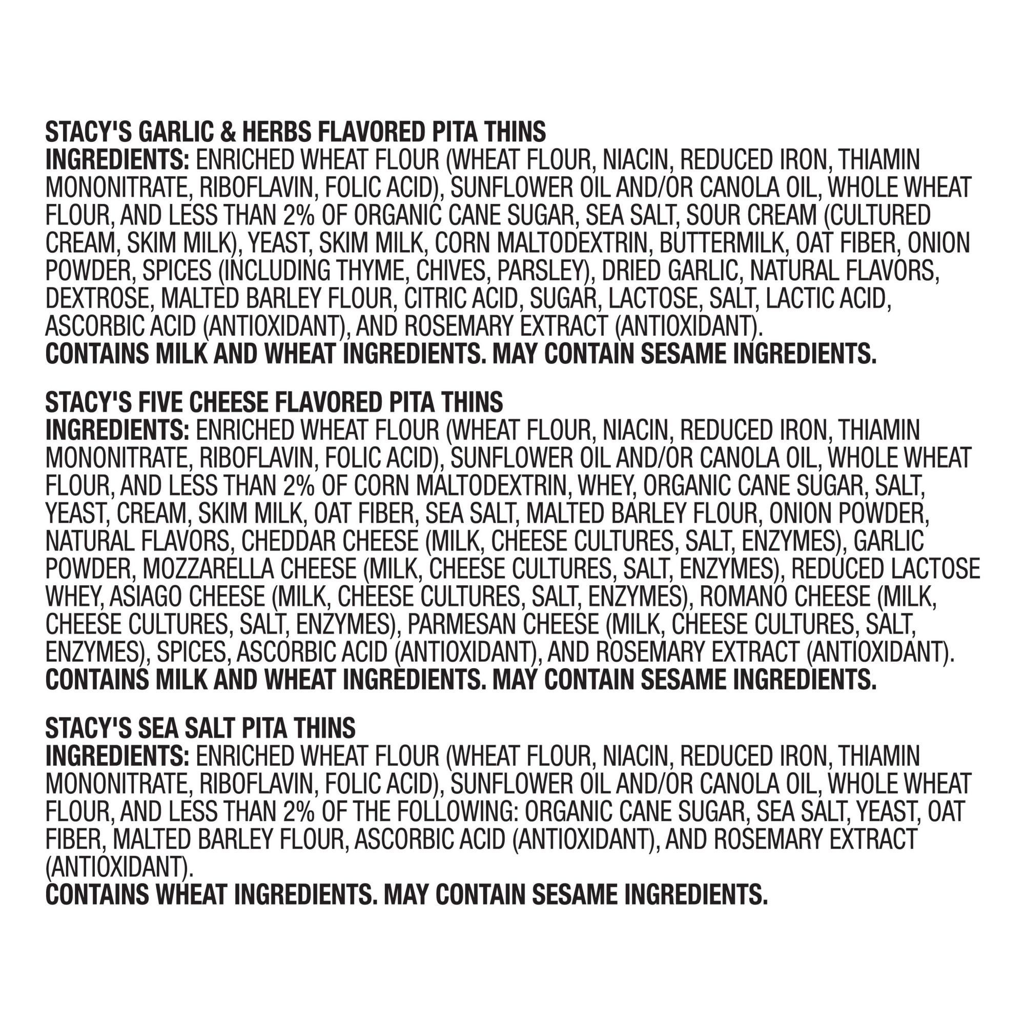 Ingredients: Stacy's Pita Thins Sea Salt: Enriched Wheat Flour(wheat Flour, Niacin, Reduced Iron, Thiamin Mononitrate, Riboflavin, Folic Acid), Sunflower And/or Canola Oil, Whole Wheat Flour, And Less Than 2% Of The Following: Sea Salt, Organic Cane Sugar, Oat Fiber, Yeast Malted Barley Flour, Rosemary Extract (Antioxidant), And Ascorbic Acid (Antioxidant). Contains Wheat Ingredients. Stacy's Pita Thins Garlic & Herbs: Enriched Wheat Flour (Wheat Flour, Niacin, Reduced Iron, Thiamin Mononitrate, Riboflavin, Folic Acid), Sunflower Oil And/or Canola Oil, Whole Wheat Flour, And Less Than 2% Of The Following: Sour Cream (Cultured Cream, Skim Milk), Organic Cane Sugar, Sea Salt, Skim Milk, Maltodextrin (Made From Corn), Buttermilk, Yeast, Oat Fiber, Onion Powder, Spices (Including Chives, Parsley, Thyme), Dried Garlic, Natural Flavors, Dextrose, Malted Barley Flour, Citric Acid, Sugar, Lactose, Salt, Lactic Acid, Rosemary Extract (Antioxidant), And Ascorbic Acid (Antioxidant). Contains Milk And Wheat Ingredients. Stacy's Pita Thins 5 Cheese: Enriched Wheat Flour (Wheat Flour, Niacin, Reduced Iron, Thiamin Mononitrate, Riboflavin, Folic Acid), Sunflower Oil And/or Canola Oil, Whole Wheat Flour, And Less Than 2% Of The Following: Maltodextrin (Made From Corn), Organic Cane Sugar, Whey, Salt, Yeast, Cream, Skim Milk, Oat Fiber, Sea Salt, Onion Powder, Natural Flavor, Cheddar Cheese (Milk, Cheese Cultures, Salt, Enzymes), Garlic Powder, Malted Barley Flour, Mozzarella Cheese (Milk, Cheese Cultures, Salt, Enzymes), Reduced Lactose Whey, Asiago Cheese (Milk, Cheese Cultures, Salt, Enzymes), Romano Cheese (Milk, Cheese Cultures, Salt, Enzymes), Parmesan Cheese (Milk, Cheese Cultures, Salt, Enzymes), Spice, Rosemary Extract (Antioxidant), And Ascorbic Acid (Antioxidant). Contains Milk And Wheat Ingredients.