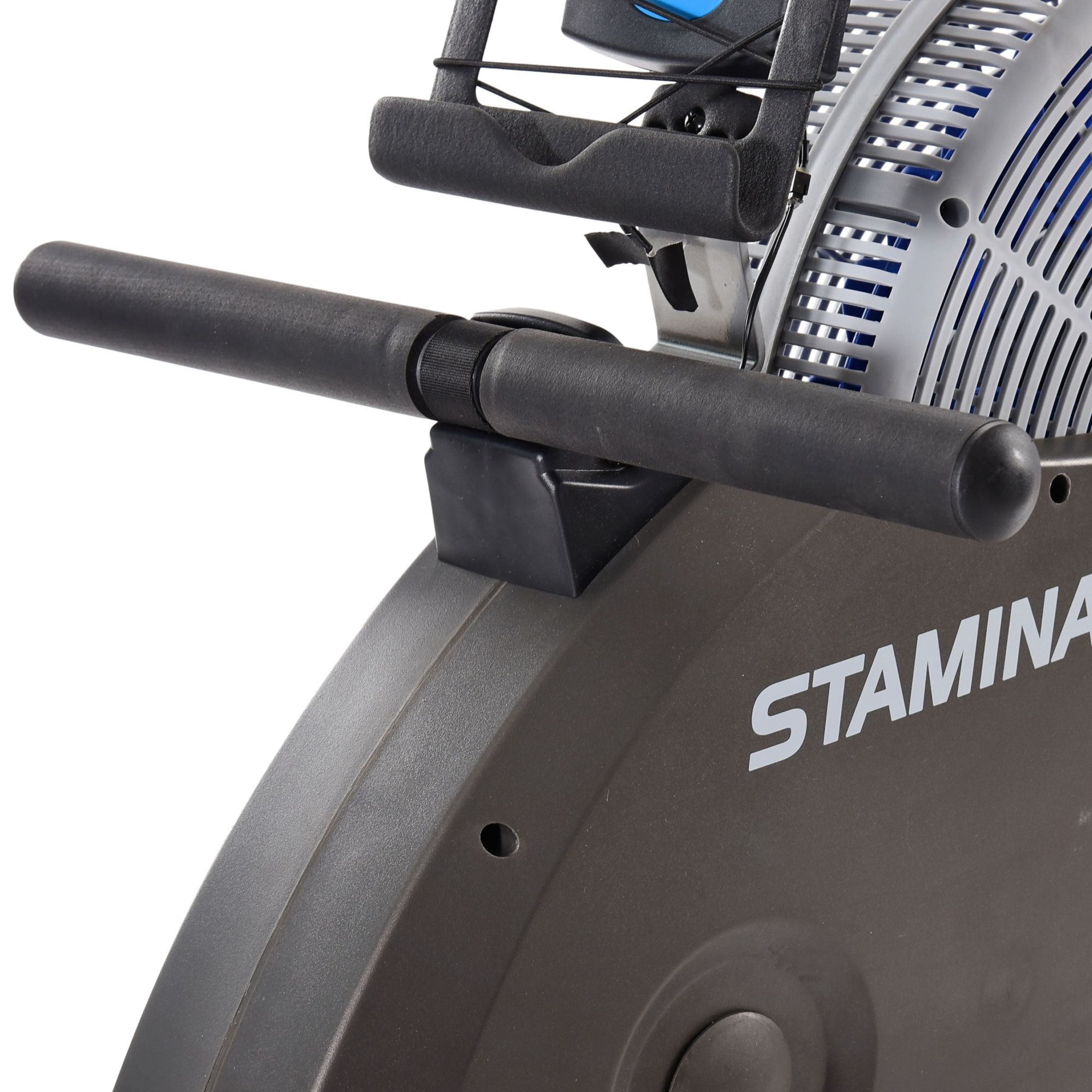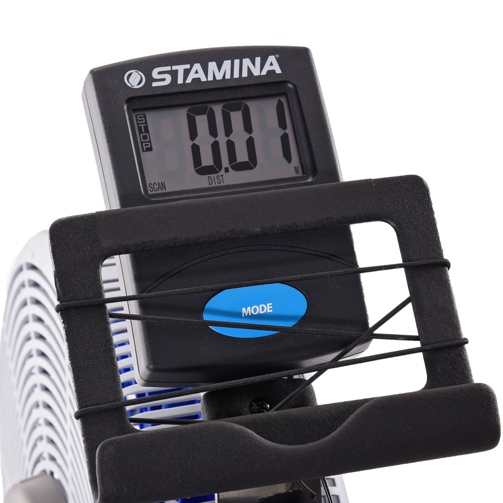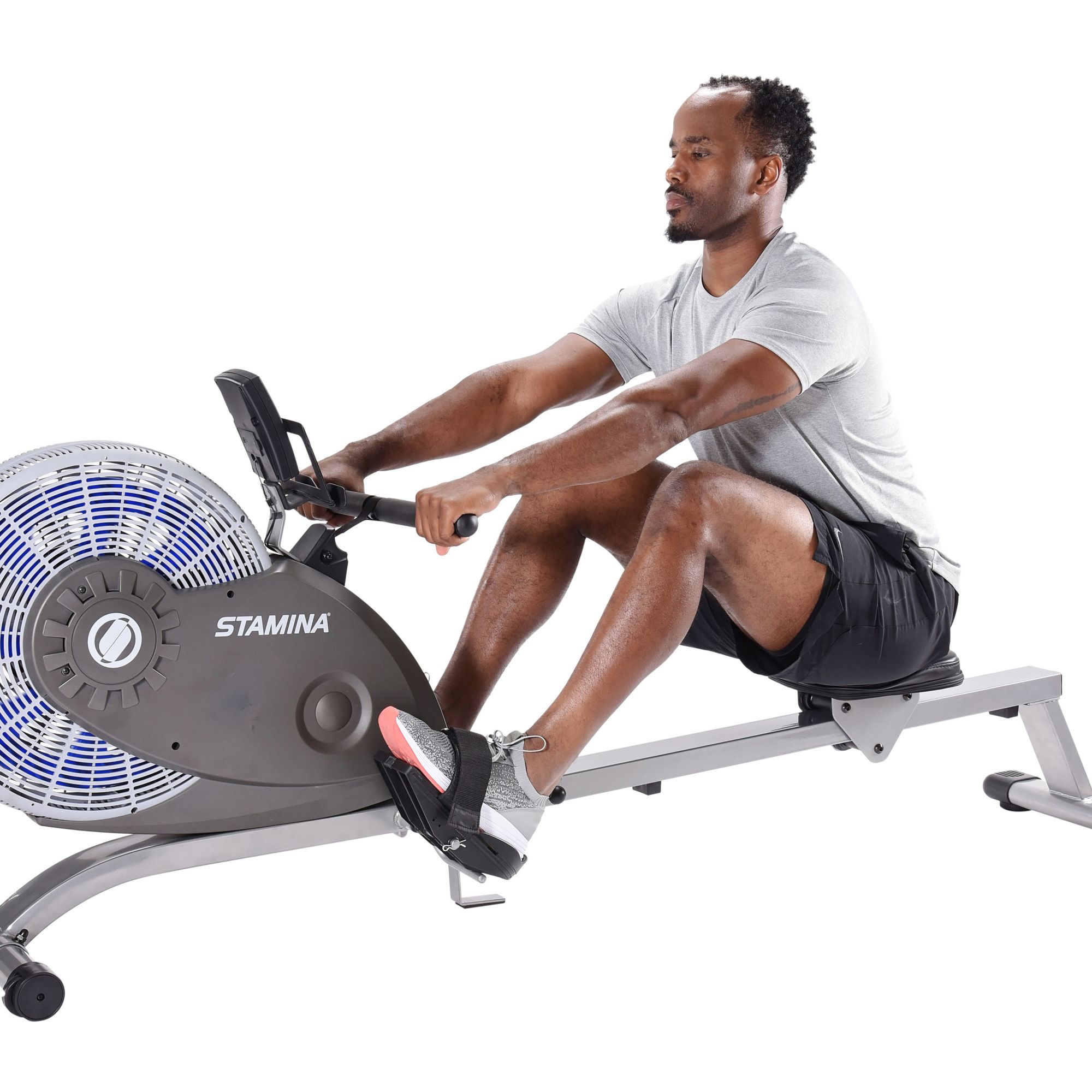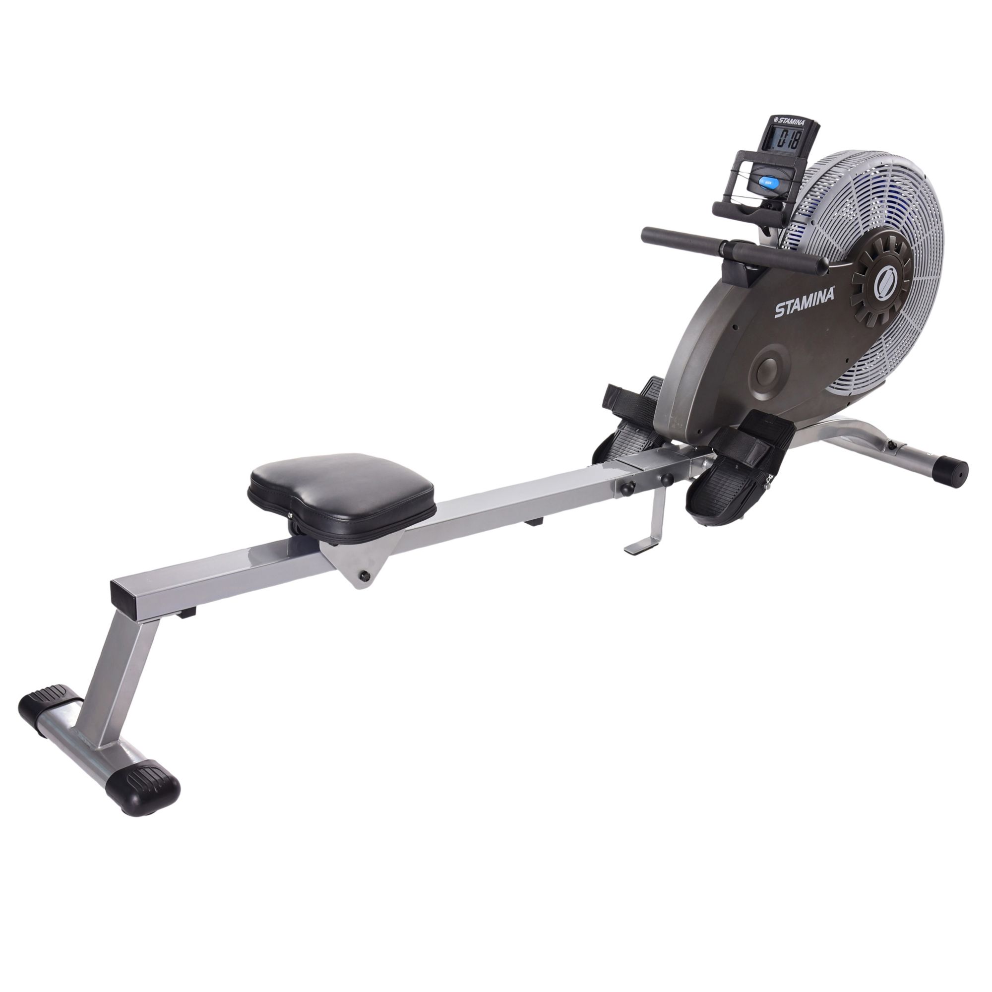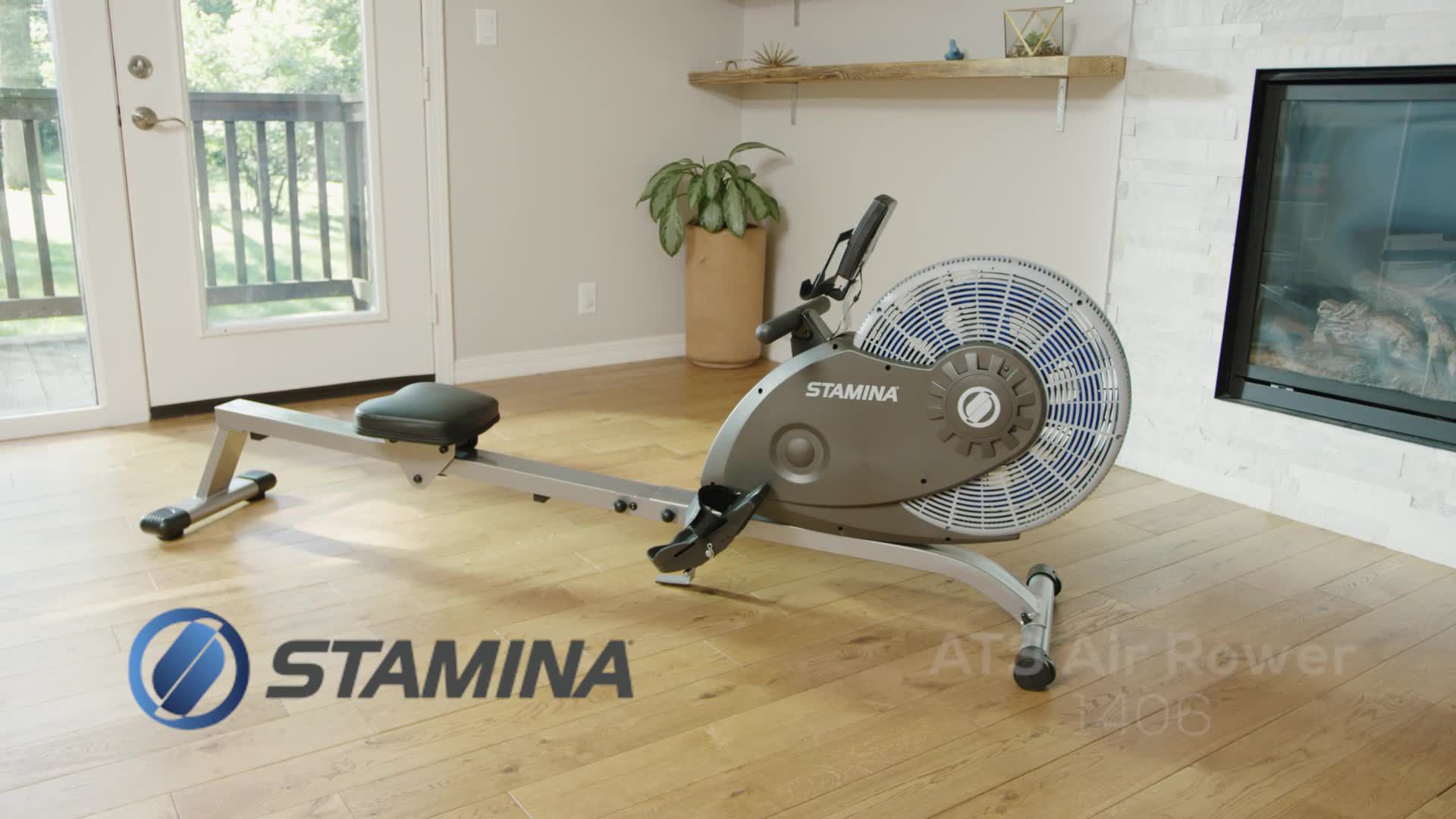 Dynamic air resistance LCD monitor tracks time, speed, distance and calories Cushioned, padded seat Device tray Textured footplates and adjustable straps Padded rowing handle Folding frame with built-in wheels for easy transport Anti-skid endcaps protect floors and keep rower from moving Contains free access to muuv, the smart audio coaching app Includes Stamina ats air rower 1406, user manual