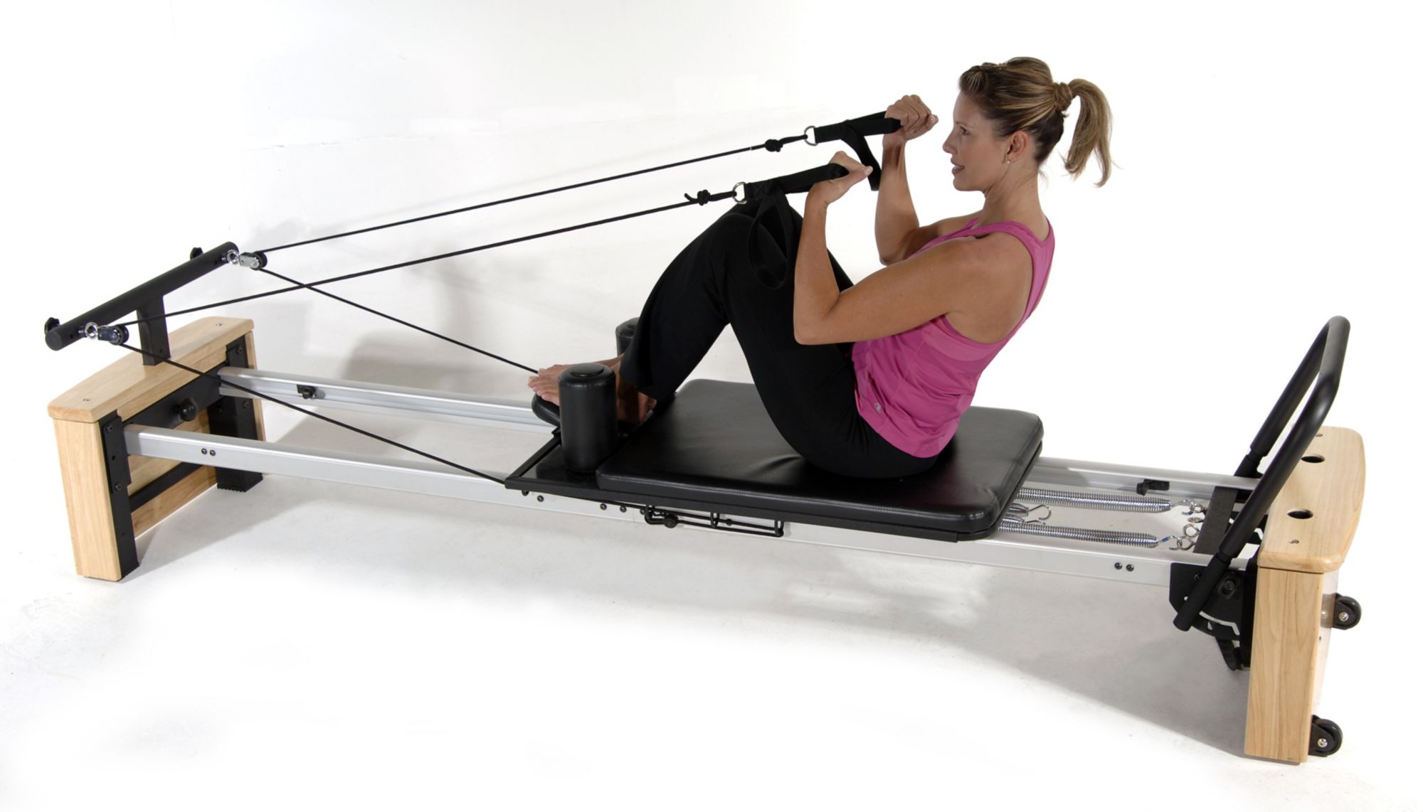 Provides a thorough and challenging workout at home Extra-long design offers a wide range of motion 15" elevation level allows for more advanced exercises 4 springs with different resistance levels Commercial-grade wheels for smooth carriage glide 3-position, adjustable foot bar Adjustable ropes, straps and hand grips Assembly required Includes Pilates exercise system Warranty: 90 days parts, 5 years frame
