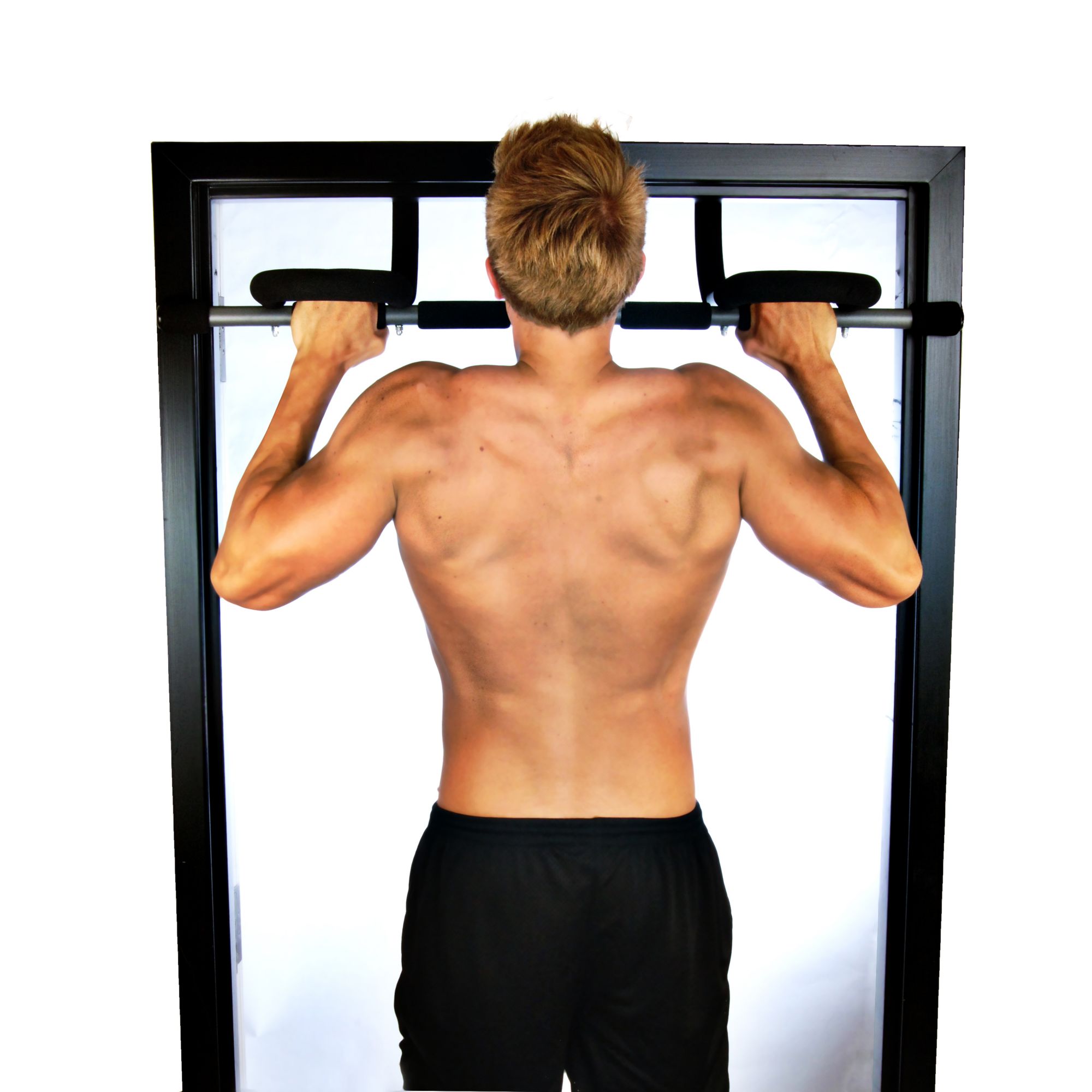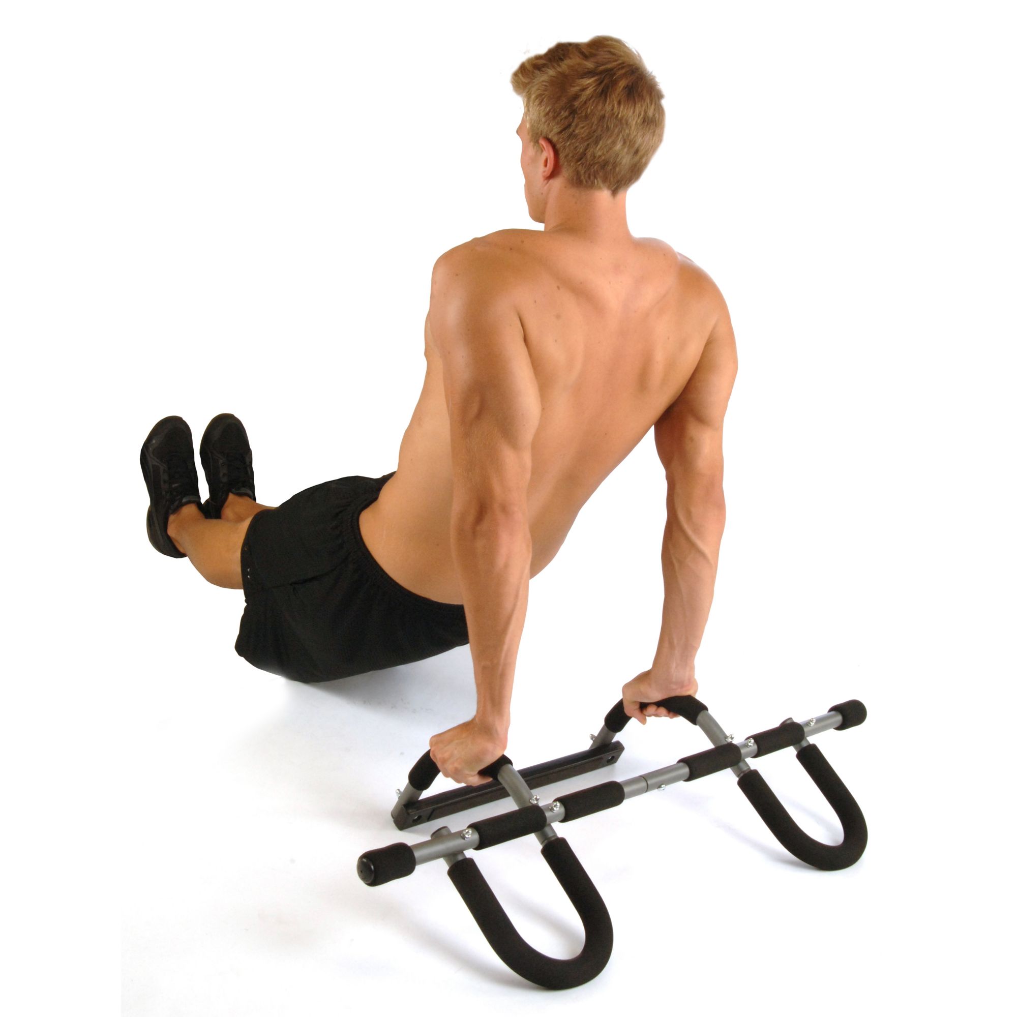 Provides you with a great upper-body workout Build and tone shoulder, back and arm muscles through pull-ups, tricep dips, push-ups and sit-ups Sturdy steel construction Thick padding and nonslip comfort grips 5 grip positions Fits most standard doorways Attaches to and removes from the doorframe easily Requires a sturdy doorframe with trim Assembly required Includes trainer Warranty: 3 years frame; 90 days parts