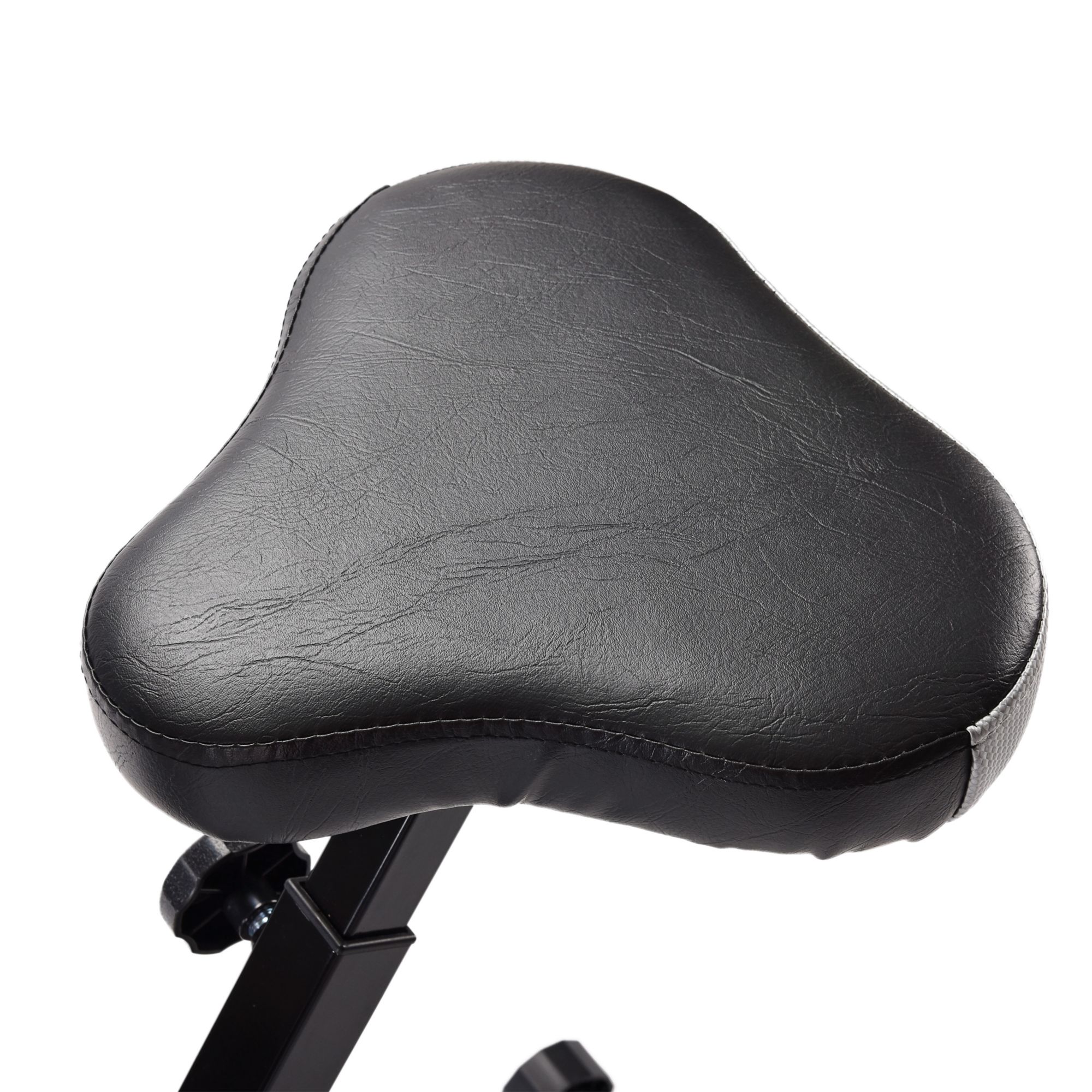 Enhanced relaxation. Comfort is enhanced on the Folding Exercise Bike 182 due to several elements. A wide, cushioned seat can be adjusted for height, making it a great fit for people of all shapes and sizes. Textured pedals and adjustable straps provide you with a greater level of security. For extra convenience, this bike also includes a built-in drink holder to stay hydrated and a device tray, allowing you to use a smartphone or tablet while pedaling.