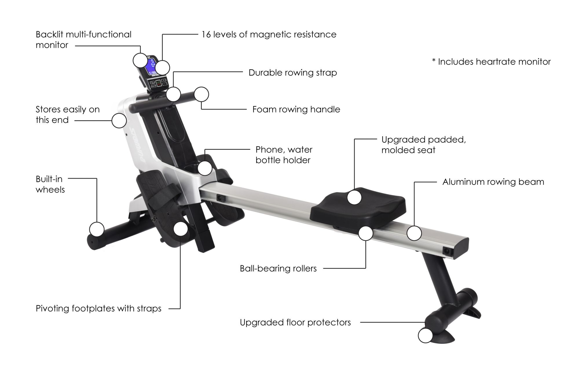 Great for in-home use while you spend time with family or watch TV 16 levels of smooth, quiet magnetic resistance provide an exhilarating, challenging rowing workout Aluminum rowing beam and ball-bearing rollers offer a smooth rowing stroke and smooth seat gliding Durable rowing strap Pivoting footplates with adjustable foot straps afford security and a full range of motion Premium padded, molded seat for comfort 13 workout programs include 9 preset programs and 4 user-generated programs Backlit, multifunctional workout monitor tracks total strokes, strokes per minute, workout time, distance and calories burned Heart rate chest strap syncs wirelessly with the monitor for convenient pulse tracking Assembly required Includes rowing machine and owner's manual Warranty: 3 years frame; 90 days parts