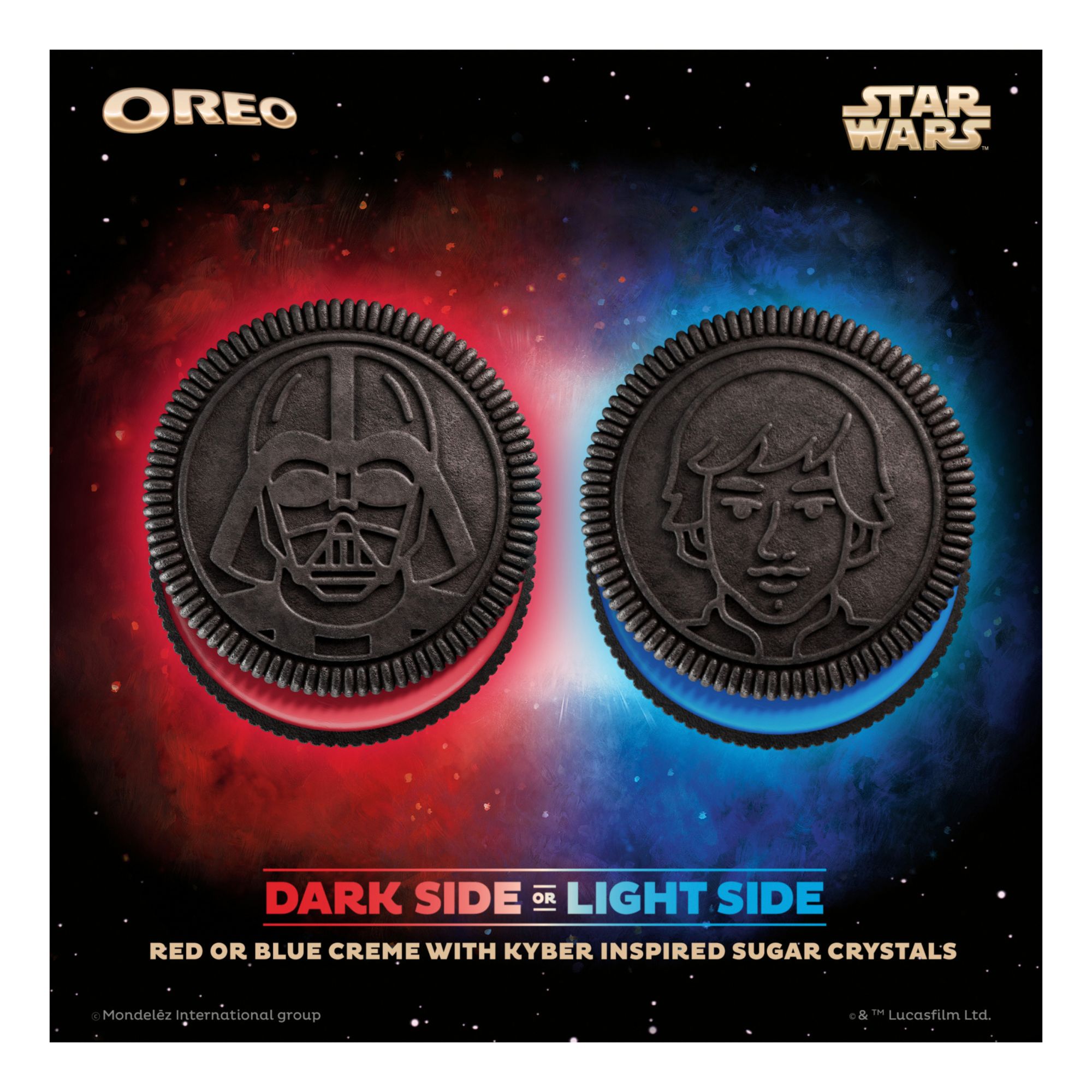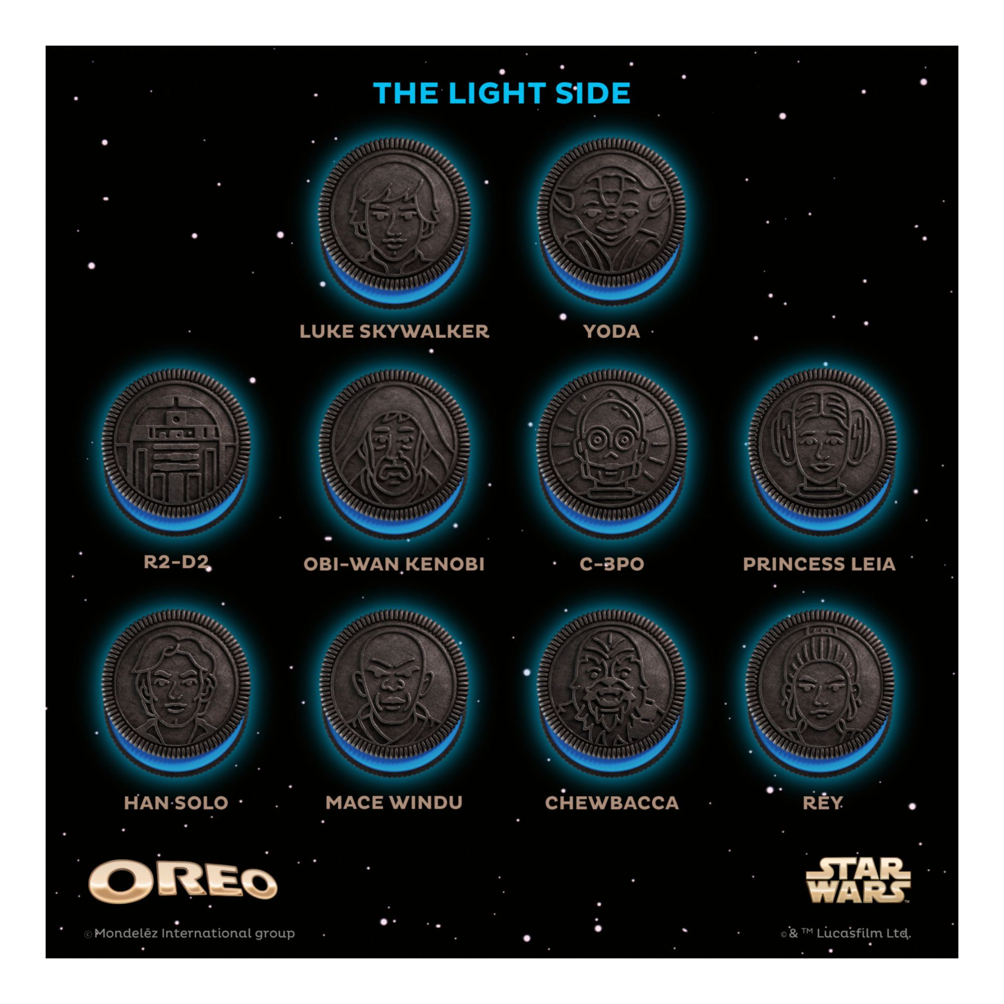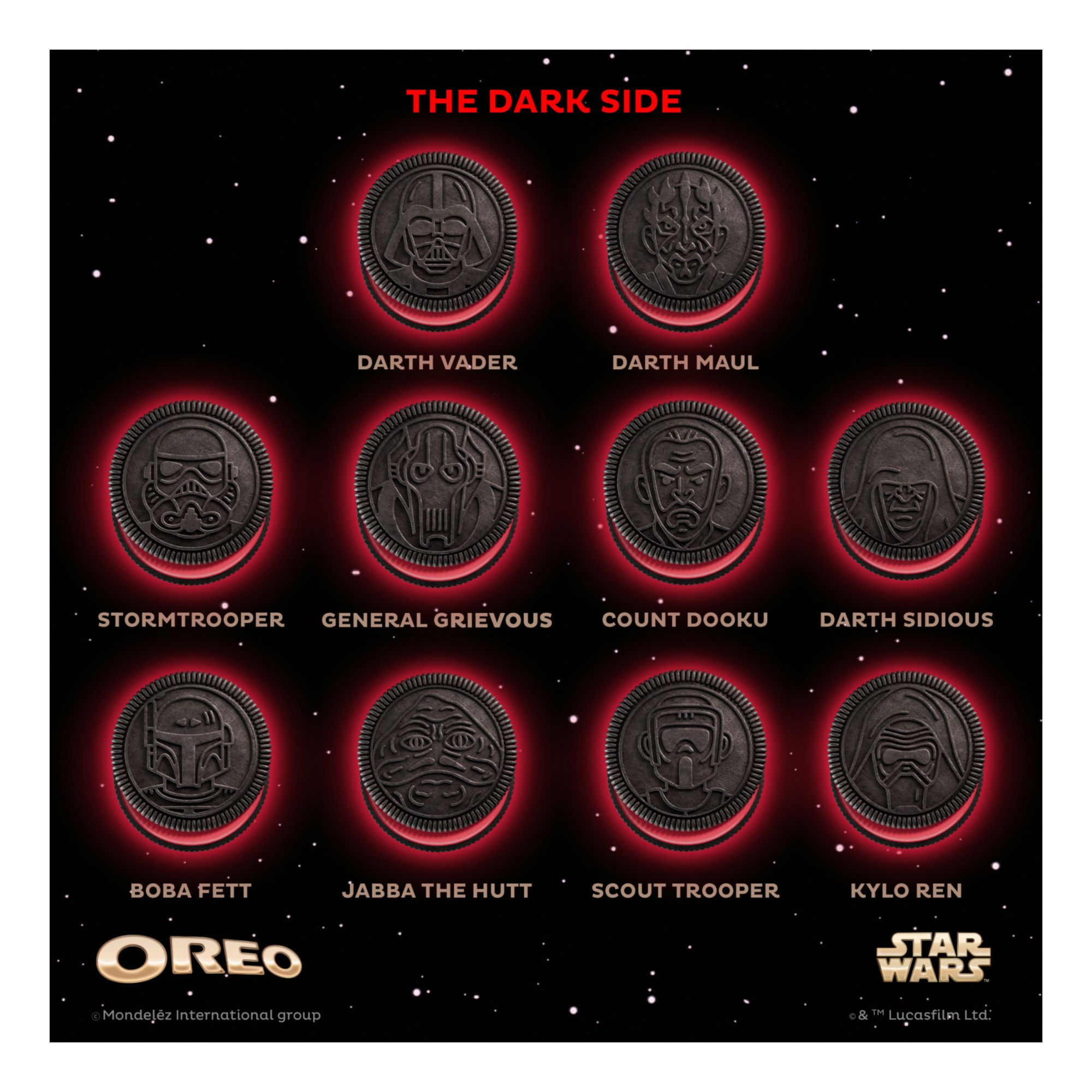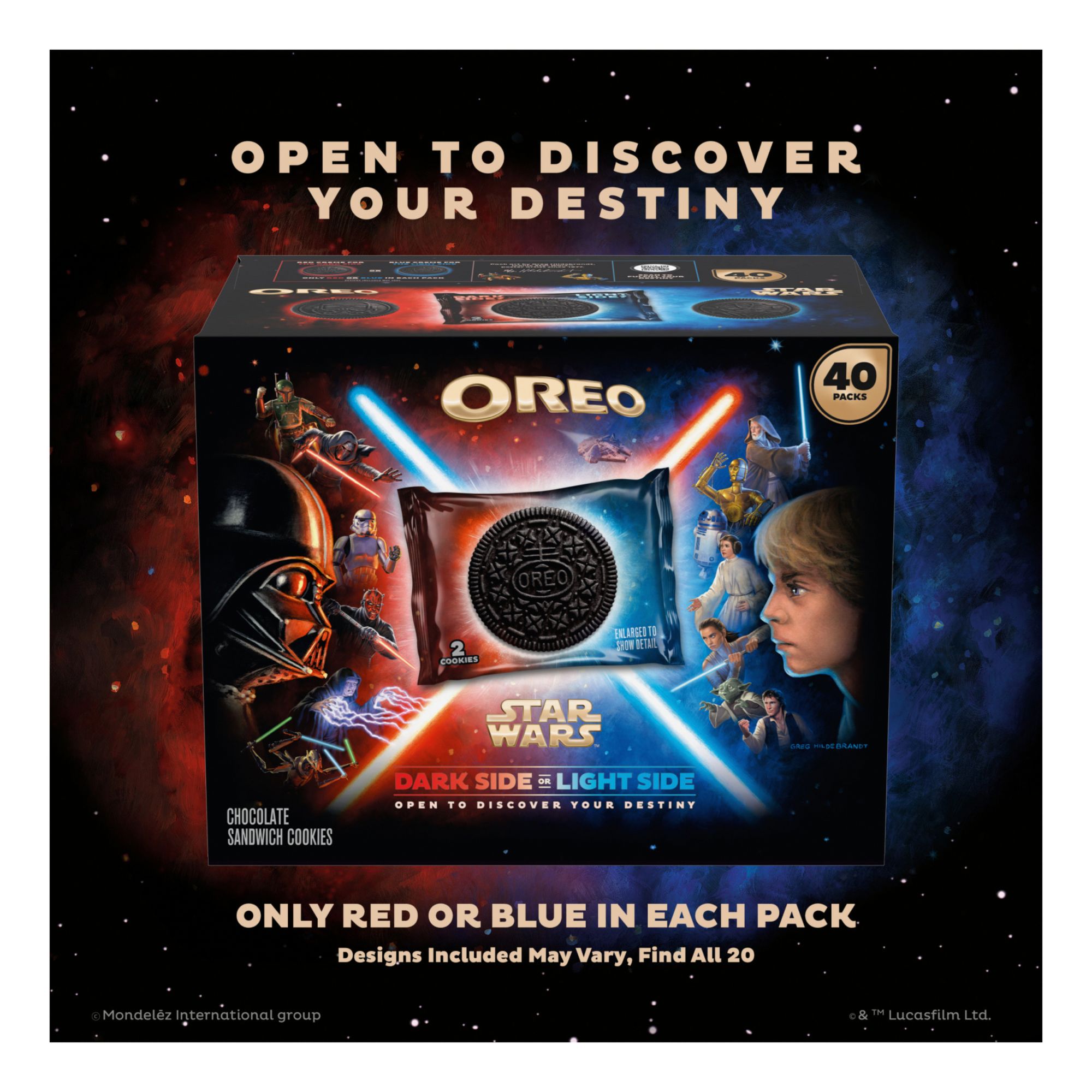 Oreo chocolate cookies embossed with a randomized assortment of 10 dark side or 10 light side Star Wars characters; search for all 20 designs (designs included may vary)