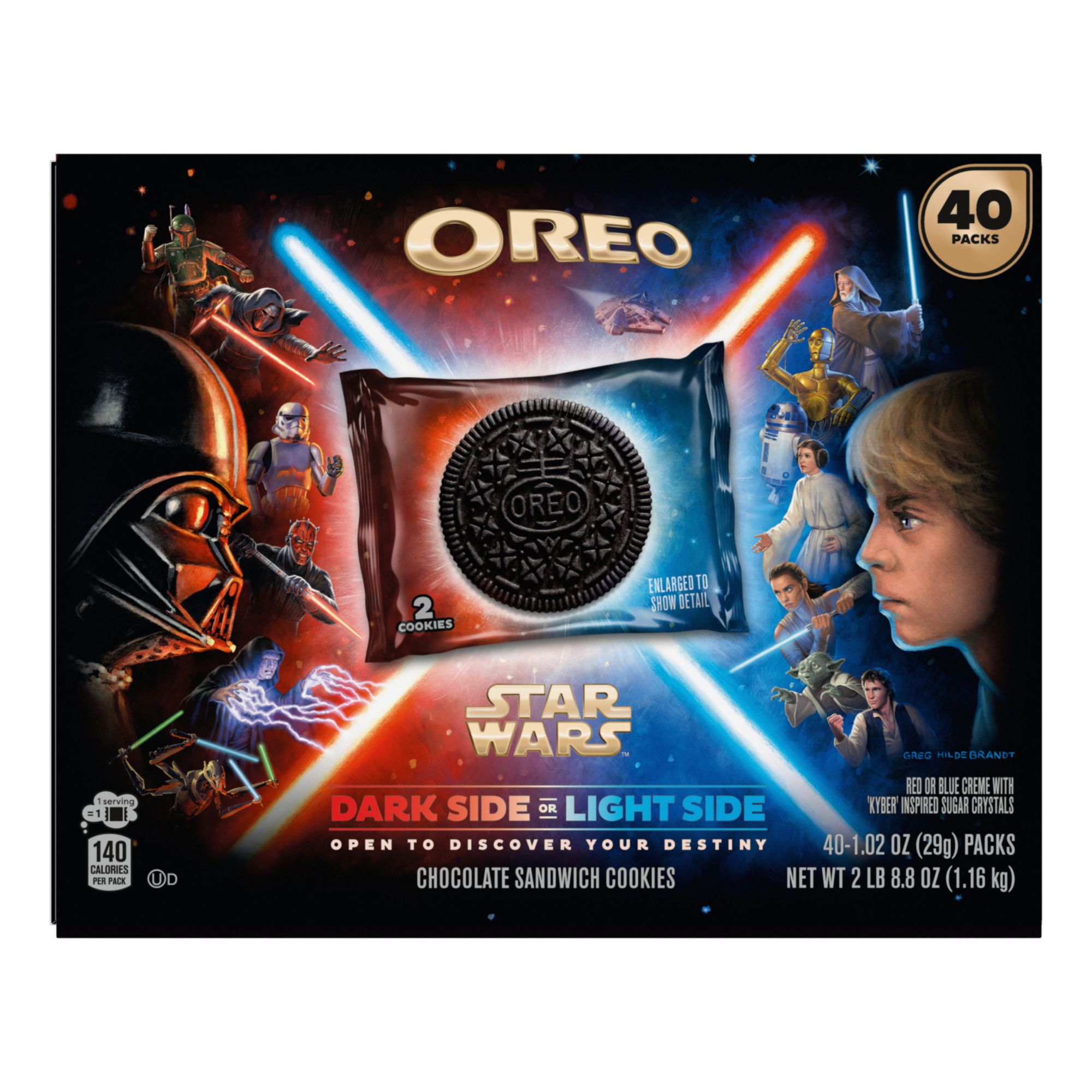Are you on the dark side or the light side? Open a pack of Star Wars Oreo Chocolate Sandwich Cookies to discover your destiny. These sweet snacks bring together two iconic brands in special edition snack cookies to surprise and delight. Available in two unique packs made with classic Oreo chocolate wafer cookies, each individually wrapped two-cookie snack pack has either dark side cookies with red creme or light side cookies with blue creme. Both cremes feature "Kyber" inspired sugar crystals, and the cookies are embossed with a randomized assortment of 10 dark side or 10 light side Star Wars characters like Darth Vader, Luke Skywalker, and Yoda (character designs may vary). Will you get dark or light side Oreo cookies? Open to discover your destiny, and look for all 20 designs. These tasty, fun snacks make wonderful birthday treats, party favors, or movie snacks for a Star Wars themed party or movie night. With packaging art by Greg Hildebrandt, iconic Star Wars poster artist since 1977, these special edition Star Wars Oreo cookies will be enjoyed across the galaxy! Scan the pack’s QR code to fulfill your destiny and continue the experience. With this bulk cookies box of 40 certified kosher Oreo cookie snack packs, you’ll be ready for any snacking occasion.
