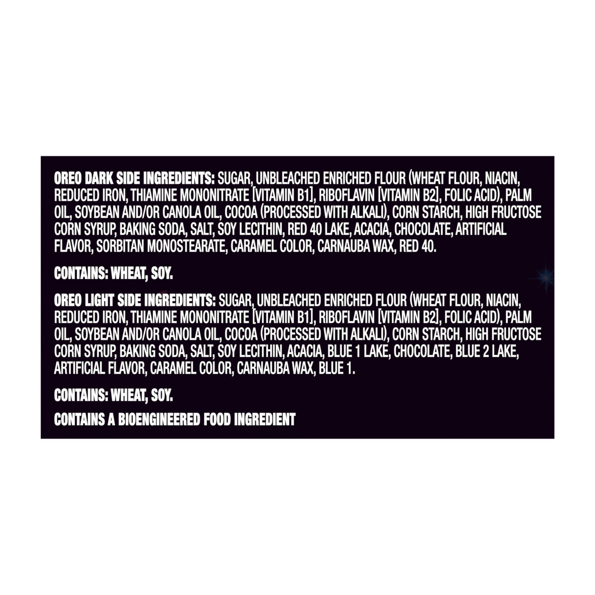 Ingredients: Oreo Dark Side Ingredients: Sugar, Unbleached Enriched Flour (Wheat Flour, Niacin, Reduced Iron, Thiamine Mononitrate [Vitamin B1], Riboflavin [Vitamin B2], Folic Acid), Palm Oil, Soybean And/or Canola Oil, Cocoa (Processed With Alkali), Corn Starch, High Fructose Corn Syrup, Baking Soda, Salt, Soy Lecithin, Red 40 Lake, Acacia, Chocolate, Artificial Flavor, Sorbitan Monostearate, Caramel Color, Carnauba Wax, Red 40. Oreo Light Side Ingredients: Sugar, Unbleached Enriched Flour (Wheat Flour, Niacin, Reduced Iron, Thiamine Mononitrate [Vitamin B1], Riboflavin [Vitamin B2], Folic Acid), Palm Oil, Soybean And/or Canola Oil, Cocoa (Processed With Alkali), Corn Starch, High Fructose Corn Syrup, Baking Soda, Salt, Soy Lecithin, Acacia, Blue 1 Lake, Chocolate, Blue 2 Lake, Artificial Flavor, Caramel Color, Carnauba Wax, Blue 1. Contains: Wheat, Soy.